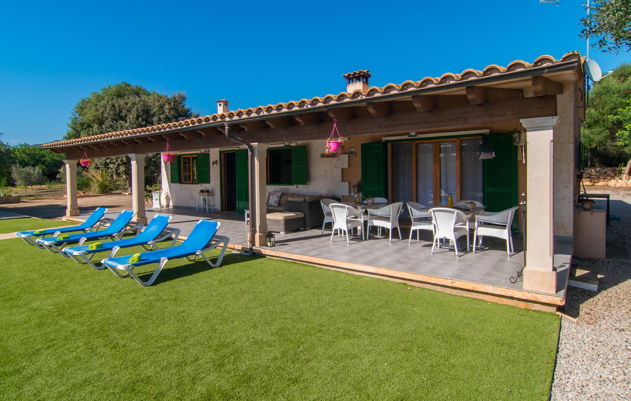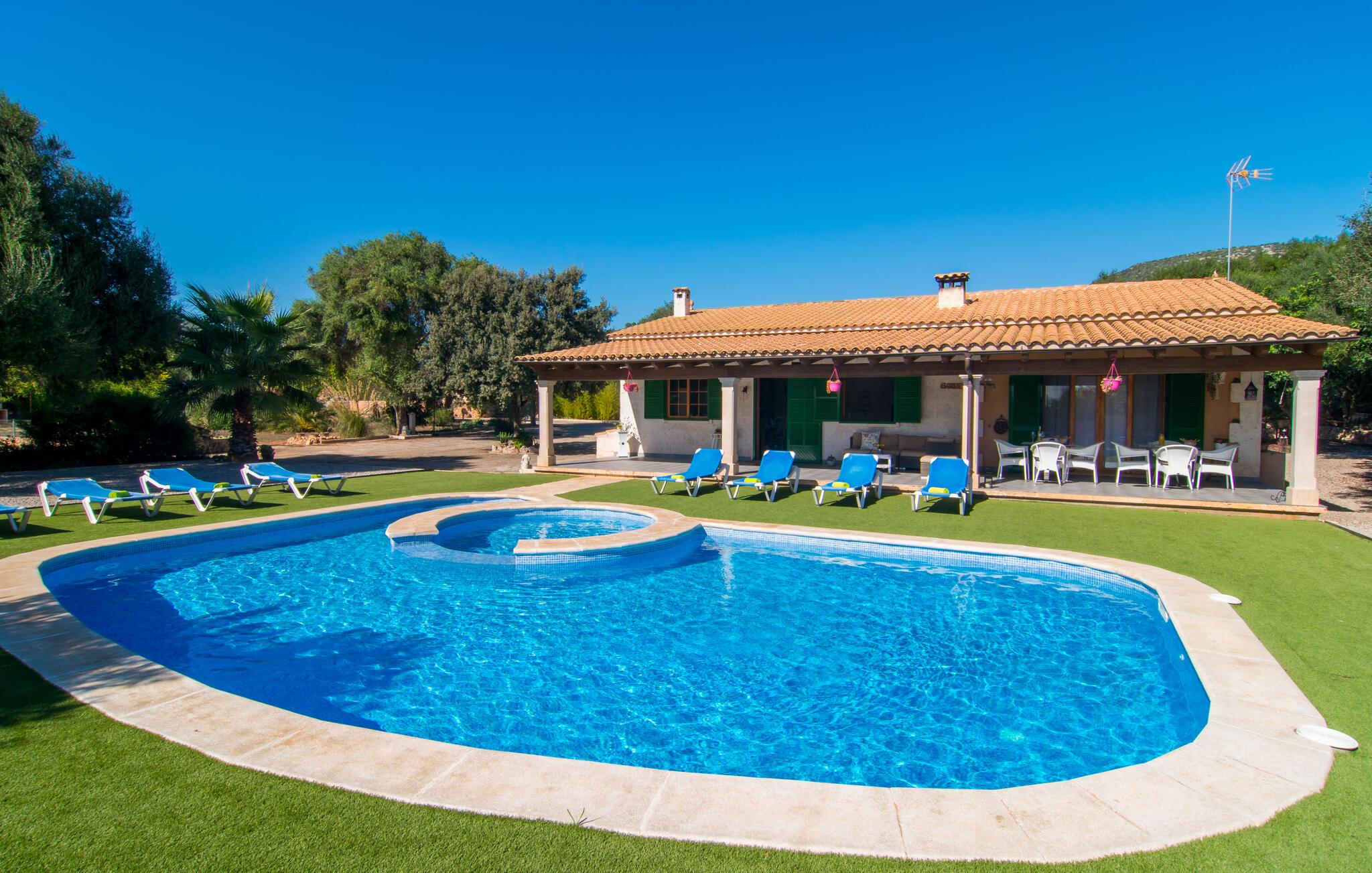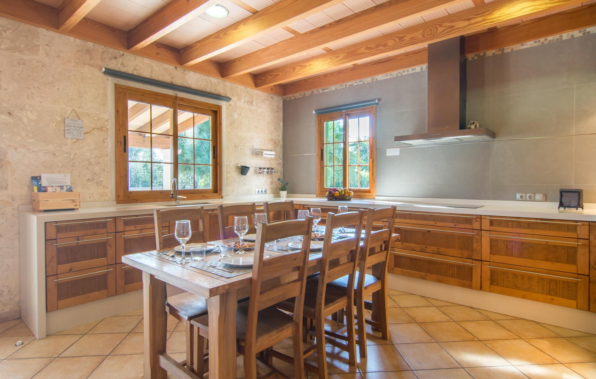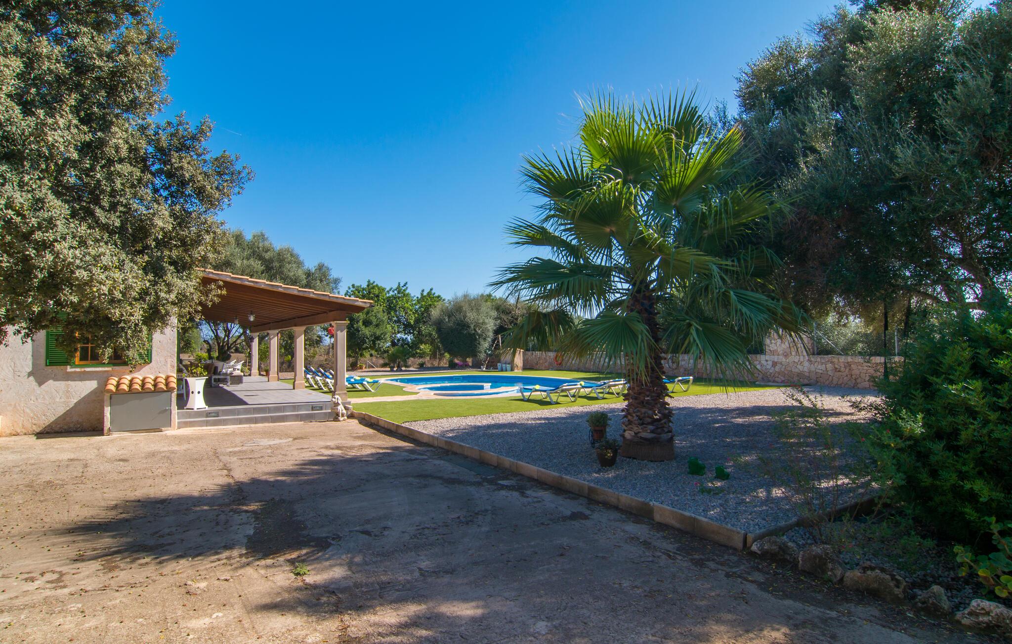 Nyd en ferie i et feriehus med pool i en smuk beliggenhed. Velkommen til dette indbydende og komfortable hus, hvor I vil føle jer hjemme fra dag ét. Glæd jer til lyse, attraktivt møblerede værelser med neo-rustik charme. Slap af under tunge trælofter på den rummelige sofa og skab en hyggelig atmosfære med ild i pejsen. Slap af udendørs; den rummelige grund byder på masser af plads til leg og afslapning. Svøm i poolen, spil basketball og bordtennis. Om aftenen kan I nyde kolde drikkevarer under åben himmel og snakke længe om jeres oplevelser bagefter. Kør til havet og nyd stranden og solen. Maleriske stier gennem olivenlunde, bølgende bakker og fyrreskove starter lige uden for døren. Uanset om I er til fods eller på cykel, kan I opdage den uberørte skønhed i det mallorcanske bagland. Slentr gennem Palmas gamle bydel, beundr den imponerende La Seu-katedral og gennemse stilfulde butikker.