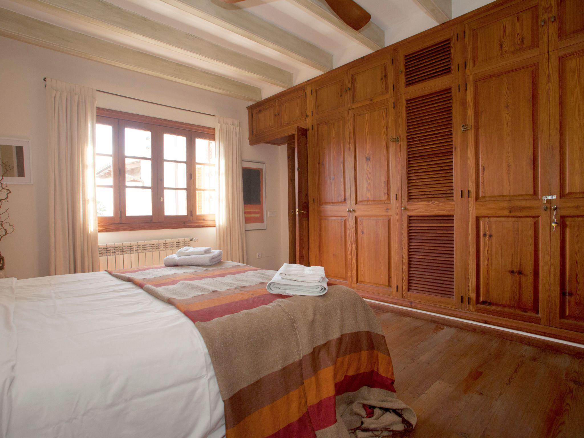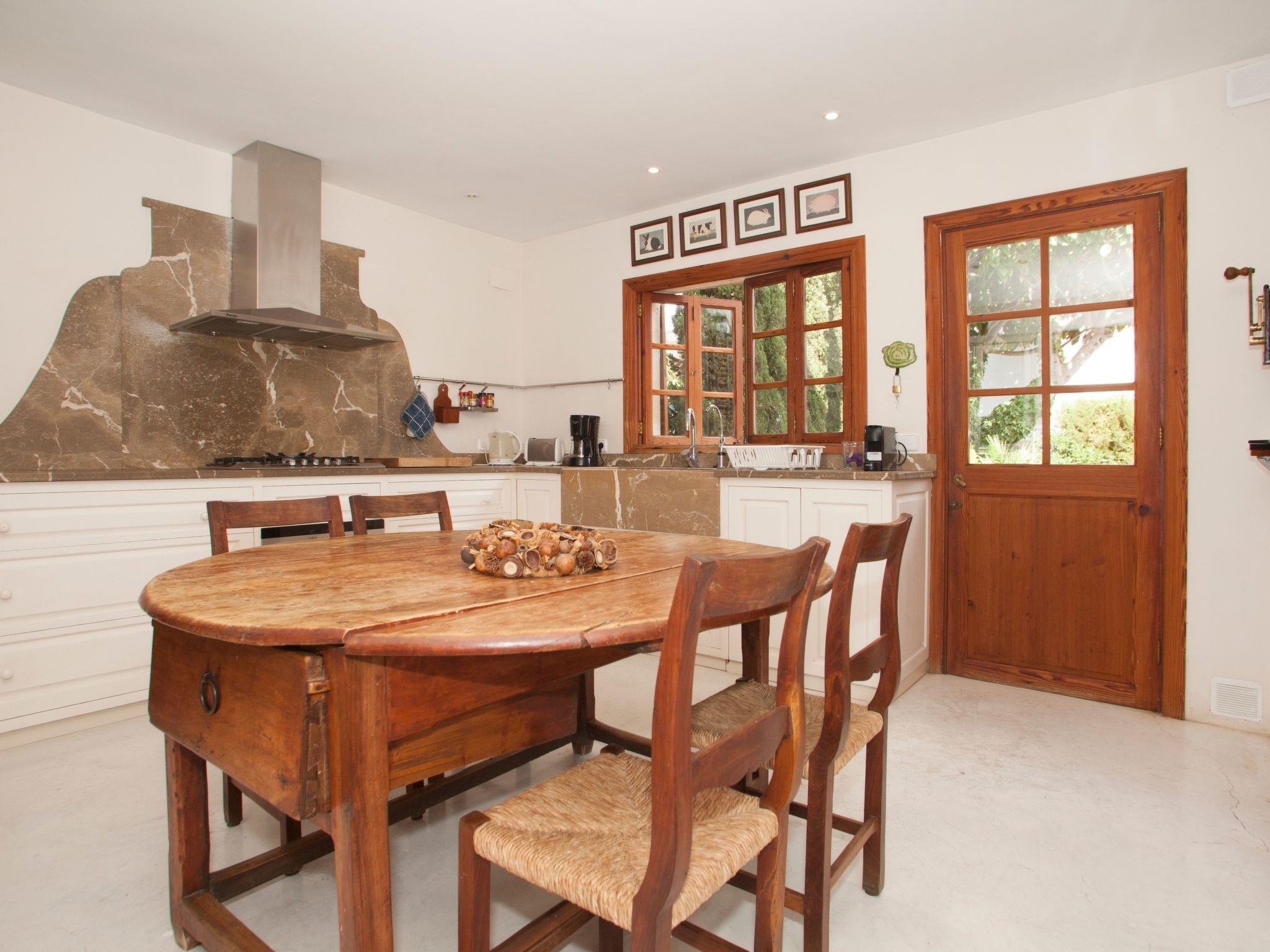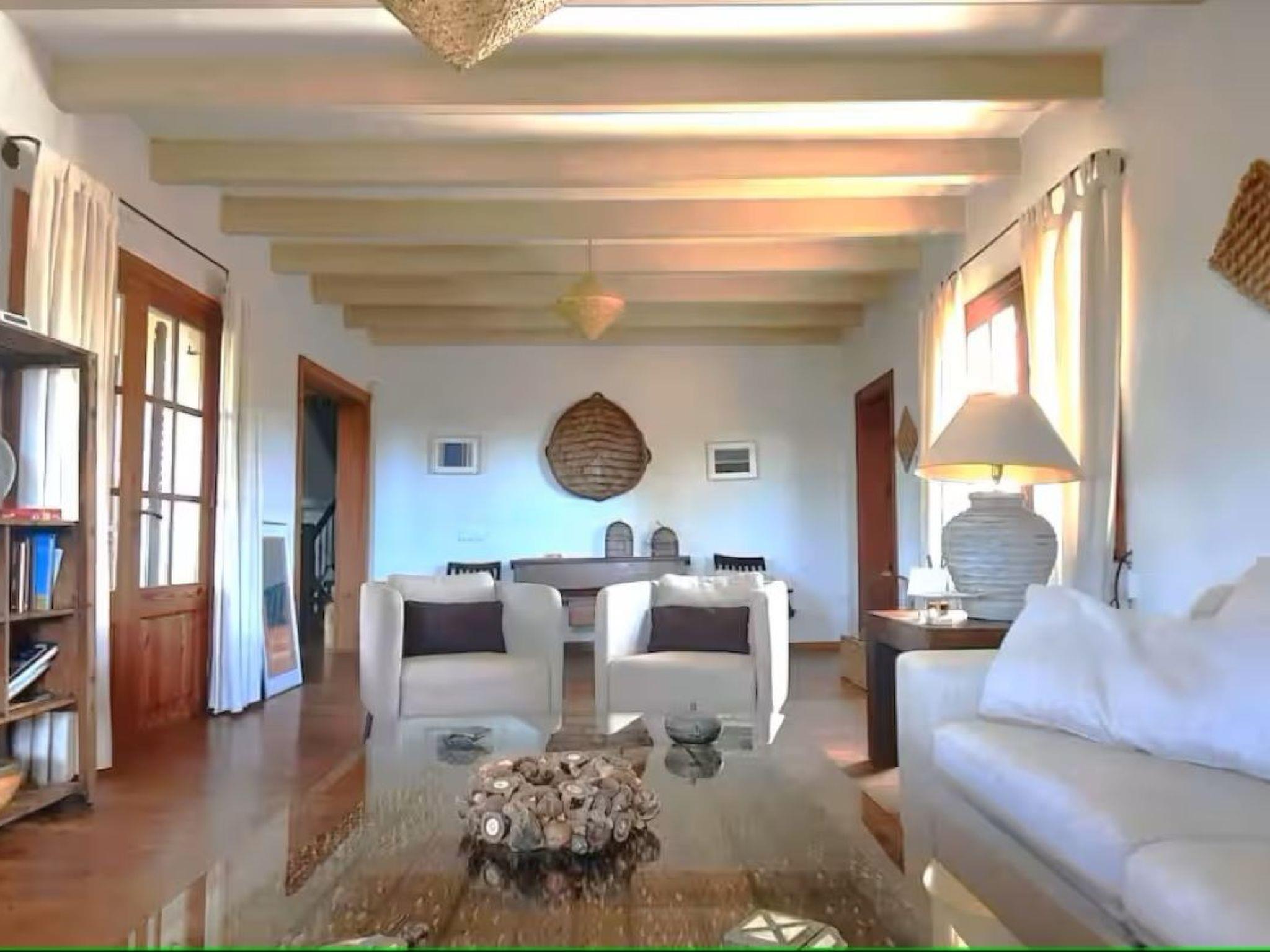 The interior of the villa exudes Mallorquin charm, elegantly fused with rustic decorations that create a warm and inviting atmosphere. Real wooden flooring runs throughout the property, which is spread over three floors. It features a comfortable living room for relaxation, a well-equipped kitchen with a large solid wood table at its heart, and an adjoining dining area located on a covered terrace with views over the pool. With 5 bedrooms and 3 bathrooms, the villa comfortably accommodates up to 9 guests, making it ideal for families or groups seeking quality time together. For those with little ones, Wi-Fi, a baby cot, a child's bed, and a highchair are readily available, ensuring a stress-free stay.