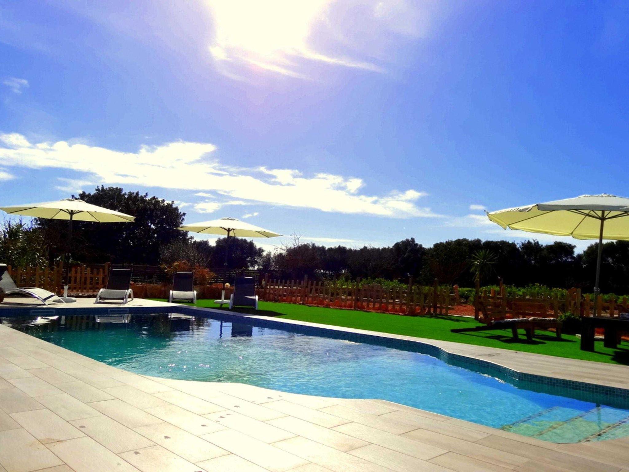 Im Außenbereich befindet sich der eingezäunte private Pool zur alleinigen Nutzung sowie ein Außenbad mit Dusche. Sonnenliegen stehen für alle Gäste zur Verfügung.