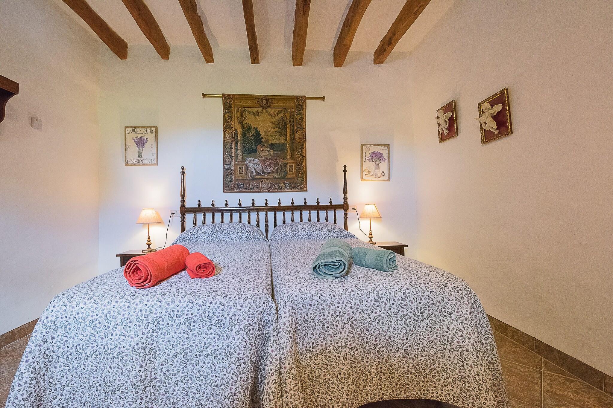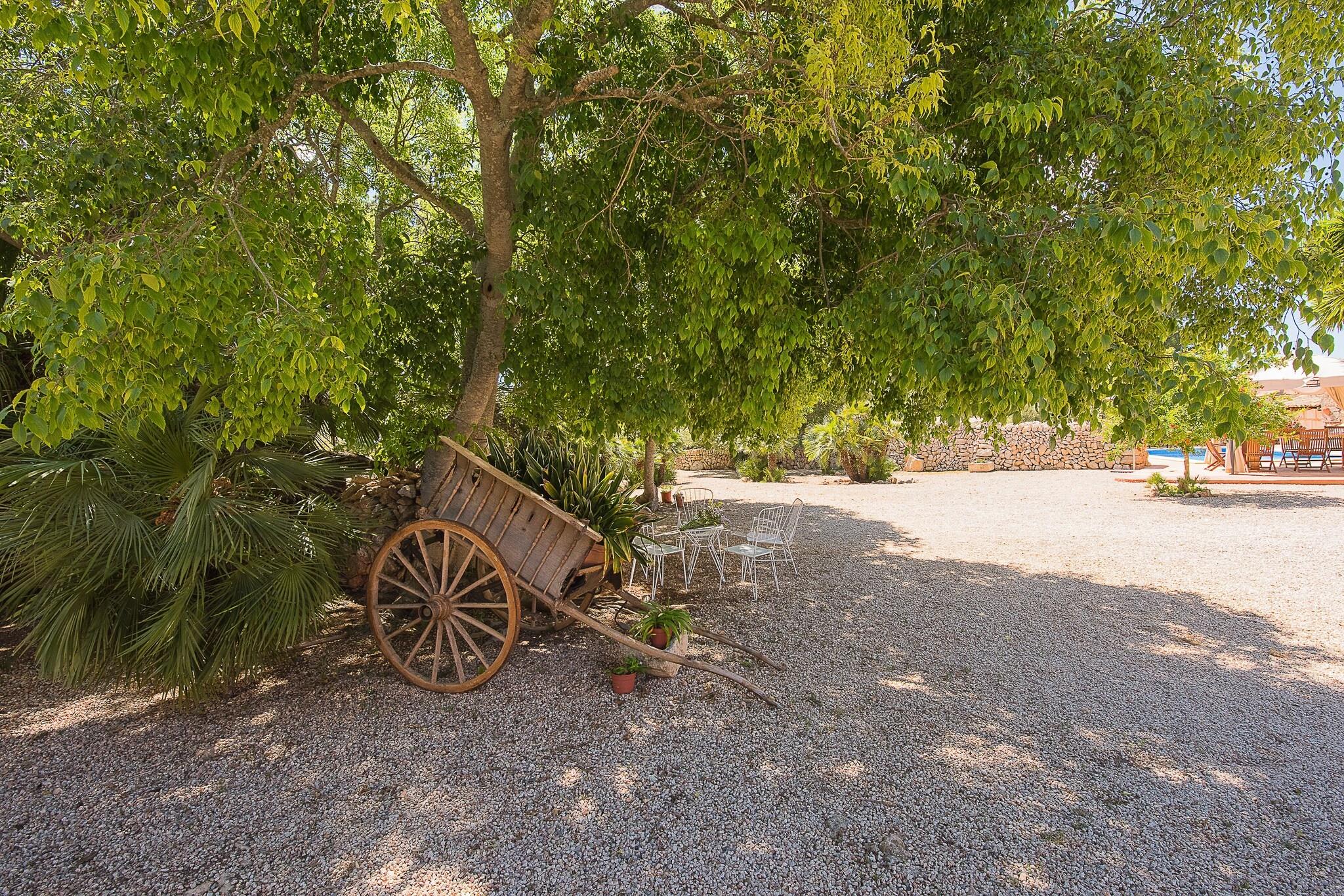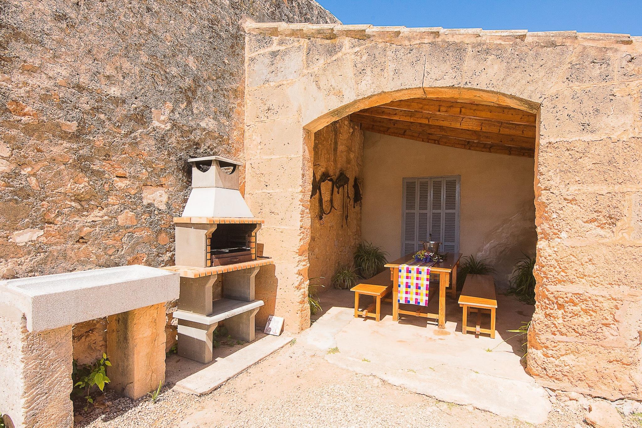 Son Caldes er et charmerende 500 år gammelt mallorcansk landskab, der blander historisk charme med moderne komfort for en uforglemmelig ferie. Denne velbevarede "besiddelse" har tre en-suite soveværelser, en rummelig stue, spiseplads og et fuldt udstyret køkken, hvilket gør det ideelt for familier eller grupper. Hvert af de fire soveværelser har aircondition, hvilket sikrer komfort under varme nætter. Ejendommen kombinerer antikke møbler med moderne bekvemmeligheder, herunder centralvarme og en unik vinkælder med håndlavede tønder over 200 år gamle. Beliggende nær Llucmajor, er huset kun 1,5 km fra byen, som byder på markeder, butikker, barer og restauranter. Smukke strande som Cala Pi og Es Trenc er 12 km væk, og Palmas centrum er kun 15 km, hvilket giver adgang til pulserende byattraktioner. Den nærliggende Son Antem-golfbane ligger 17 km fra huset, og offentlig transport er tilgængelig med et busstoppested 1,5 km væk og Palmas togstation 20 km væk. Udenfor tilbyder en stor terrasse med pool, liggestole og al fresco spisepladser et afslappende sted at nyde middelhavssolen. Den omkringliggende skov giver en fantastisk udsigt over landskabet. En anden to-etagers bygning omfatter et soveværelse på loftet, opholdsstue og køkken til ekstra gæsteplads. Ejendommen har parkering til fire biler. Bemærk venligst, at kæledyr ikke er tilladt, og ejendommen er ikke egnet til gæster under 25 år, medmindre de er ledsaget af familie.