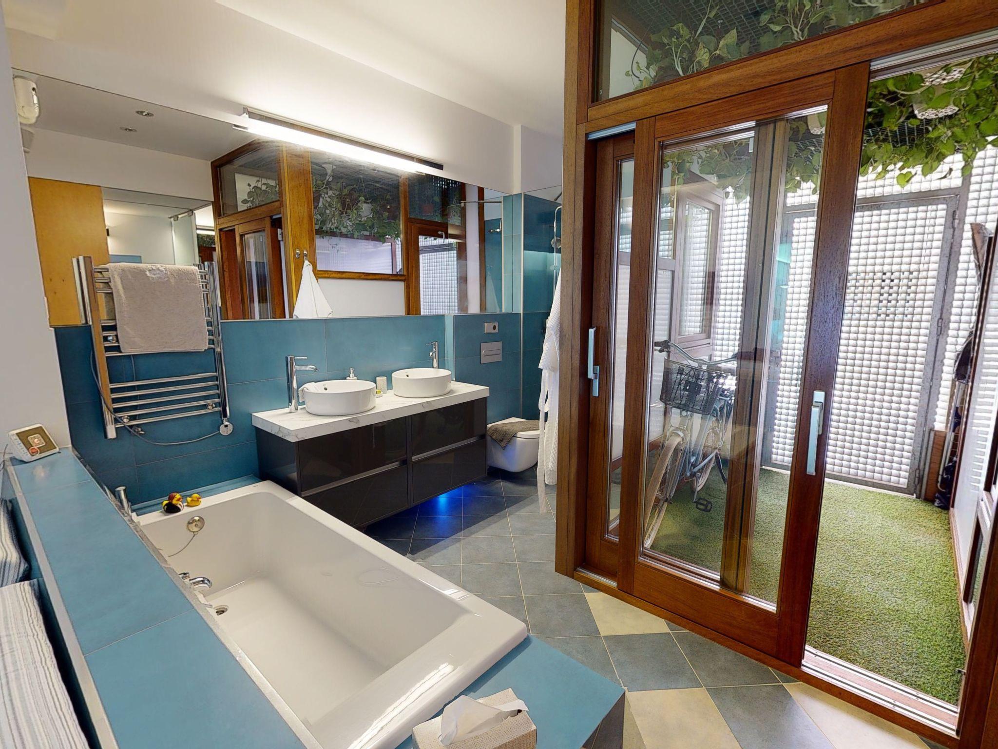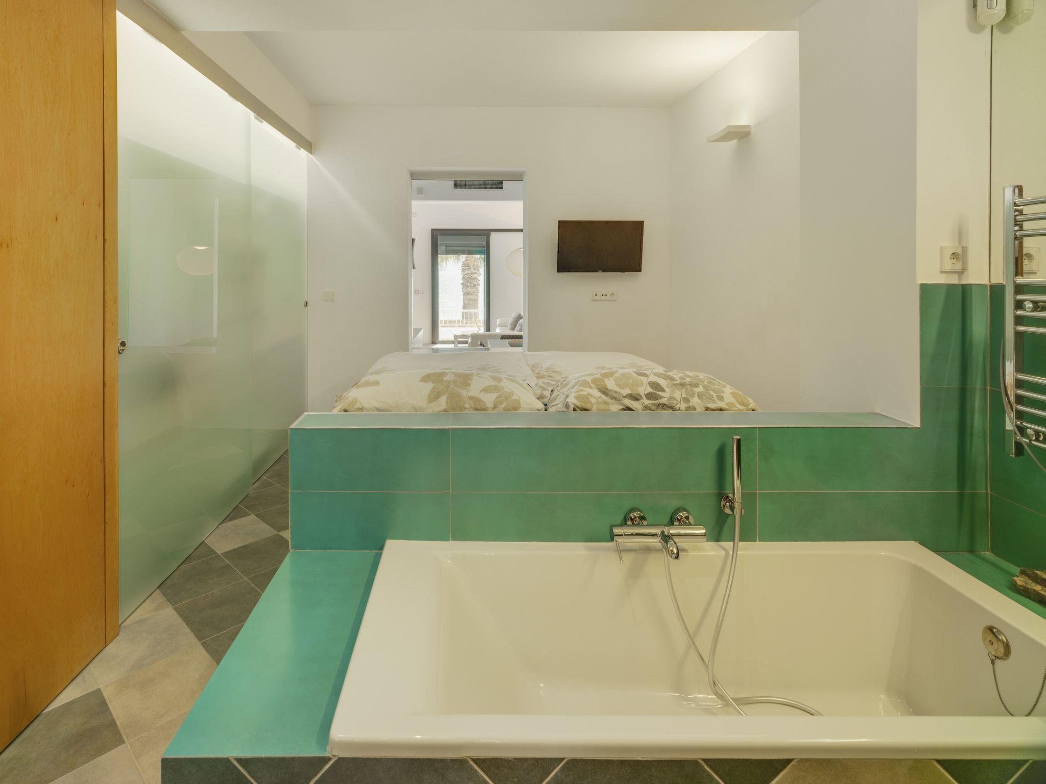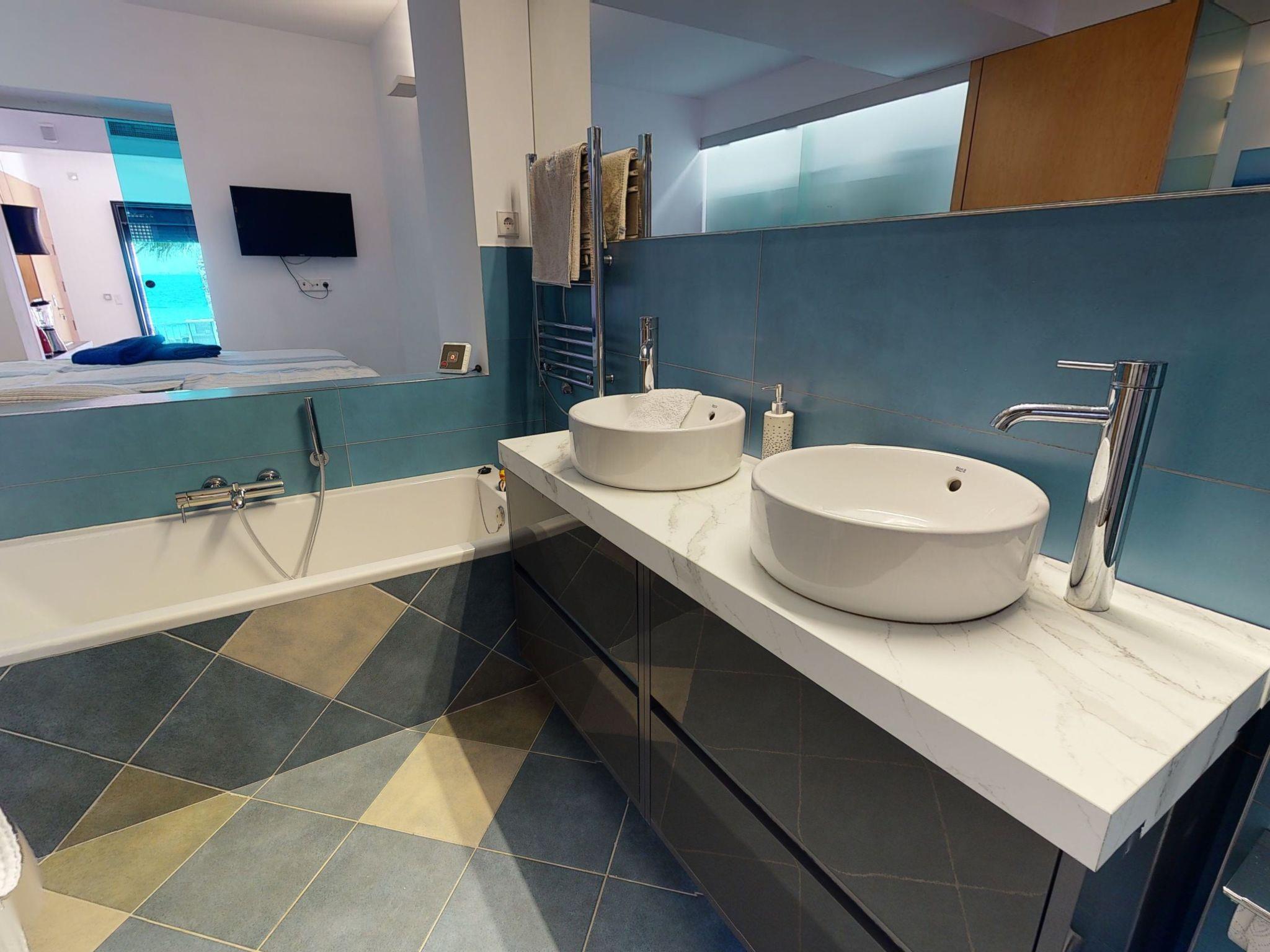 The master bedroom has an en-suite bathroom with two washbasins, shower and bathtub and a walk-in wardrobe. Two further guests share a sofa bed and a separate bathroom with shower and WC.