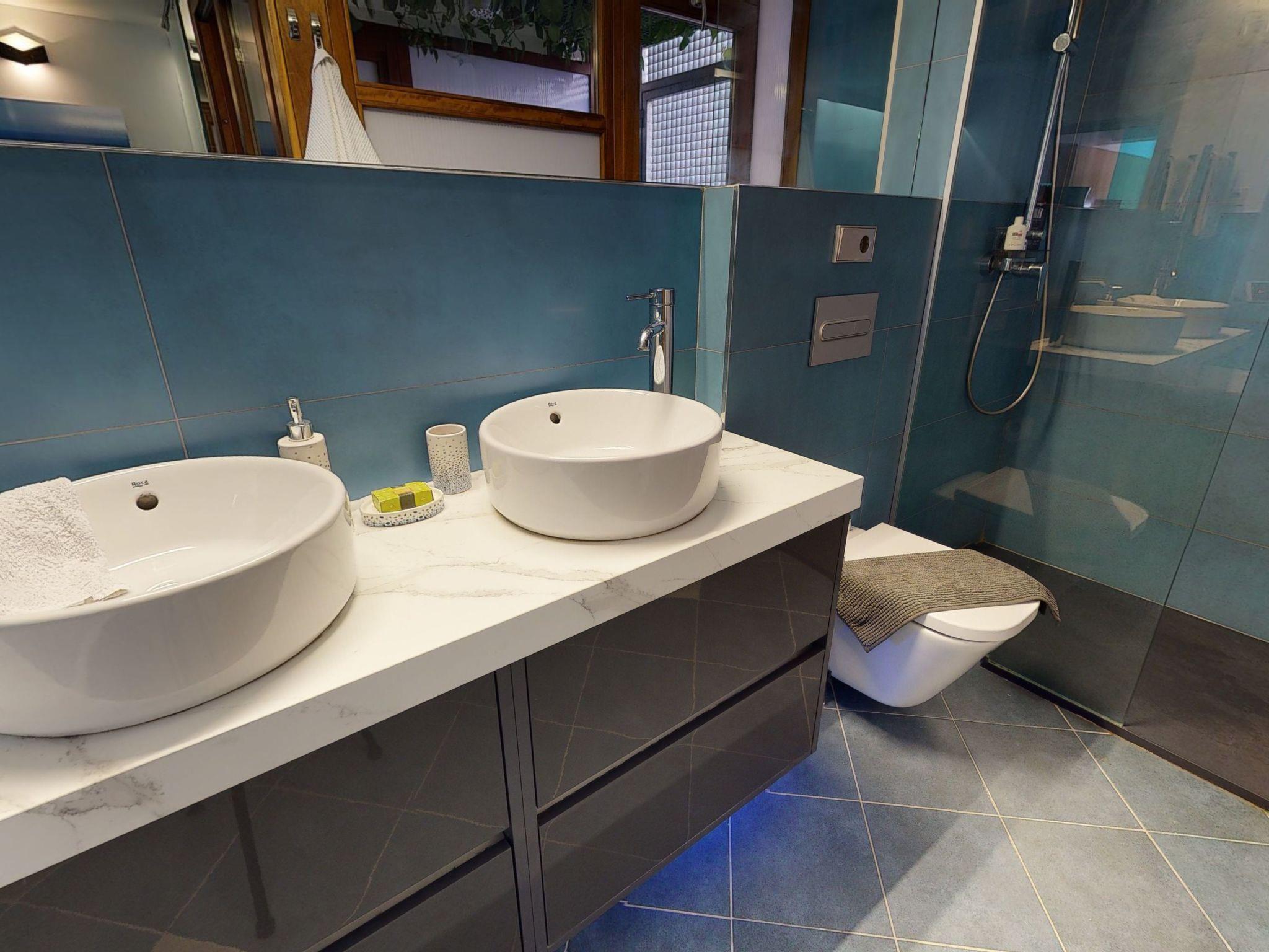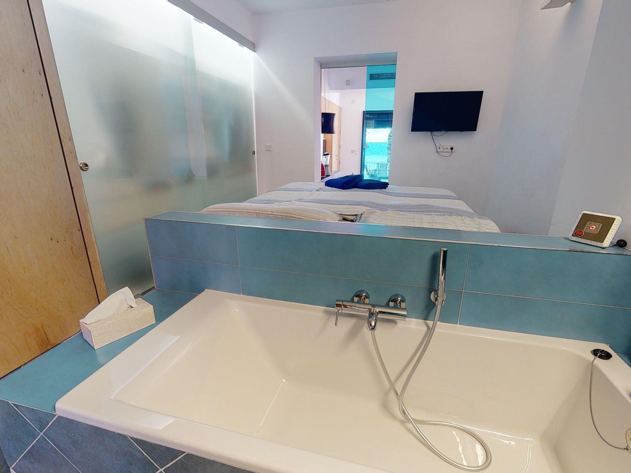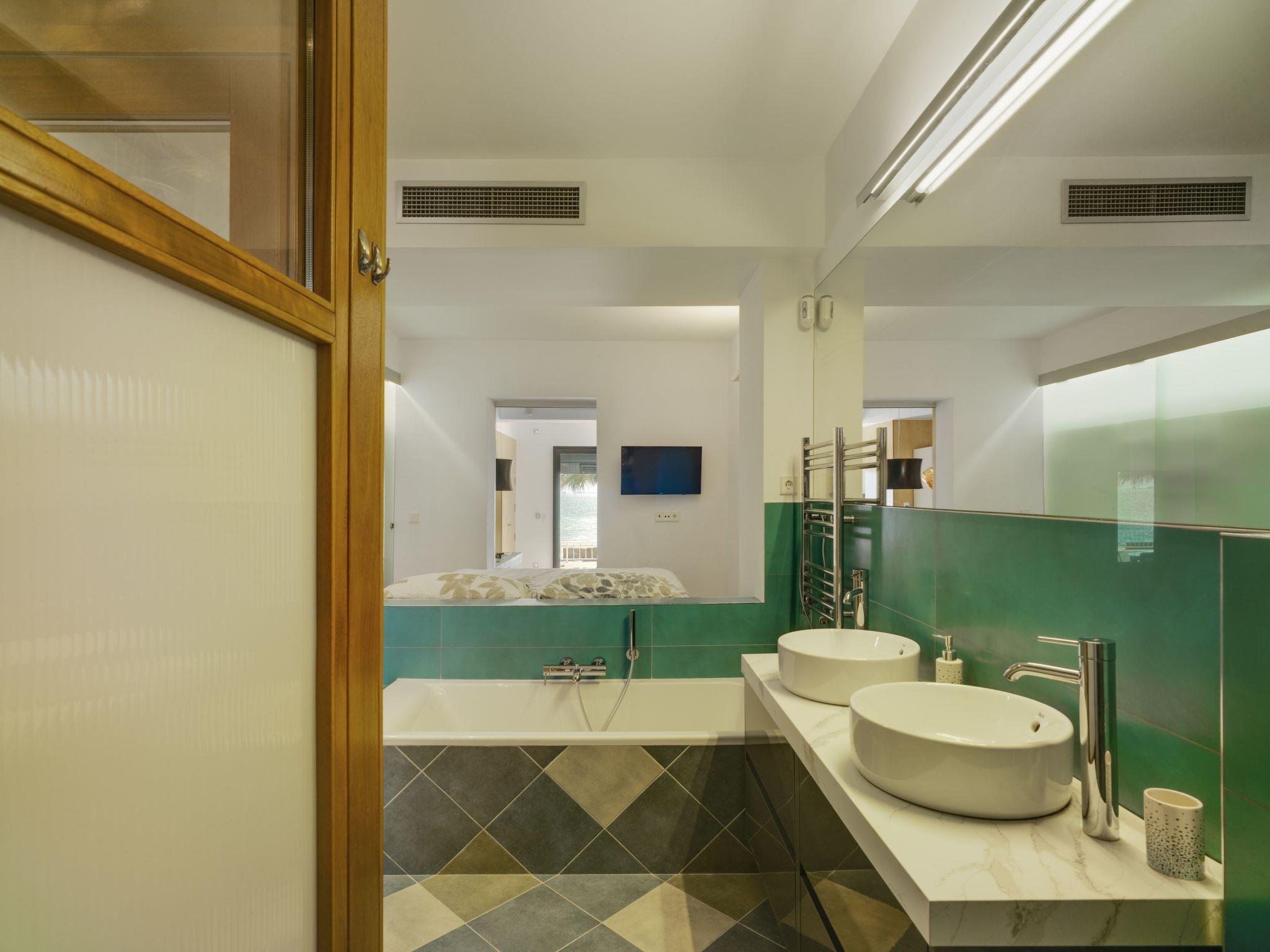 The master bedroom has an en-suite bathroom with two washbasins, shower and bathtub and a walk-in wardrobe. Two further guests share a sofa bed and a separate bathroom with shower and WC.