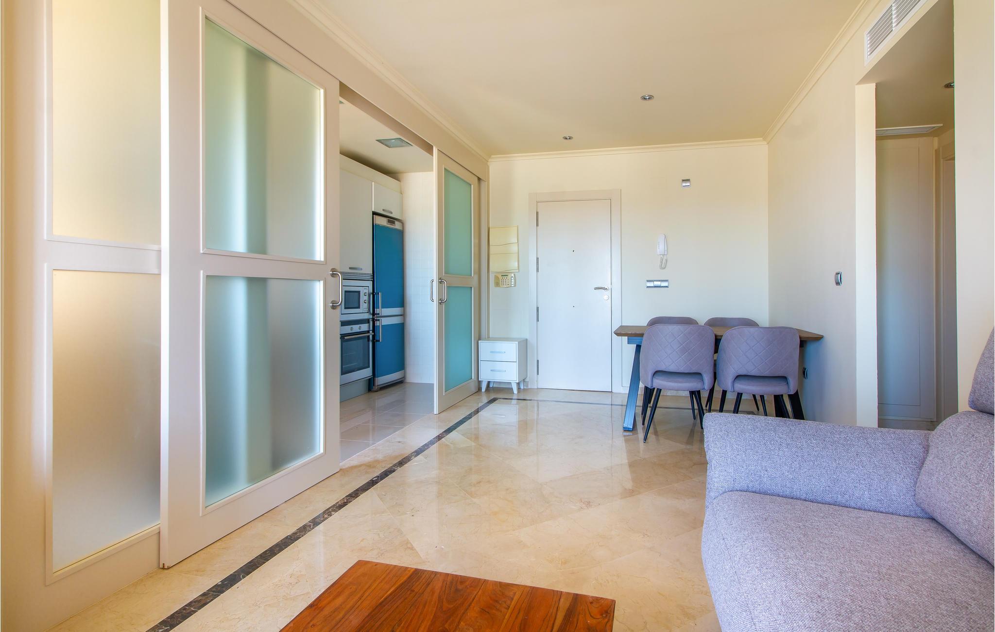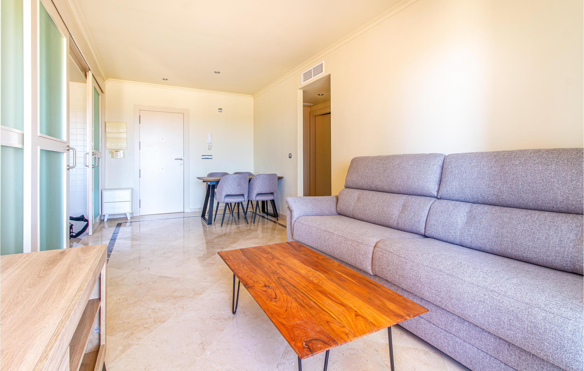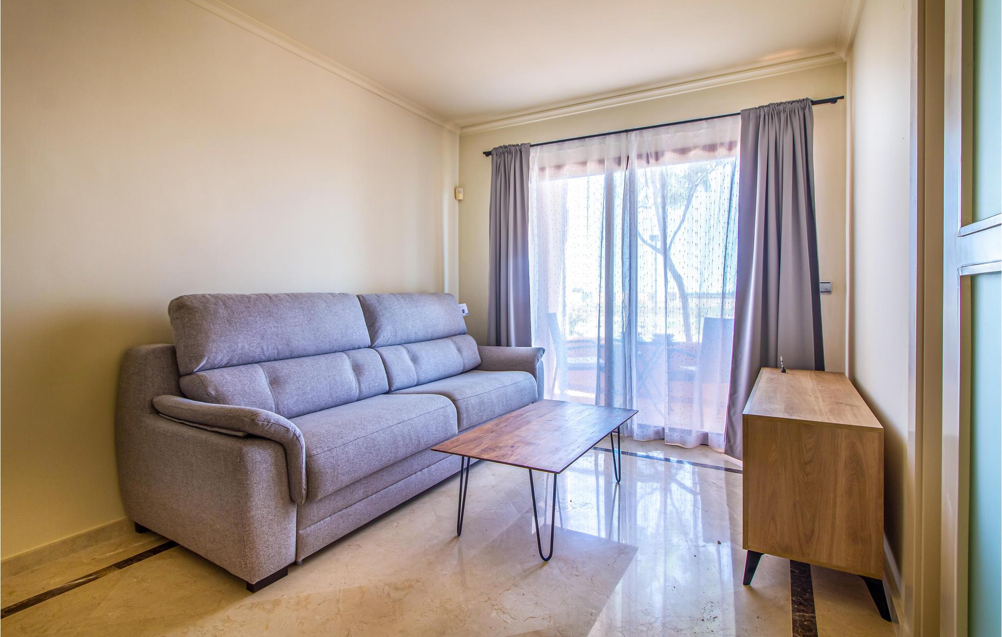 Lejlighedens boligareal er opdelt i et soveværelse, et badeværelse, en spisestue og en stue med køkken. Udstyret med WiFi, klimaanlæg og kvalitetsapparater, sørger for høj komfort. Begynd dagen med en kop kaffe på lejlighedens balkon og nyd udsigten eller planlæg dagens aktiviteter.