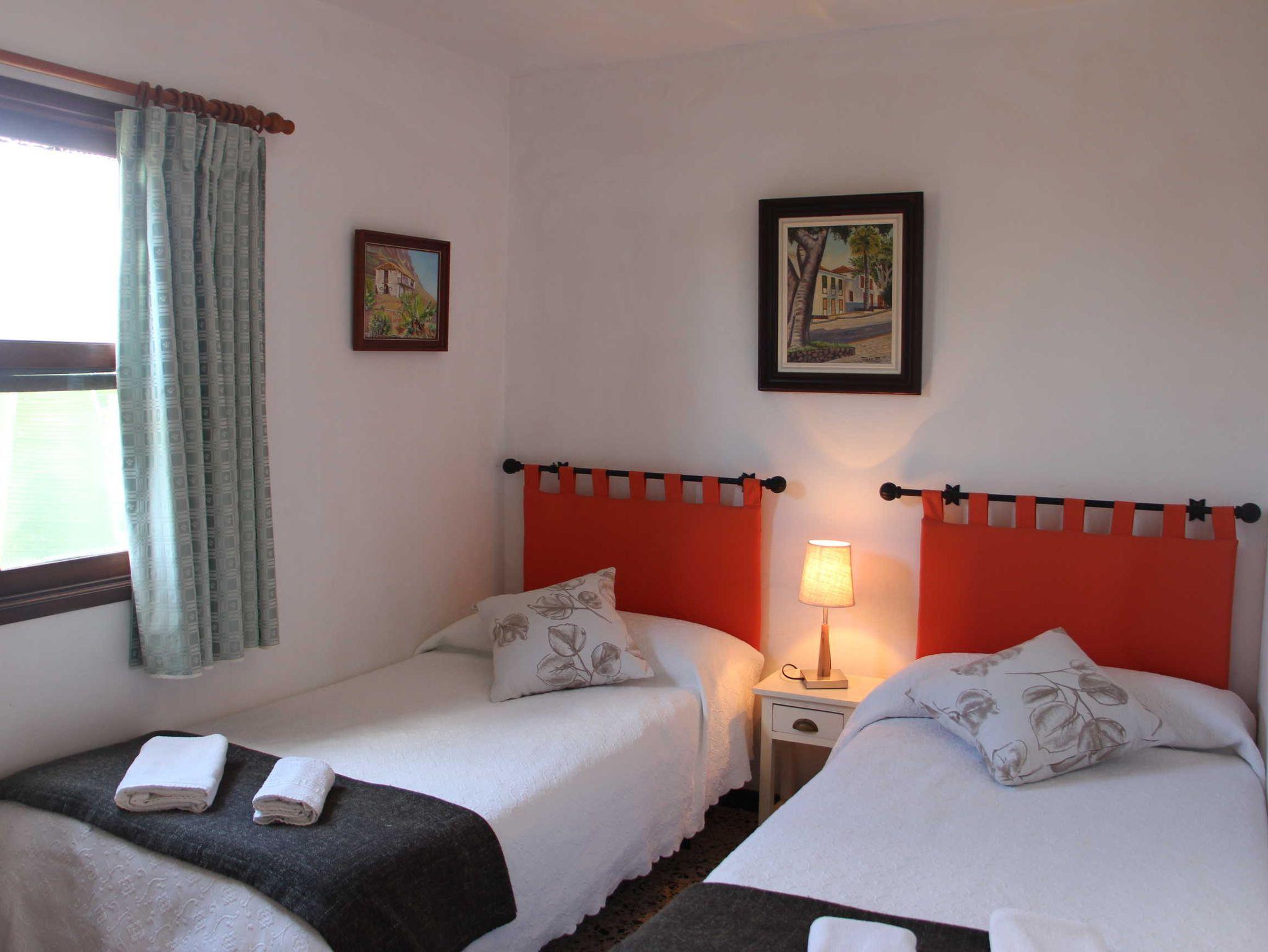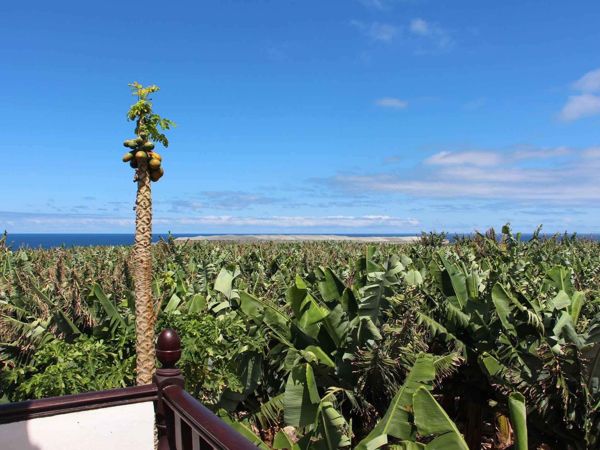 Von Außen gelangt man über eine Treppe in den oberen Teil des Hauses. Dies ist günstig, wenn Sie zum Beispiel mit einem befreundeten Paar oder mit Ihren schon großen Kindern kommen. Die obere Etage bietet Blick über die Bananen auf den Atlantik. Sie ist ebenfalls mit kombiniertem Wohn-/Essbereich und Einbauküche sowie Schlafzimmer mit zwei Einzelbetten und einem separaten Bad mit Dusche/WC ausgestattet. Ein großes, rundes Fenster sowie eine große Fensterfront zum Meer verleihen dem Wohnbereich ein besonderes Flair.