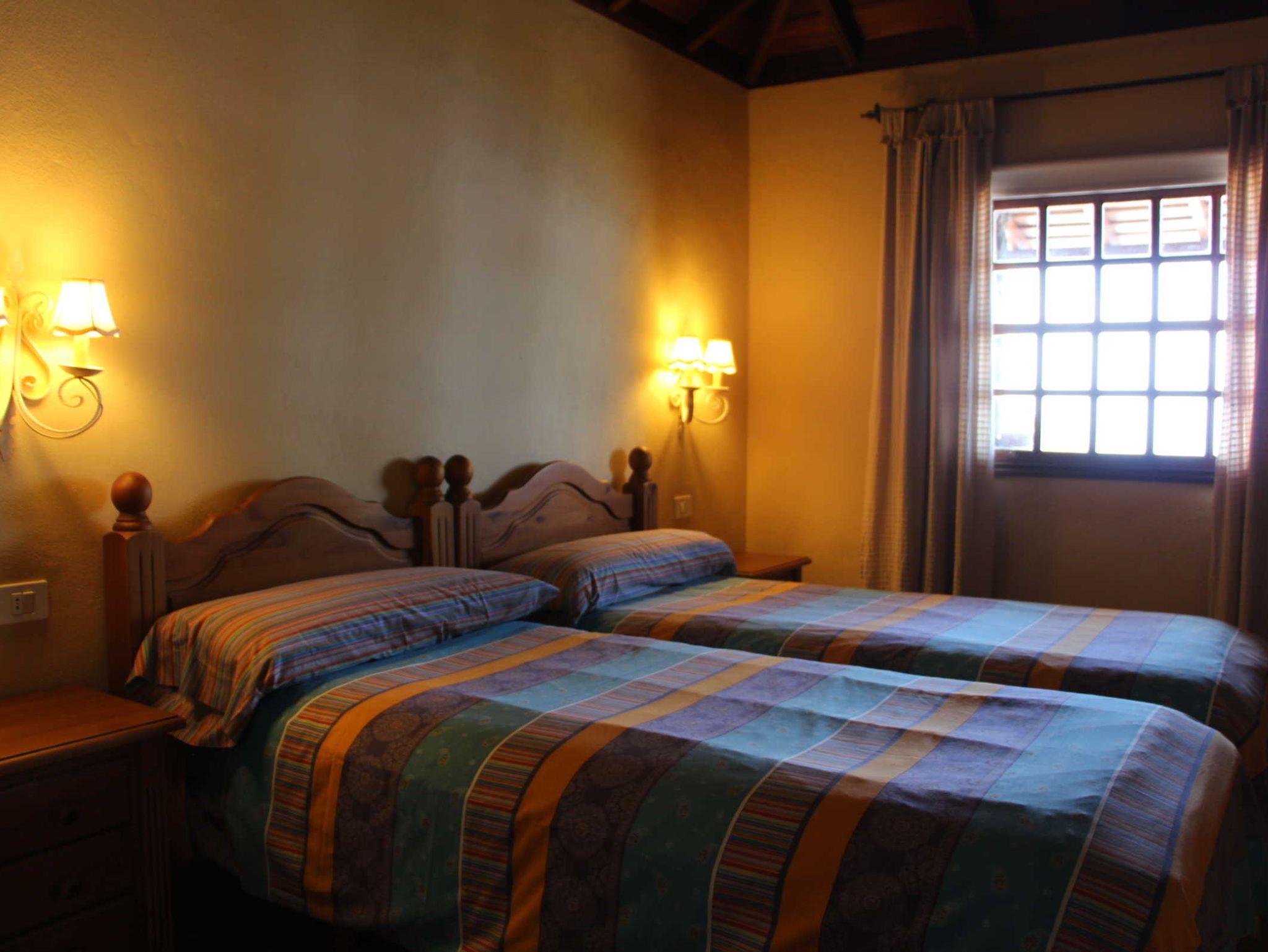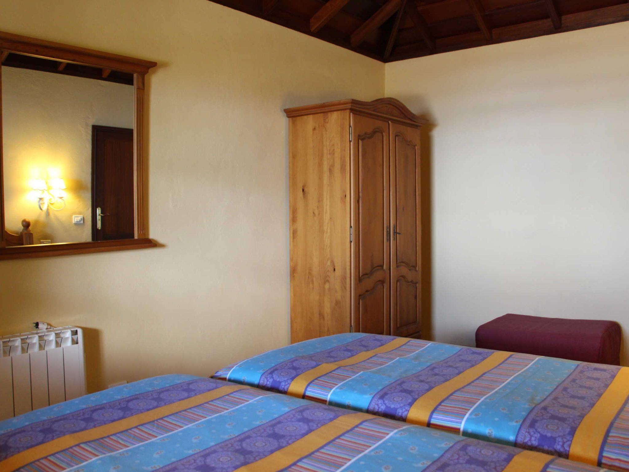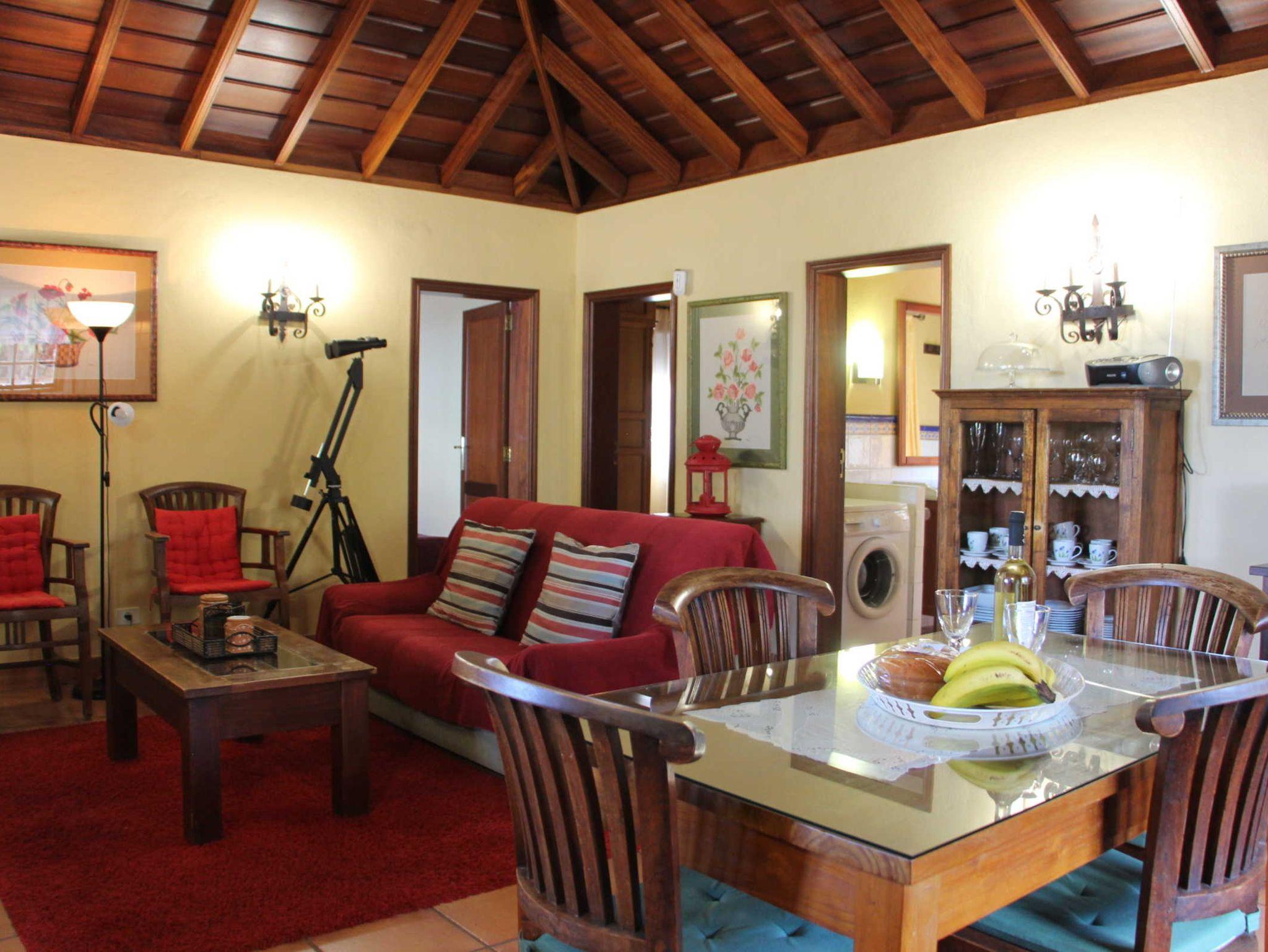 Alle Räume haben ein kanarisches Holzgiebeldach. Um den kleinen Kamin im Wohnbereich gruppieren sich ein Sofa und zwei Stühle. Sat-TV, ein großer Flachbildfernseher und Internet-WLAN gehören selbstverständlich zur komfortablen Ausstattung. Die Wandbilder sind allesamt Handarbeiten der Mutter der Eigentümerin. Die Küche bietet viel Arbeitsfläche und zusätzlichen Platz für Geschirr in einer schönen Vitrine. Am Esstisch im Mittelpunkt des Raumes ist Platz für bis zu 4 Personen.