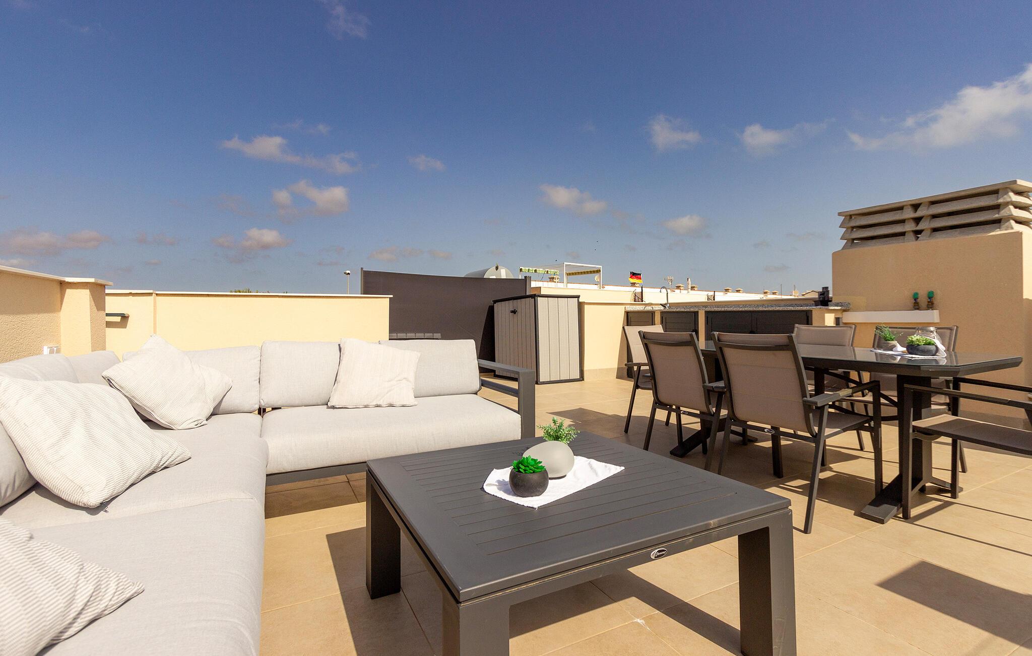 Den rummelige tagterrasse har en fantastisk udsigt over havet og egner sig helt ideelt til solbadning eller sociale aftener i det fri. På de varme dage, og dem er der mange af her, kan I køle jer lækkert af den private pool, inden I tager på tur.