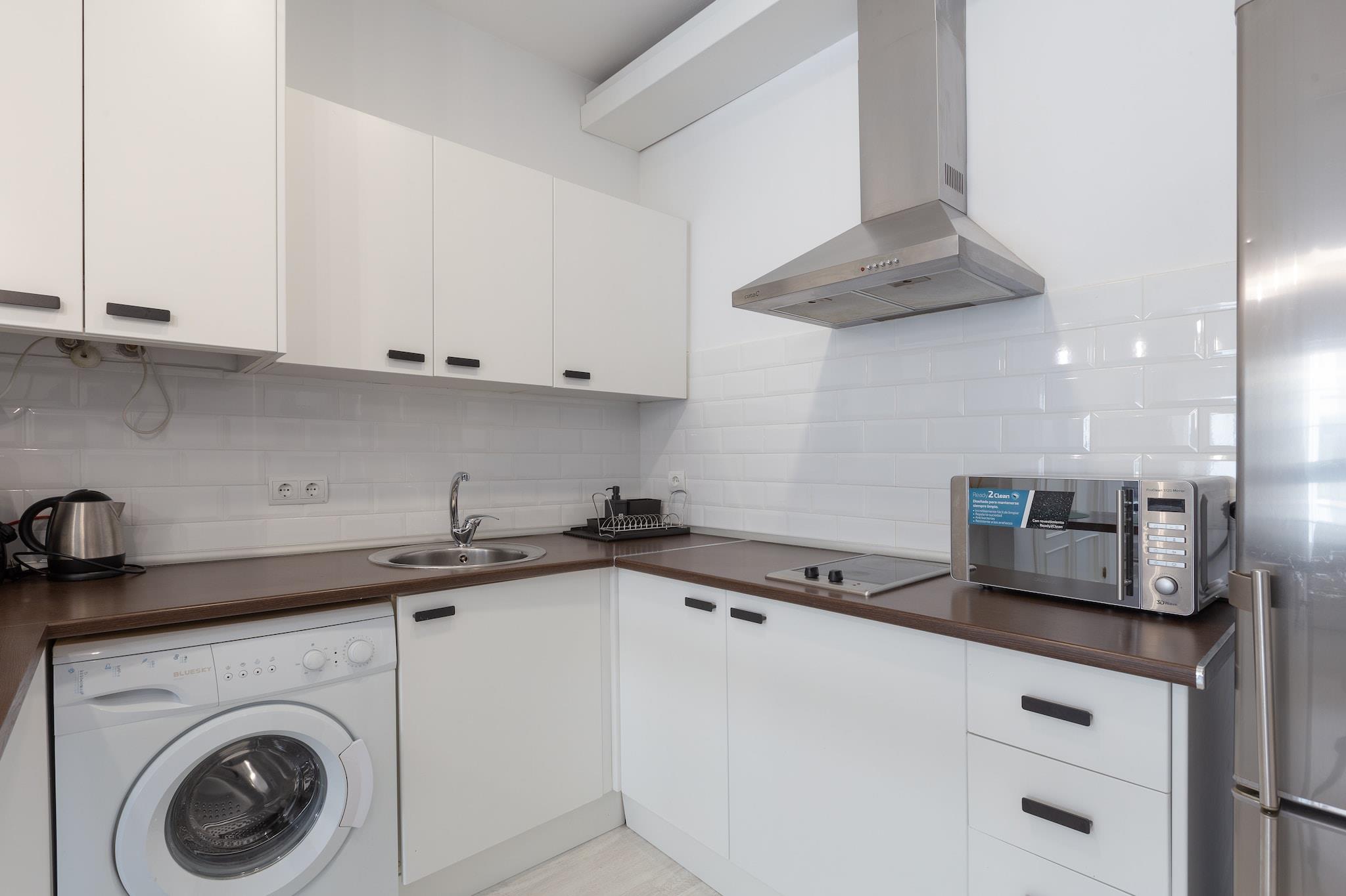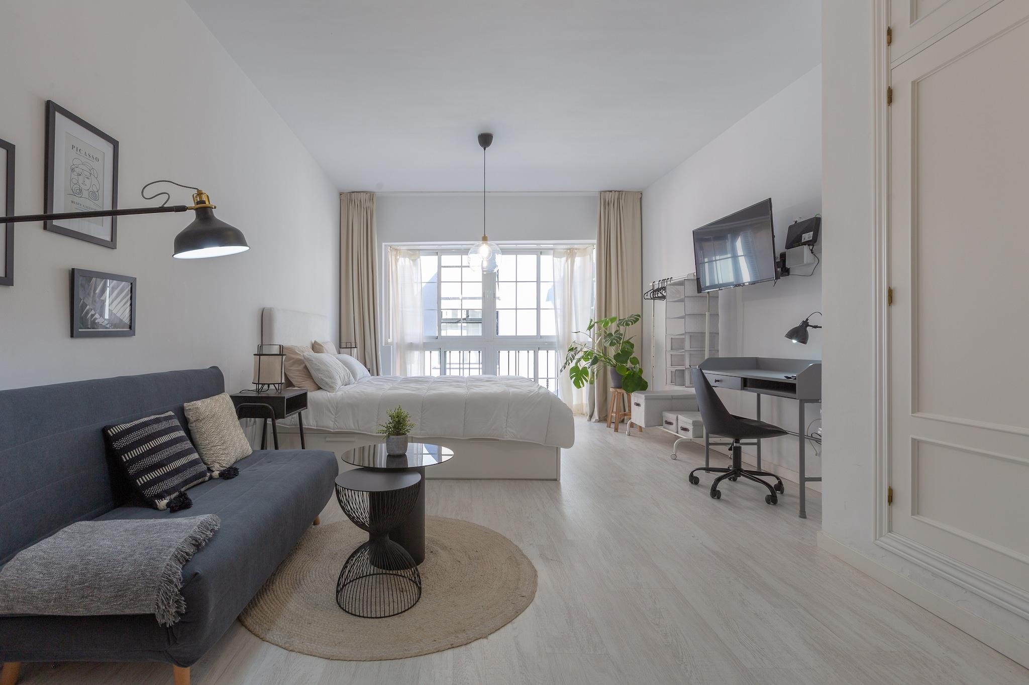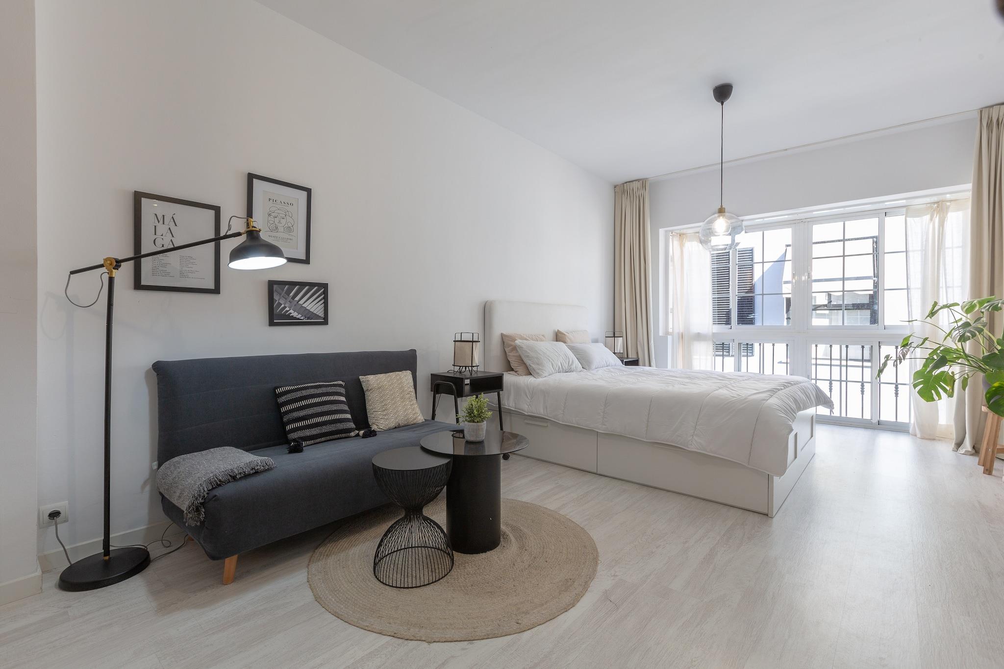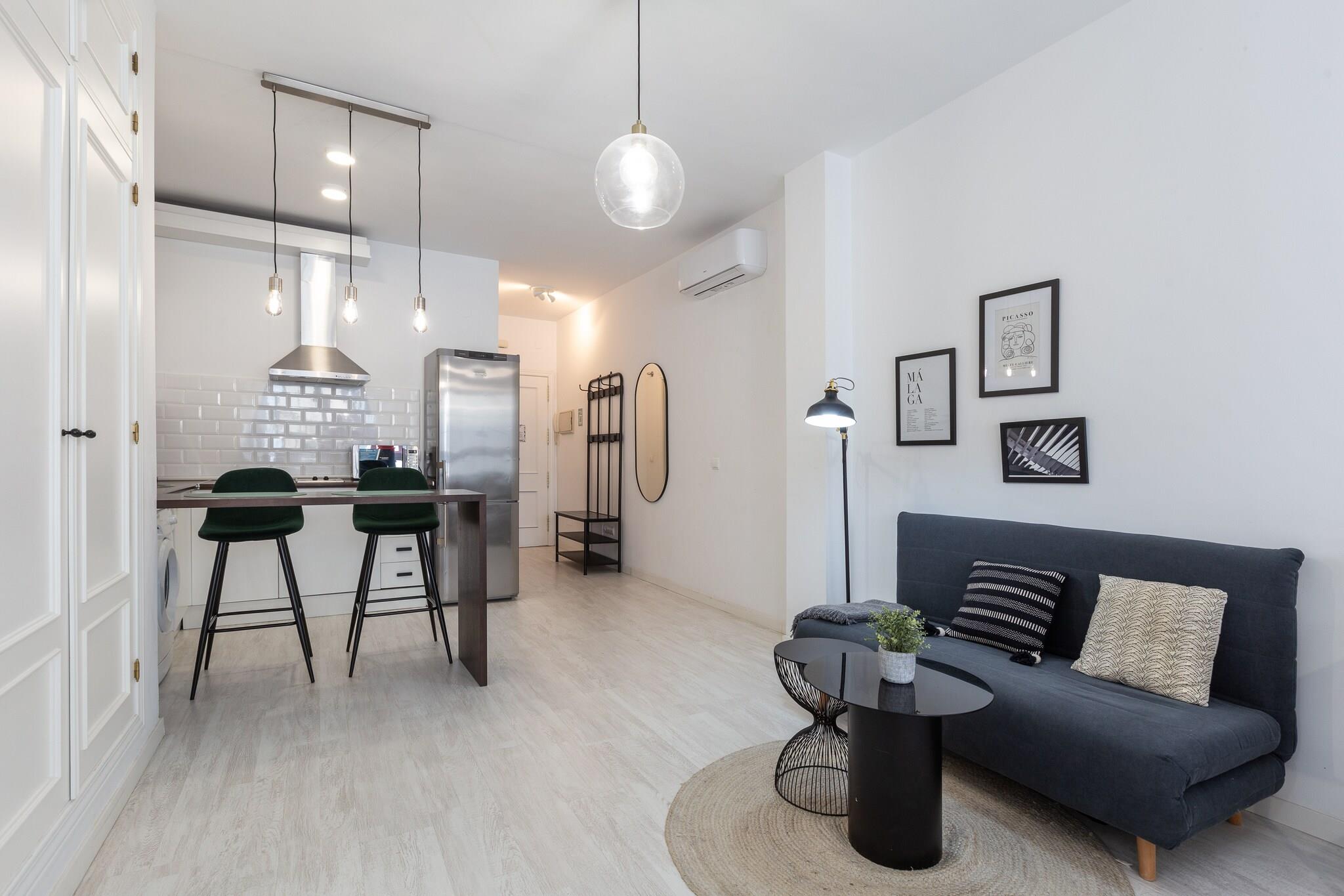 Lyst og behageligt ophold Denne lejlighed i Málaga tilbyder et indbydende tilflugtssted fyldt med naturligt lys og udsigt over en charmerende gade. Den åbne planløsning omfatter en stue-spisestue med AC og Smart TV, et moderne køkken med induktionskomfur og det nødvendige samt en komfortabel dobbeltseng. En sovesofa kan rumme en gæst mere, mens familier kan anmode om en barneseng og højstol. En vaskemaskine, strygejern og strygebræt tilføjer bekvemmelighed, hvilket gør den ideel til både korte pauser og længere ophold. Centrale Málaga Placering Kun 650 m fra byens centrum, vil du være få skridt væk fra Málagas historie og kultur. Udforsk Alcazaba-fæstningen for at få en flot udsigt, opdag Picassos arv på hans museum, eller nyd en afslappende dag i Playa de la Malagueta, kun 2 km væk. Med et busstoppested kun 350 m fra lejligheden og togstationen 1,5 km væk, er byen og kysten inden for rækkevidde. Málaga Lufthavn ligger 12,5 km væk, hvilket gør rejser problemfri. Spisning og lokale smagsoplevelser Kvarteret er fyldt med autentiske andalusiske madoplevelser. Fra tapasbarer til familiedrevne restauranter, hvert hjørne byder på en smag af Málagas livlige køkken. El Delantal, kun 100 m væk, er en lokal favorit. Gå ikke glip af at parre traditionelle tapas med Málagas søde vin for en ægte kulturel oplevelse. Uanset om du udforsker vartegn, slentrer i de historiske gader eller nyder madscenen, placerer denne lejlighed dig i hjertet af det hele. Bemærk venligst: kæledyr og arrangementer er ikke tilladt.