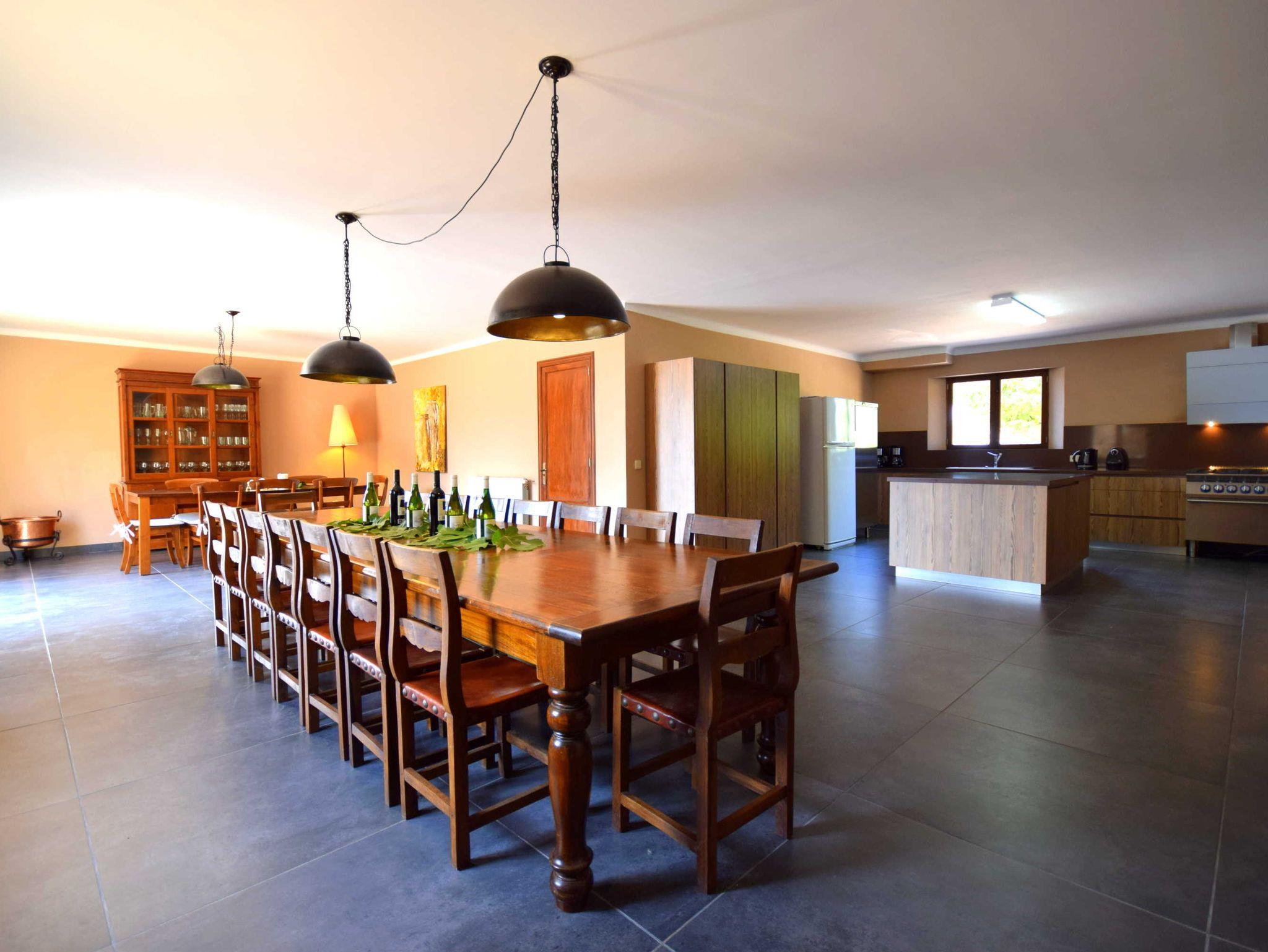 Von den insgesamt 800 m² sind 220 m² Wohnfläche exklusiv für Gäste reserviert. Es erwarten Sie ein großzügiges, helles und klimatisiertes Wohn- und Esszimmer ? ideal für gemeinsame Mahlzeiten und gesellige Abende. Die voll ausgestattete, praktische und einladende Küche befindet sich direkt am Essbereich. Natürliche Materialien, Holzmöbel und offene Räume schaffen eine elegante und authentisch mallorquinische Atmosphäre.