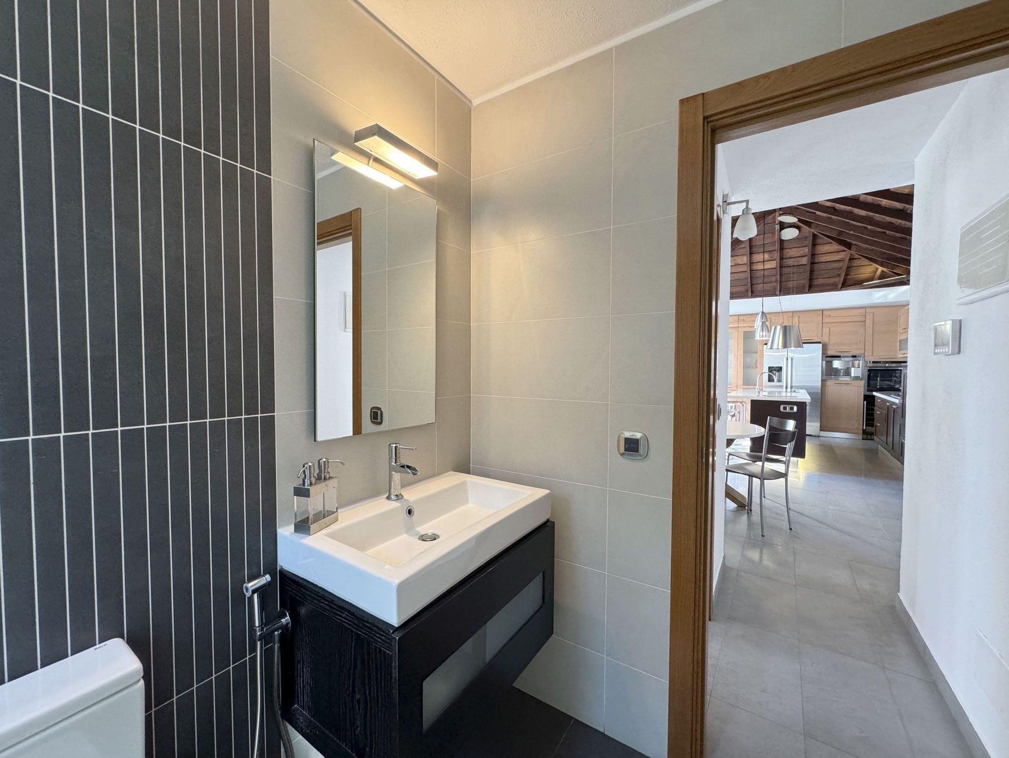 Das Ferienhaus bietet außerdem zwei komfortable Badezimmer. Das Hauptbadezimmer ist mit zwei Handwaschbecken, einer ebenerdigen Dusche, einem WC und einem Föhn ausgestattet. Das zweite Badezimmer verfügt über ein Handwaschbecken, eine ebenerdige Dusche und ein WC.