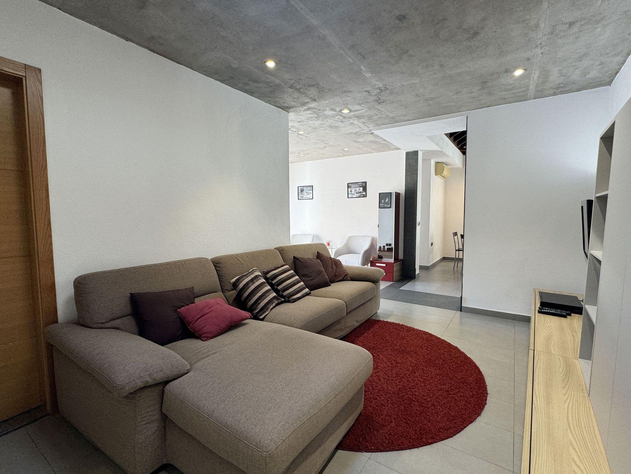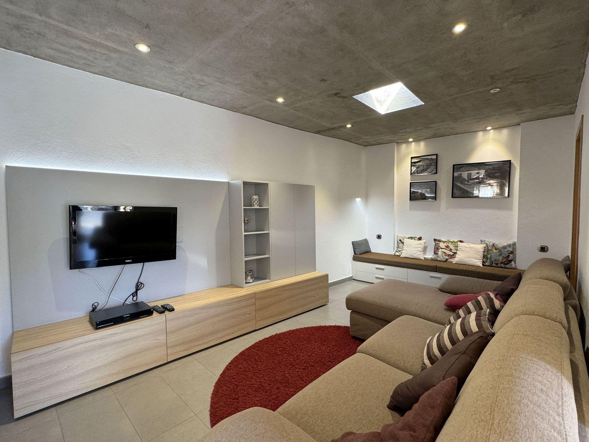 Der moderne, offene Wohnbereich lädt mit einem bequemen Sofa zum Entspannen ein und bietet Unterhaltung durch einen Flachbildschirm mit Zugang zu Satelliten-, deutschem und spanischem Fernsehen.