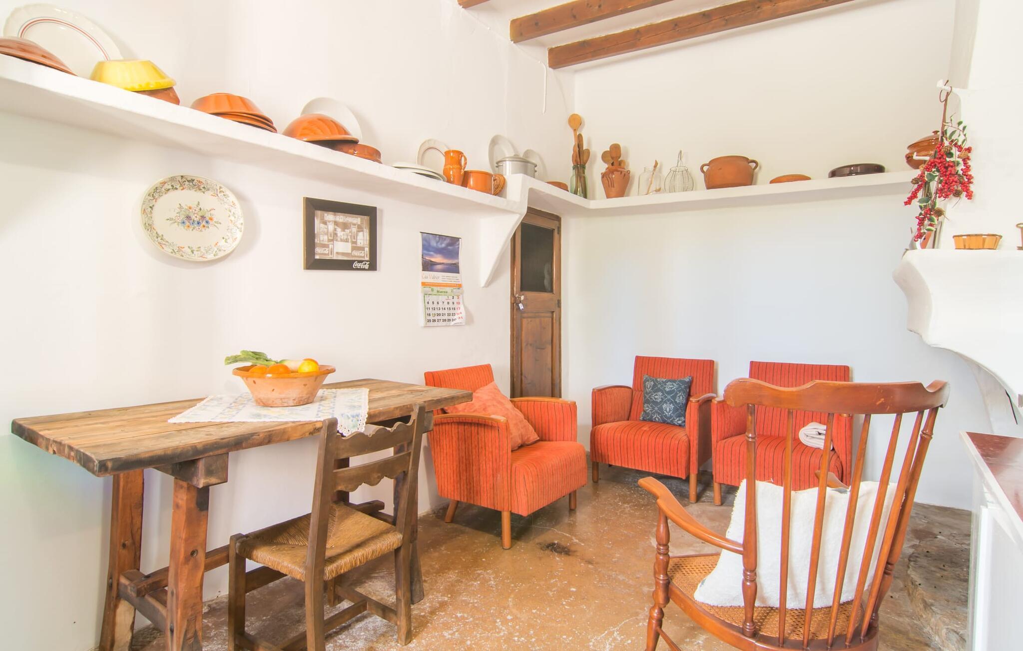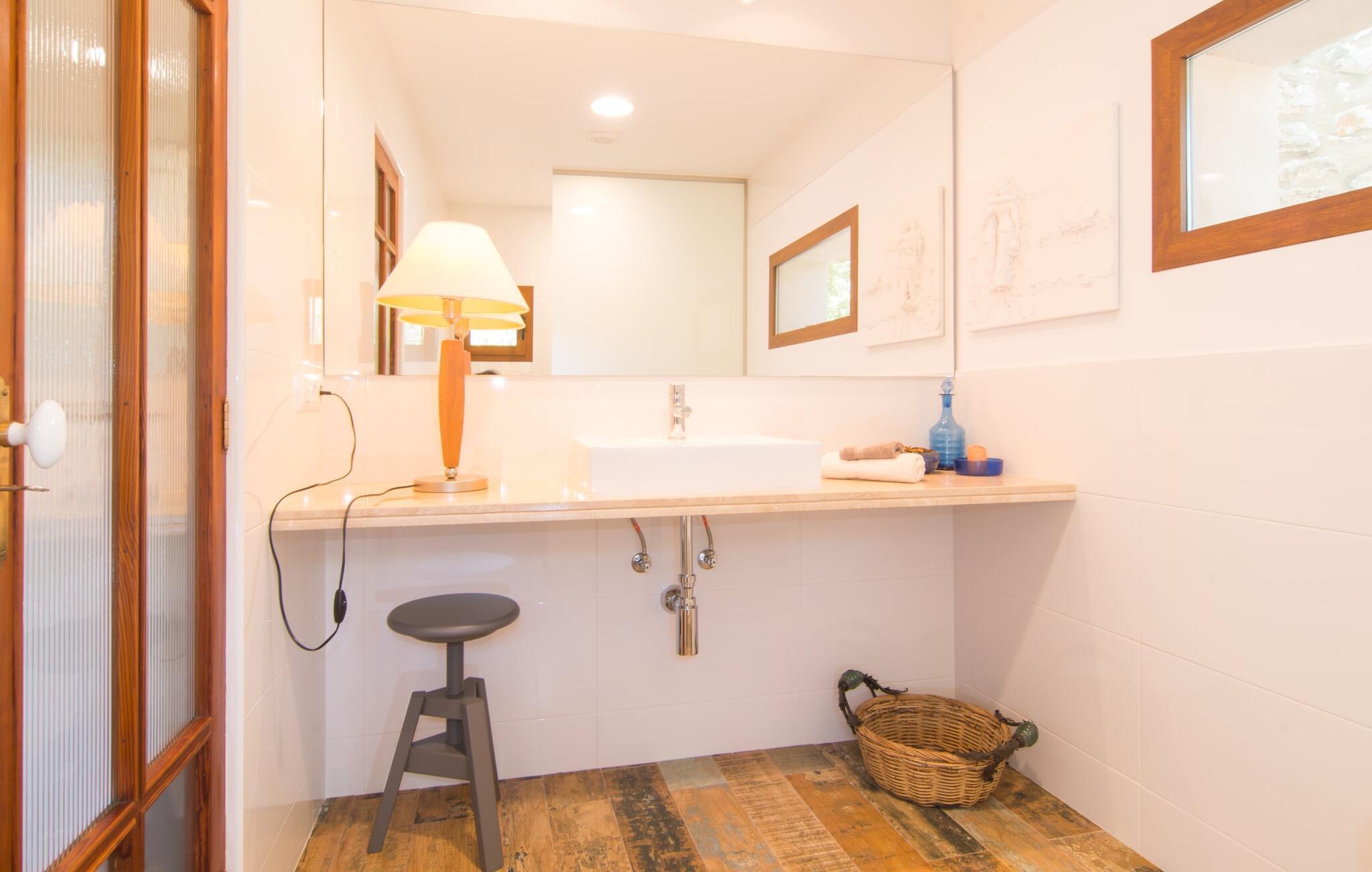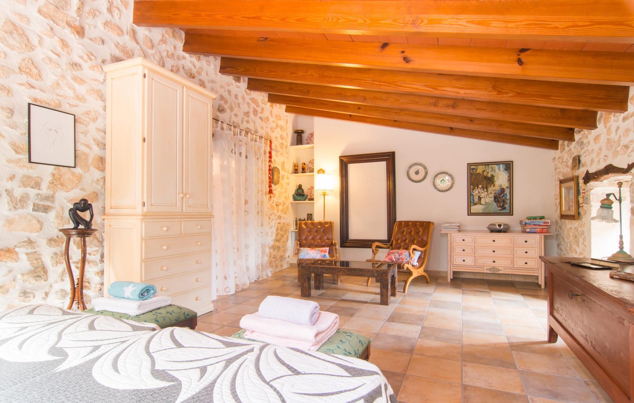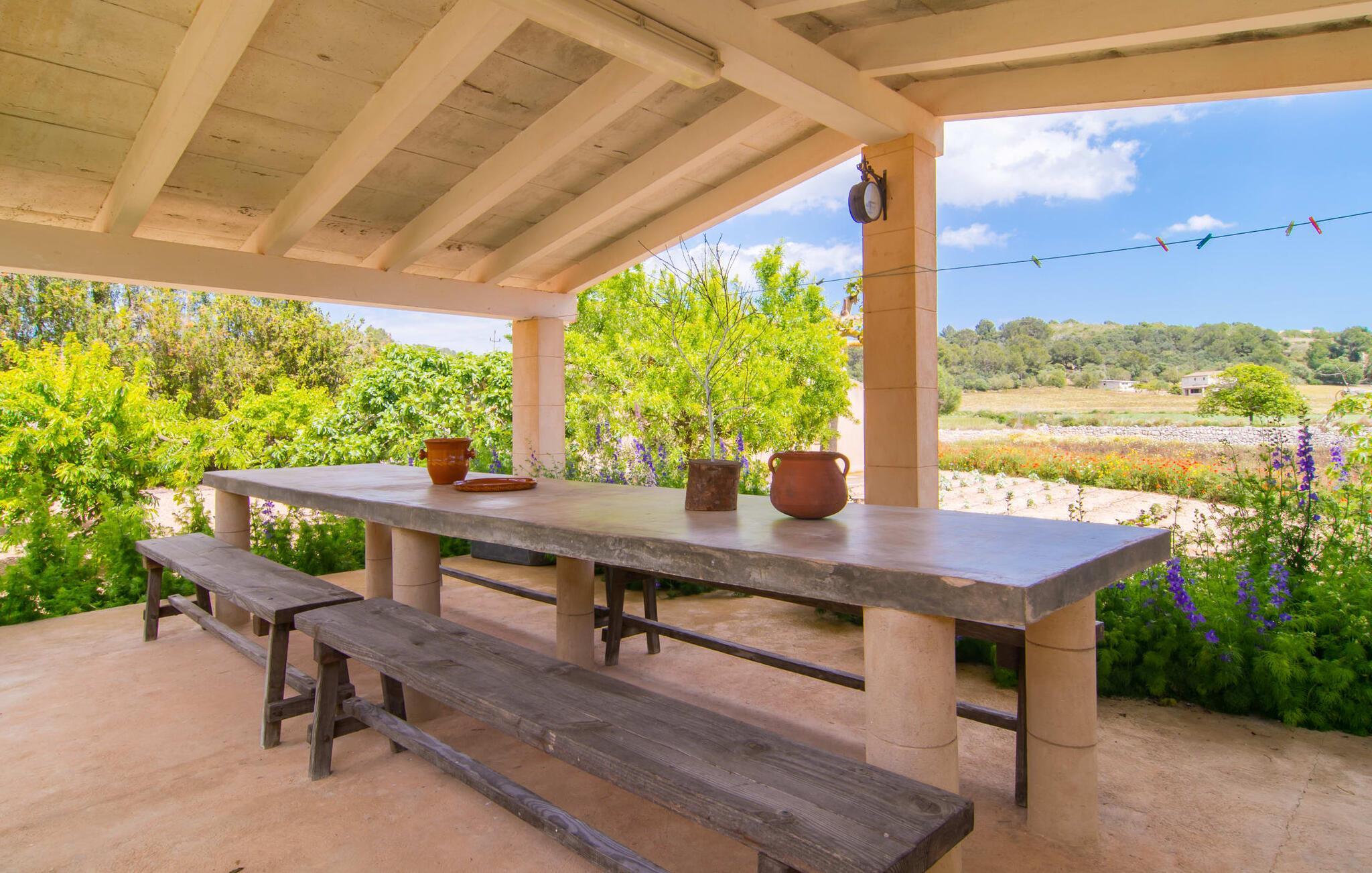 Når du tænker på middelhavslandhuse, tænker du sikkert på rustikke vægge, appelsin- og mandeltræer og fyrretræer midt på brede marker under en blå himmel. Villa "Manenta" tilbyder dig alt dette. Den store græsplæne indbyder til solbadning eller leg med dine små. Nyd solen eller en god bog under parasollen i det rummelige afslapningsområde ved den store pool. Et rigtigt højdepunkt ved Villa "Manenta" er dens frugthave. Du kan tilberede en "frugtsalat à la Mallorca" med frugter fra din egen have. Villaens træer og buske er fulde af appelsiner, mandler og nødder. Måske vil dette inspirere dig til at skabe din egen "Ensalada de Manenta"? Denne salat serveres bedst og nydes på fincaens store overdækkede udendørs terrasse. Terrassen ligger under højt sadeltag med rummeligt spisebord mellem blomsterbede og frugttræer. Vil du have noget mere hjerteligt end en salat, er dette også det perfekte sted til en grillfest med masser af kulinariske lækkerier. Kulgrillen er altid klar til brug. Det indre af hovedbygningen er designet i den unikke stil med middelhavslandhuse. Kombinationen af groft murværk og hvidkalkede vægge gør "Manenta" til en typisk villa. De solide møbler og tilbehør understreger den unikke hygge i dit sommerhus. I stueetagen er der et rummeligt soveværelse med dobbeltseng. Under dette rustikke tag er der ikke kun nostalgiske skabe og skuffer, men også et moderne opholdsområde. Enkeltværelset er også hyggeligt. Ud over en typisk spansk juniorseng har den også et lille skrivebord. Stuen og spisestuen er lys og rummelig. Kombinationen af moderne sæder og rustikke dekorative elementer gør den særlig komfortabel. Landhusets tidligere køkken er usædvanligt smukt. Efter en lang dag i solen kan du føle dig godt tilpas foran pejsen. Den unikke karakter af den mallorcanske arkitektoniske stil er tydelig i det første dobbeltværelse på øverste etage: den solide væg suppleres af bjælkerne på det skrå tag, som er så typiske for øen, og et vindue bygget i den autentiske mallorcanske stil . Du kan sove lige så roligt i det andet dobbeltværelse. Det er lyst og rummeligt og har to enkeltsenge. Det moderne køkken har komfur, ovn, vaskemaskine, opvaskemaskine, brødrister, mikroovn og kedel. Køkkenet fungerer som spisestue og er perfekt til morgenmad med hele familien! Alternativt kan du spise på terrassen ovenpå. Her kan du nyde dagens første og alle andre måltider under trætoppene. Vidste du, at du kan nyde en nedsat pris med en gruppe på op til fire personer? I dette tilfælde kan du bruge den øverste etage, mens den nederste etage forbliver lukket. Der er flere muligheder for udflugter i området. Den idylliske landsby Son Macia er mere værd end blot et besøg. Villaen ligger tæt på vejen, der fører til byen Manacor. Dette er også fødestedet for den spanske tennisstjerne Rafael Nadal og et sted at hente lækre godbidder på det daglige bondemarked. En gåtur gennem den historiske gamle bydel med dens arkæologiske udgravninger er et sandt eventyr. Omkring fire kilometer uden for Manacor befinder du dig på strandene på Mallorcas østkyst, som tilbyder alle bekvemmeligheder til en perfekt stranddag. Du kan også udforske den naturlige skønhed ved kysten, såsom de spektakulære grotter i Porto Cristo! Den rustikke villa "Manenta" med gæstehus ligger i den smukke østlige del af øen, kun 2 km nordvest for landsbyen Son Macia. Den rummelige ejendom er beliggende midt i typiske mallorcanske marker og maleriske fyrretræer. Son Macia tilbyder alt hvad du behøver for at opfylde dine daglige behov. Der er supermarkeder, barer og restauranter i Manacor, kun 3 km væk. Der er omkring 12 km til østkystens strande og bugter, såsom Cala Moreia, Porto Cristo eller Cala Pilota. Dette er et Fincallorca feriehus.