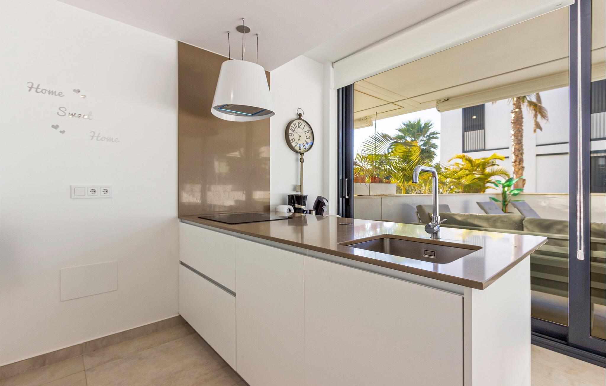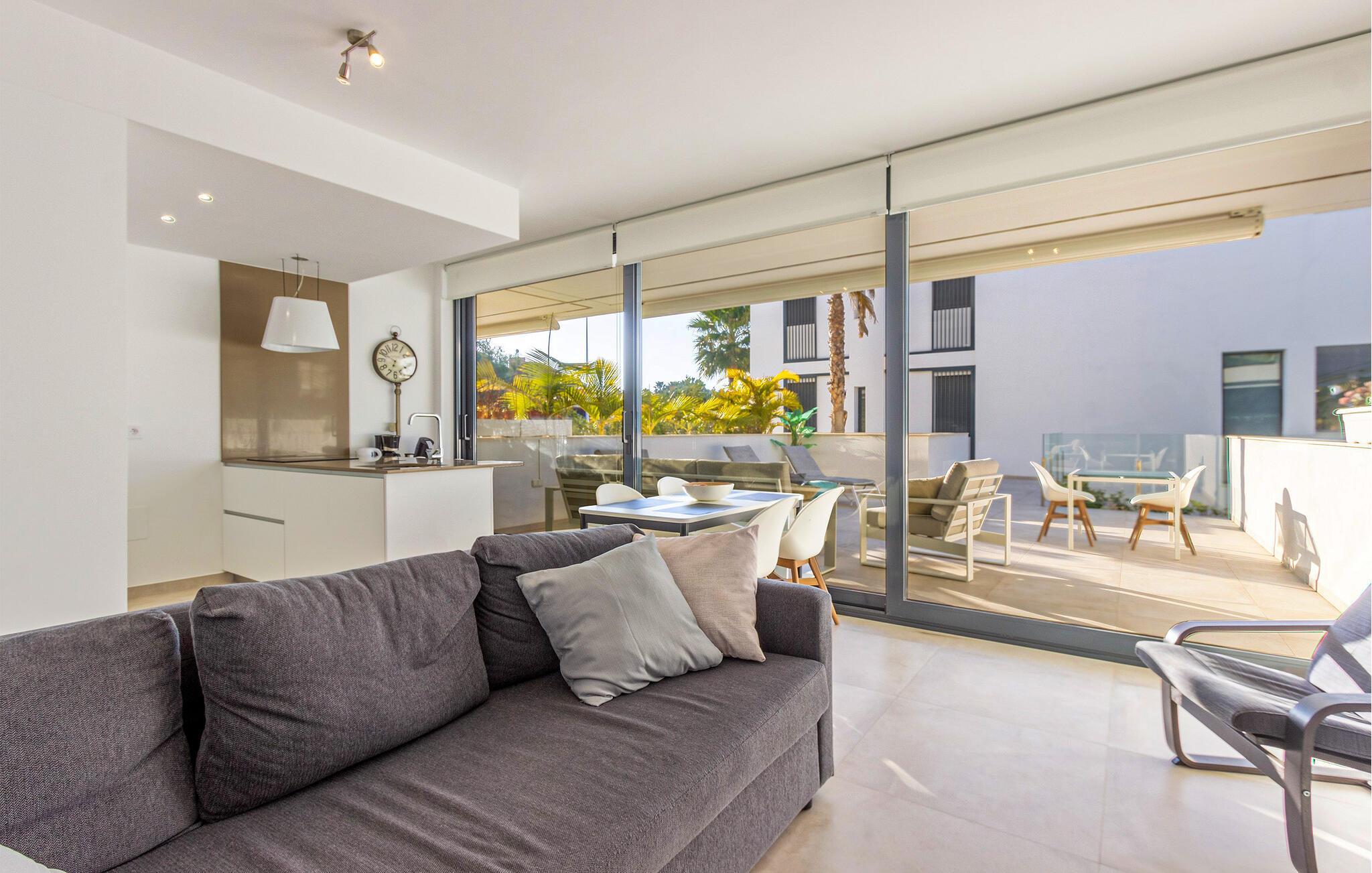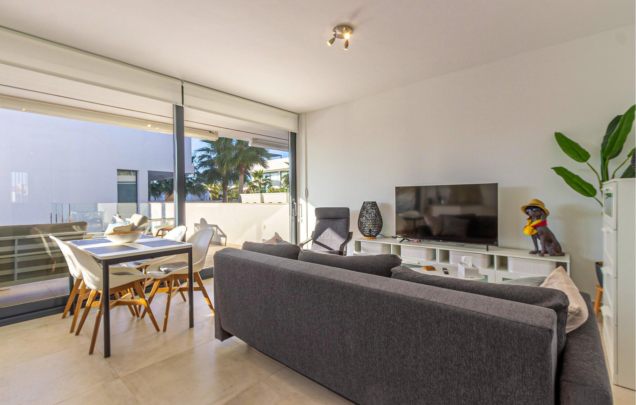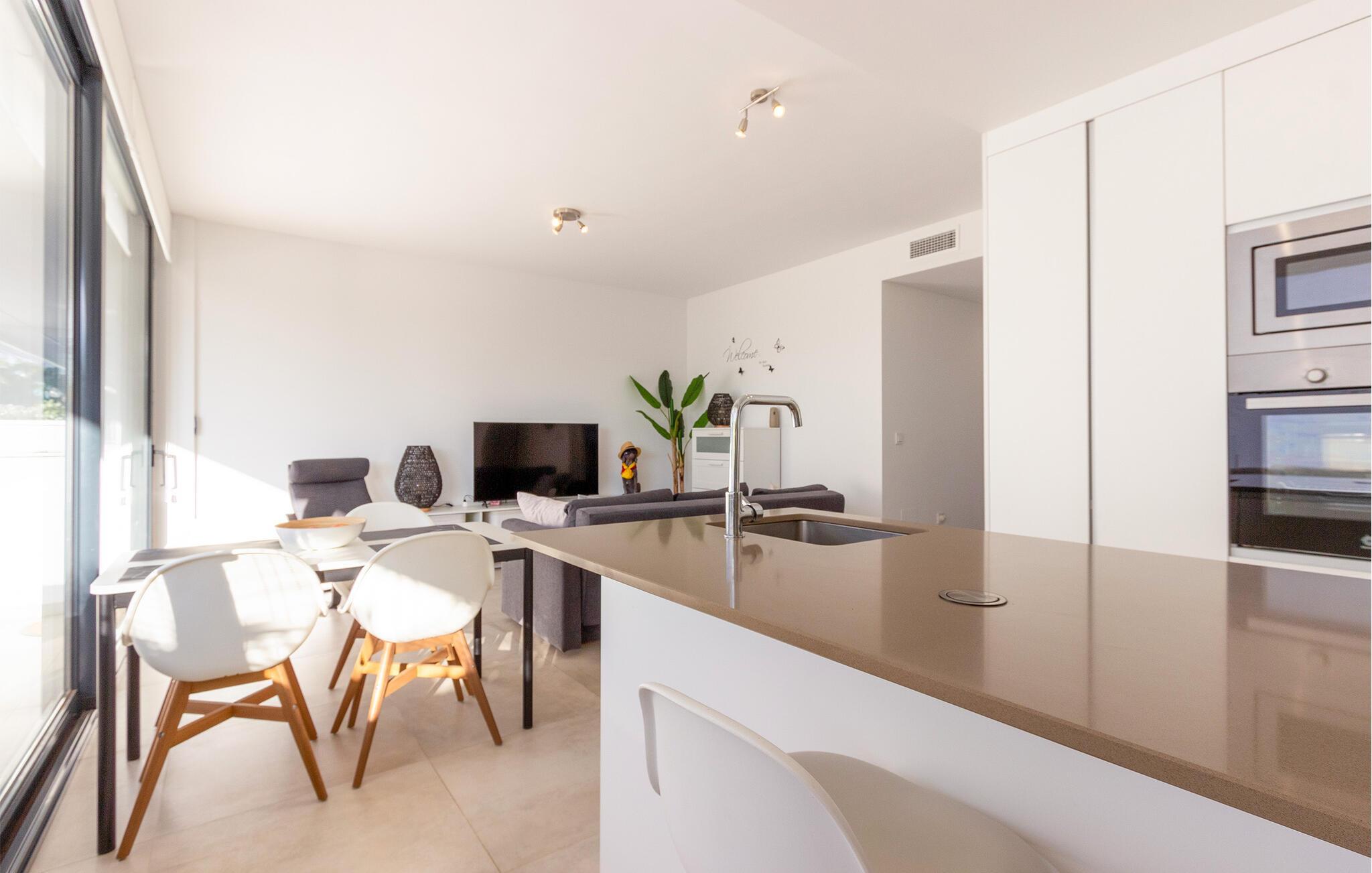Denne smagfulde ferielejlighed byder jer velkommen med en åben opholdsstue, der takket være store vinduesfronter har masser af naturligt dagslys. Tilbered lækre tapas i det fuldt udstyrede, moderne køkken, og nyd jeres måltider ved det stilfulde spisebord. Find jer godt til rette i den hyggelige sofa om aftenen, og stream en spændende serie.