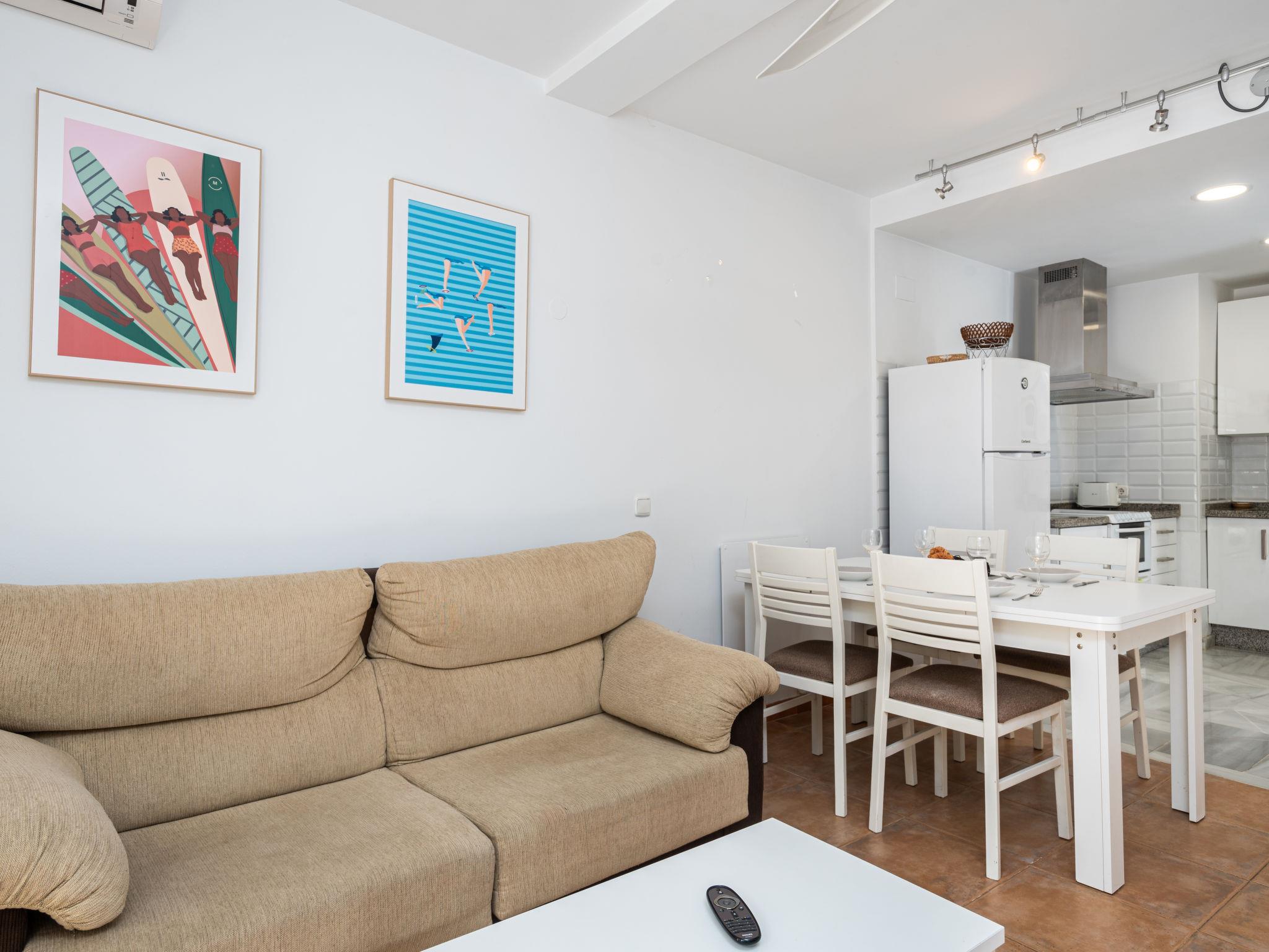 "Jardines del Mar", 2-room apartment 60 m2, lower ground floor. Object suitable for 2 adults + 1 child. Simple and comfortable furnishings: living/dining room with digital TV, air conditioning and forced-air heating. Exit to the terrace. 1 double bedroom with 1 french bed (150 cm, length 190 cm). Exit to the terrace. Small kitchen (2 hot plates, oven, microwave, freezer) with hatch. Bath/bidet/WC. Terrace 15 m2, roofed. Terrace furniture, deck chairs (2). View of the garden. Facilities: washing machine. Internet (WiFi, free). Parking. Please note: telephone for incoming calls only. VUT/MA/08877 // Reg. Nr.: ESFCTU0000290410004328540000000000000000VUT/MA/088773