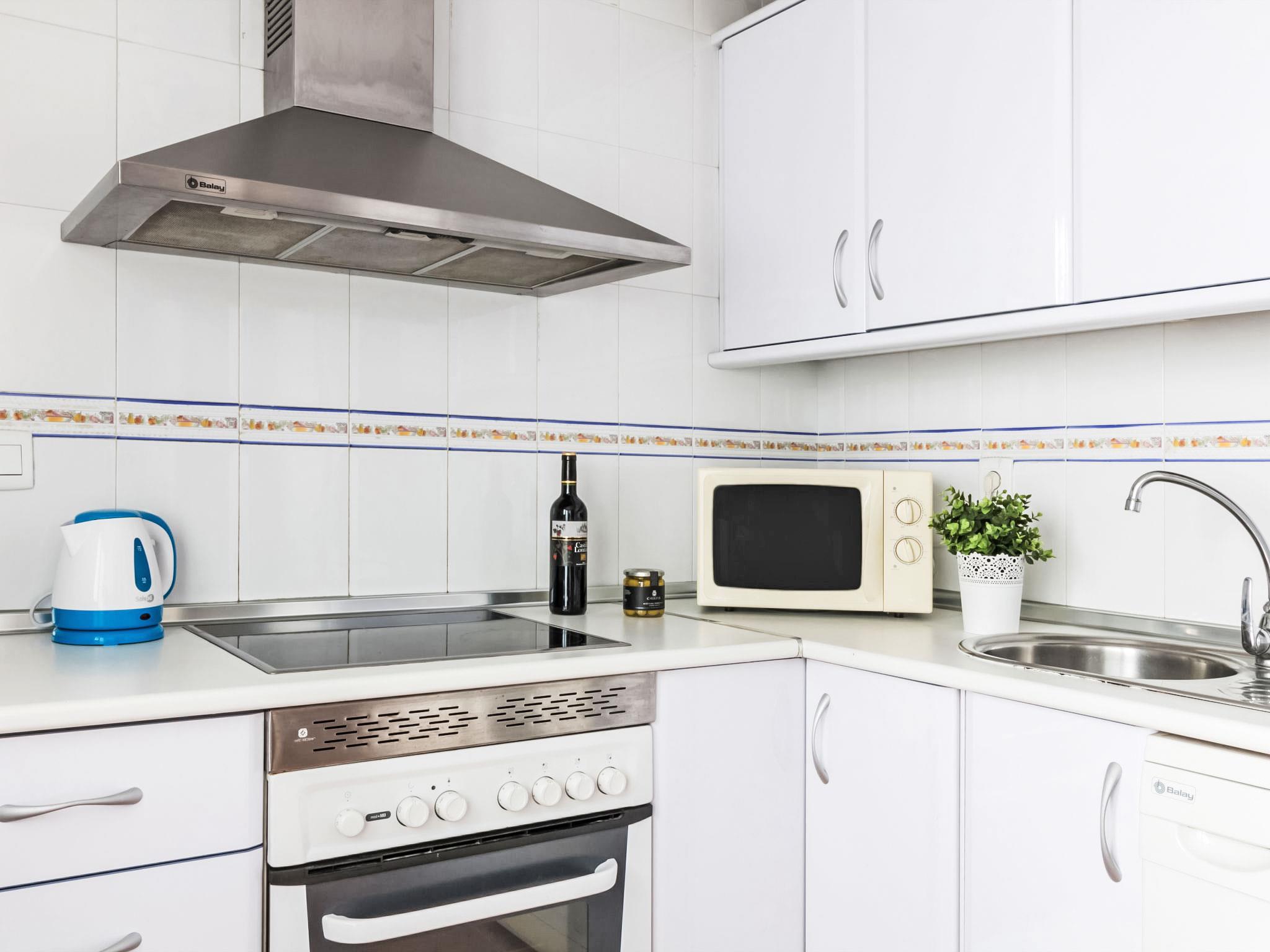 3-room apartment 79 m2 on 7th floor. Living/dining room with digital TV, radio, air conditioning and forced-air heating. Exit to the terrace. 1 room with 2 beds (90 cm, length 190 cm), air conditioning, fan and forced-air heating. 1 room with 1 french bed (150 cm, length 190 cm), fan. Kitchen (4 hot plates, oven, microwave, freezer). Bath/bidet/WC, sep. WC. Electric heating. Balcony. Balcony furniture. View of the sea and the swimming pool. Facilities: washing machine, iron, children's high chair, baby cot, hair dryer. Internet (WiFi, free). Garage space n 22. VUT/MA/23132