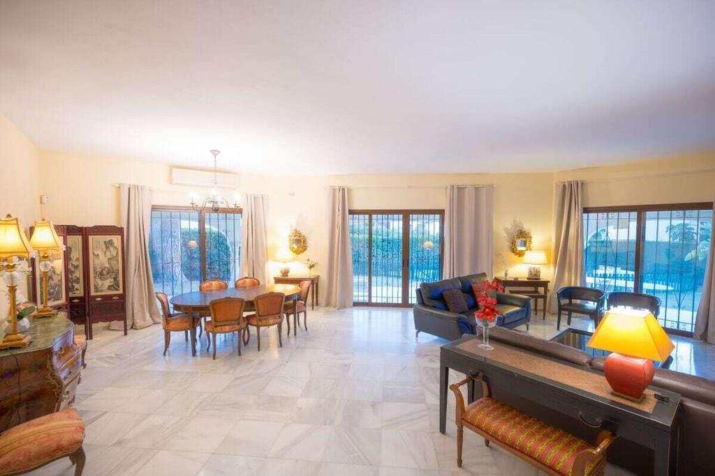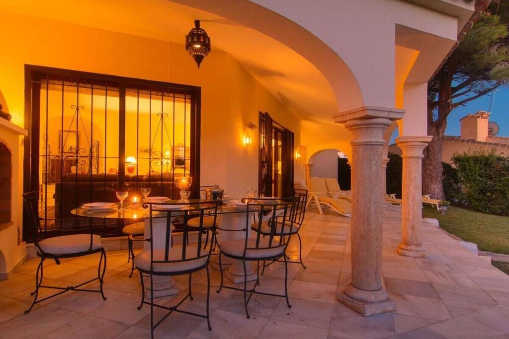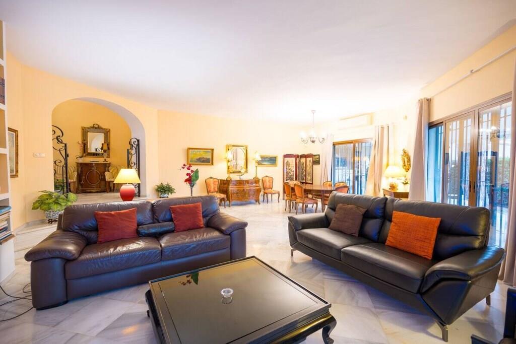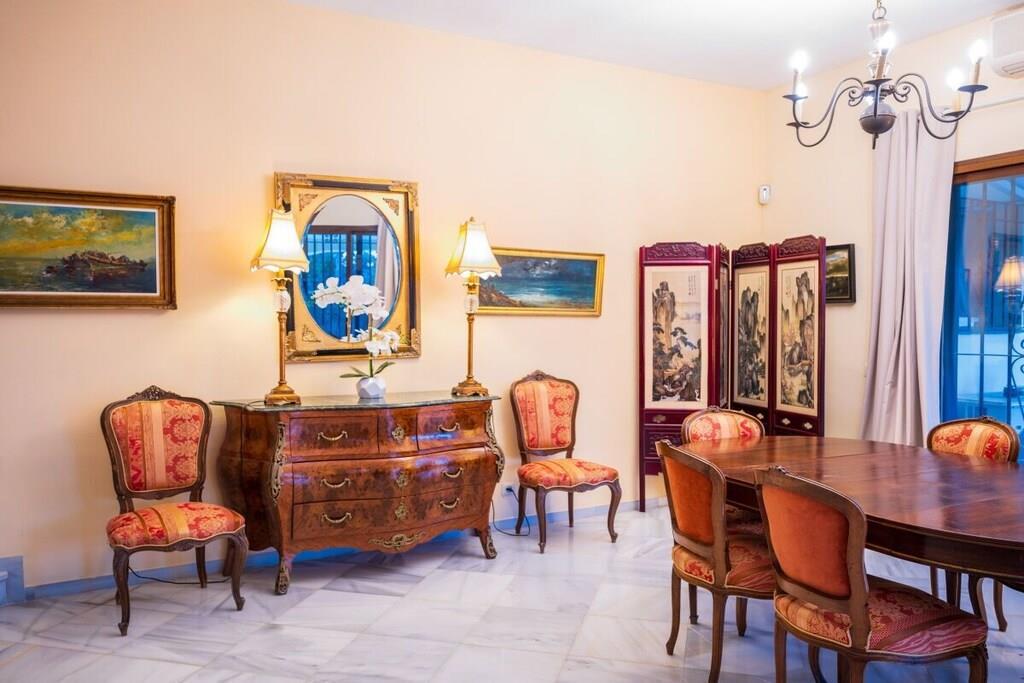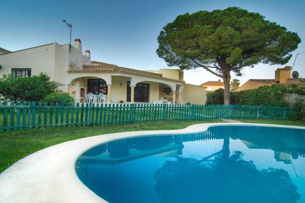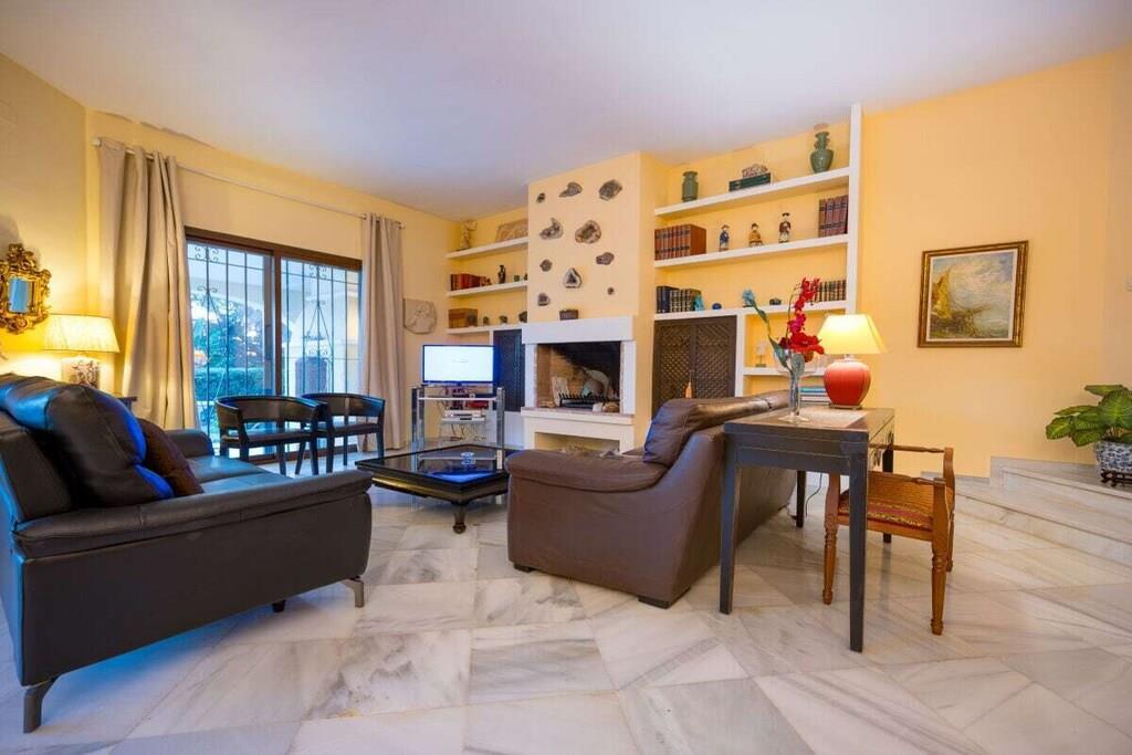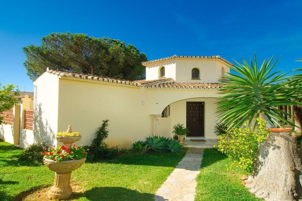 Dieses einstöckige, typisch spanische Haus (200m2) mit drei Schlafzimmern, vier Badezimmern, einem großen, hellen Wohnzimmer, einer voll ausgestatteten Küche, einer großen Terrasse und einem Garten (1000m2) mit privatem Pool (12x5m) ist ein idealer Ort für einen erholsamen Urlaub in Las Chapas Playa, nur 300m vom schönsten Strand von Marbella entfernt. ~ Innen Eine große Halle empfängt Sie beim Betreten des Hauses. Von hier aus können Sie das Wohnzimmer betreten, zu den beiden Gästeschlafzimmern oder zur Küche und zum Hauptschlafzimmer gehen. Das Wohnzimmer ist sehr geräumig, hat eine Sitzecke mit zwei Sofas und Sesseln, Flachbildfernseher, Kamin und niedrigem Couchtisch. Auf der anderen Seite des Wohnzimmers befindet sich ein eleganter Essbereich mit schönen viktorianischen Möbeln und einem viktorianischen Esstisch mit 8 gepolsterten Stühlen. Eine große Glasschiebetür führt auf die schöne Terrasse. Das Hauptschlafzimmer verfügt über ein 180 cm breites Bett (2x90 cm), eine Kommode, ein kleines Sofa, einen Flachbildfernseher, einen Kleiderschrank, ein großes Fenster und eine Glastür zum Garten sowie ein voll ausgestattetes Bad mit Badewanne. Das zweite Schlafzimmer ist mit einem Doppelbett und großen Schränken ausgestattet. Das dritte Schlafzimmer hat zwei Einzelbetten (90x190cm) und geräumige Schränke. Beide Schlafzimmer teilen sich ein voll ausgestattetes Bad mit Badewanne und Jacuzzi-Duschkabine. Die Küche, obwohl nicht sehr geräumig, ist komplett ausgestattet mit Backofen, Mikrowelle, Wasserkocher, Kaffeemaschine, Geschirrspüler, Kühlschrank mit Eismaschine, Gefrierschrank, Glaskeramik, Toaster, Küchenutensilien. Neben der Küche befindet sich ein Bad mit Dusche. In der Eingangshalle befindet sich ein separates Gäste-WC. Alle Schlafzimmer und das Wohnzimmer haben individuelle Klimaanlagen. ~ Terrasse/Garten Eine schöne Terrasse ist vom Wohnzimmer aus zugänglich. Die Terrasse verfügt über eine Sitzecke mit Sofa und niedrigem Tisch sowie über einen Essbereich mit einem Tisch für 6 Personen. Ein schöner grüner Garten mit Pinien umgibt das Haus und ein 12x5m großer eingezäunter Pool mit römischer Treppe liegt vor der Terrasse. Dienstprogramme: Internet, Klimaanlage warm/kalt, Satelliten-TV (2), DVD-Player, CD-Player, Backofen, Eismaschine, Wasserkocher, Toaster, Geschirrspüler, Kaffeemaschine, Vitro-Keramik, Mikrowelle, Kühlschrank mit Eismaschine, Gefrierschrank, Waschmaschine, Bügeleisen, Holzkohlegrill, Haartrockner. Räume: 3 Schlafzimmer, 3 Bäder, 1 Gästebad, Wohnzimmer, Küche, Hauswirtschaftsraum. Möbel: Doppelbett (2), Einzelbetten (2), Sofas (2), Tisch im Freien (6), Esstisch (8). Alle Schlafzimmer haben Kleiderschränke. Sonstiges: Bettwäsche, Handtücher und Internetanschluss sind im Preis inbegriffen. Draußen: Terrasse, Privater Pool (12x5m), Privater Garten, Parkplatz auf der Straße.