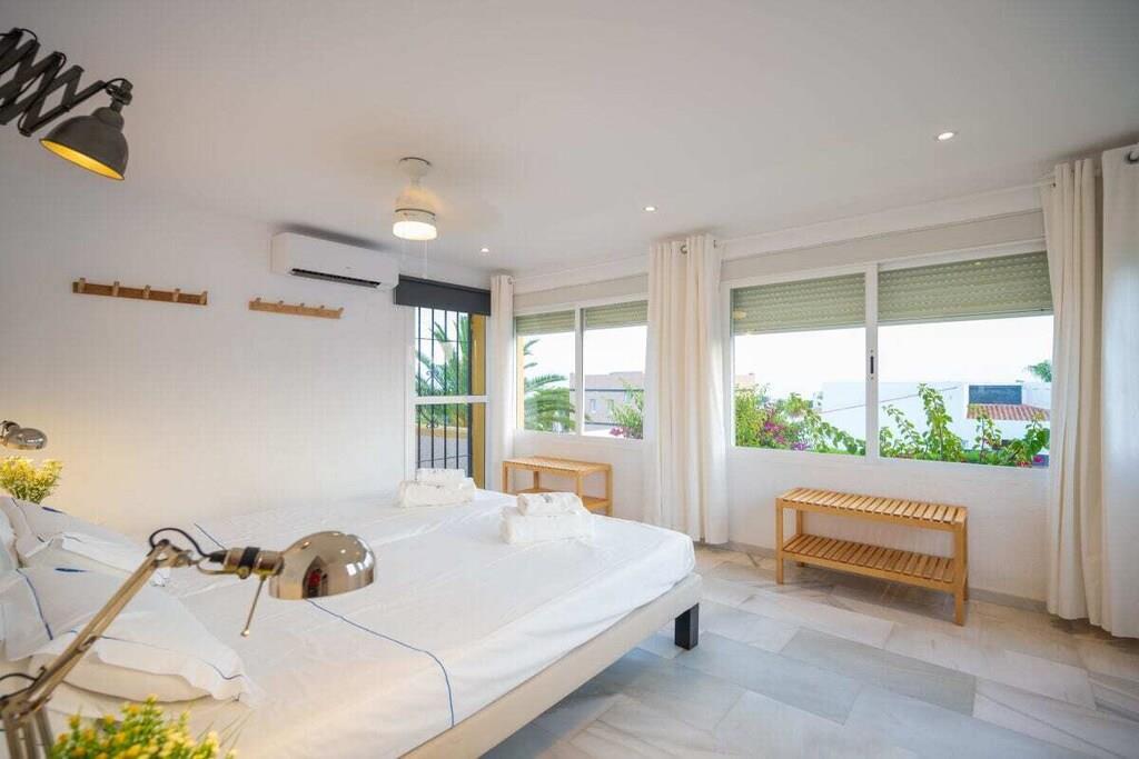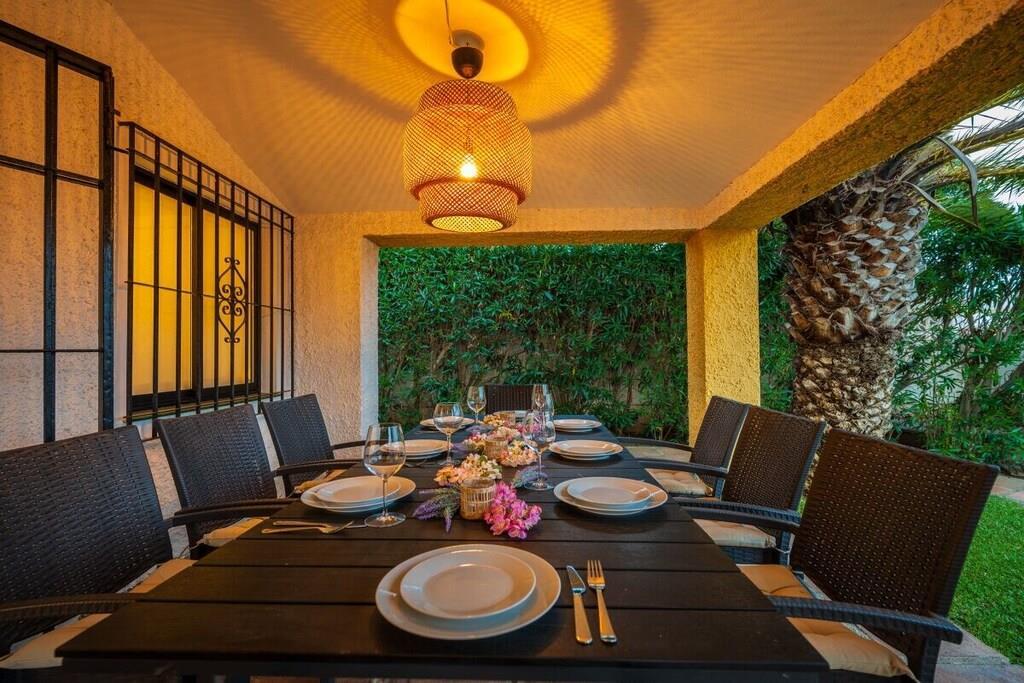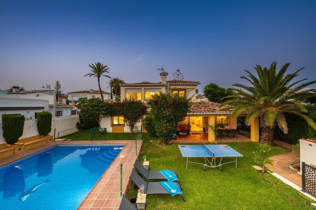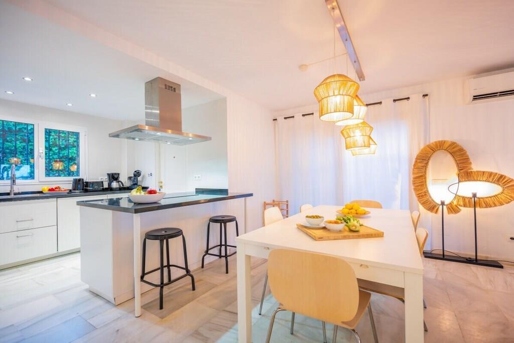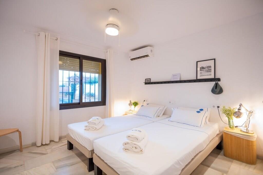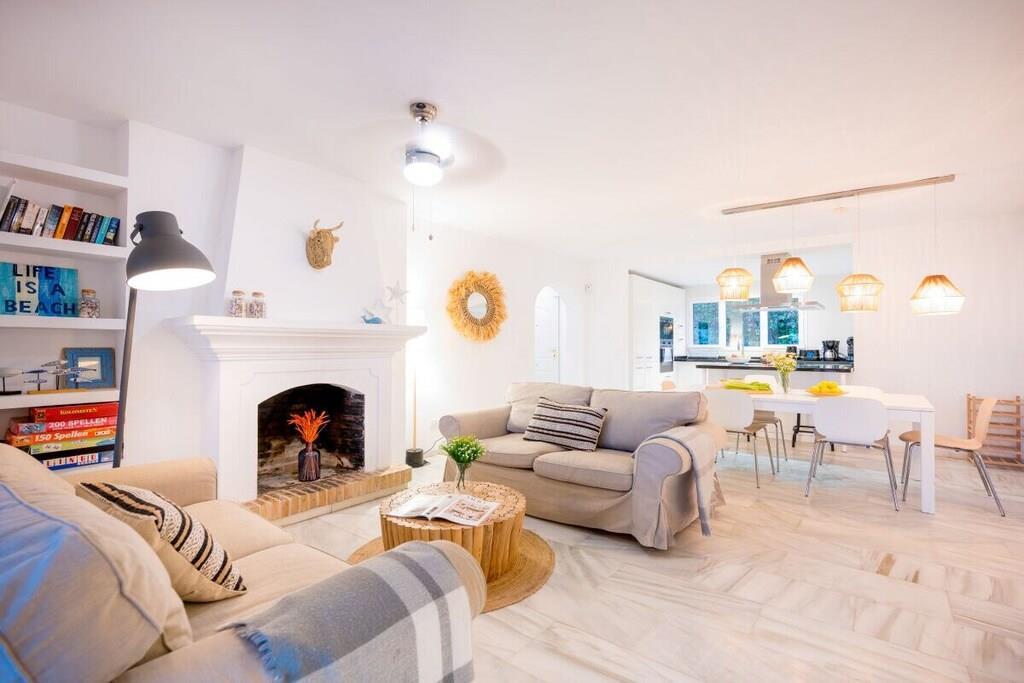 Genießen Sie die Schönheit und Authentizität dieses typischen Strandhauses mit vier Schlafzimmern in Las Chapas Playa. Die Innenräume sind so gestaltet, dass sie das Auge erfreuen, die weißen Marmorböden, die einfachen Möbel und die sorgfältig ausgewählten Dekorationen schaffen eine ruhige und einladende Atmosphäre. Der Garten und die Terrassen, der Pool (9mx5m) und die Tischtennisplatte, die Nähe zum Strand vervollständigen die Freude an einem unvergesslichen Urlaub im Kreise der Familie. ~ Innen Das Wohnzimmer dieses schönen Hauses ist die kühle Oase des Anwesens: Marmorfliesen auf dem Boden, dezentes minimalistisches Design, Holzkamin. Die Sitzecke ist mit zwei bequemen Sofas und einer Leselampe am Kamin ausgestattet. Der Essbereich befindet sich neben der offenen Küche und hat einen Holztisch für sechs Personen. Die Küche ist mit allen notwendigen Utensilien ausgestattet und verfügt über eine Insel mit zwei Barhockern. Die zweite Sitzecke verfügt über einen Flachbildfernseher vor einem Sofa und bietet direkten Zugang zum Innenhof des Hauses. Die beiden Schlafzimmer im Erdgeschoss haben jeweils zwei Einzelbetten (90x200cm), Klimaanlagen, Nachttische mit Lampen und geräumige Einbauschränke. Das Familienbadezimmer hat zwei getrennte Räume, einen mit Toilette und Waschbecken und einen separaten Raum mit Waschbecken und begehbarer Dusche. Im Erdgeschoss befindet sich eine komplett ausgestattete Waschküche mit Waschmaschine und Trockner. Im Obergeschoss befinden sich die beiden anderen Schlafzimmer, beide mit zwei Einzelbetten (90x200) ausgestattet, mit beeindruckendem Meer- und Poolblick. Das Hauptschlafzimmer hat einen kleinen Balkon mit einem Mosaiktisch und zwei Sesseln. Beide Schlafzimmer haben Klimaanlagen. Das Familienbadezimmer hat eine begehbare Dusche und ein Waschbecken. ~ Garten und Terrassen Das Grundstück (600m2) dieser Villa ist aufgeteilt in einen Poolbereich, einen Unterhaltungsbereich mit einer Tischtennisplatte und einen Loungebereich mit Sonnenliegen und einem Sonnenschirm. Sie können die Sonne genießen oder einfach nur im Pool (9mx5m) mit römischer Treppe inmitten eines Gartens mit frisch geschnittenem Gras und exotischer Vegetation verweilen. Auf der Terrasse befindet sich ein Esstisch mit 8 Rattansesseln. Die Sitzecke ist mit einem kleinen Couchtisch und Rattansesseln ausgestattet. Ausstattung: Flachbildfernseher (1), DVD-Player, Klimaanlage, Toaster, Bügeleisen, Bügelbrett, Geschirrspüler, Backofen, Mikrowelle, Kühlschrank, Gefrierschrank, Waschmaschine, Trockner, Espresso mit Kapseln, Wasserkocher, Vitro-Keramik, Herd, Küchenutensilien, Haartrockner. Räume: 4 Schlafzimmer, 2 Bäder, großes Wohnzimmer mit Essbereich und zwei Sitzecken, 1 offene Küche. Möbel: Einzelbetten (8), Außentisch mit Sitzgelegenheiten (8), Terrassensofas mit Couchtisch, Esstisch mit Sitzgelegenheiten (8), Liegestühle (6). Sonstiges: Internet, Bettwäsche und Handtücher inklusive. Draußen: Terrasse, Balkon, privater Außenpool (9mx5m), privater Garten, Parkplatz auf der Straße, Tischtennisplatte, Liegestühle.