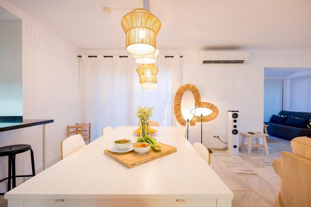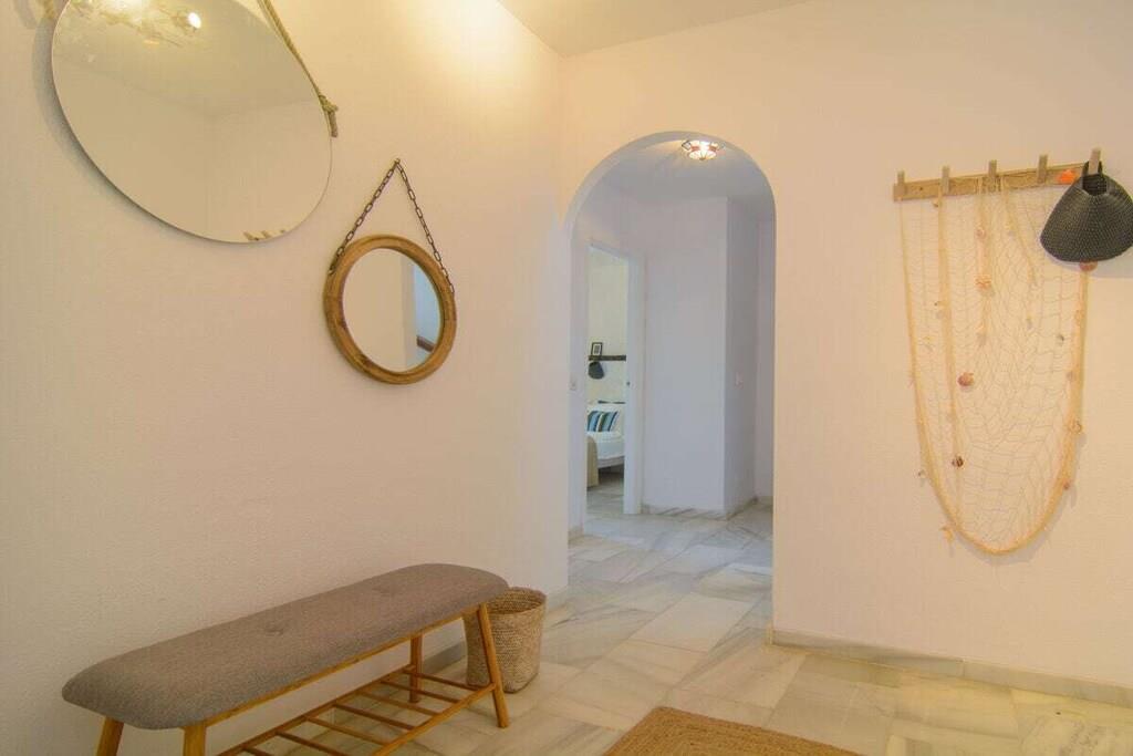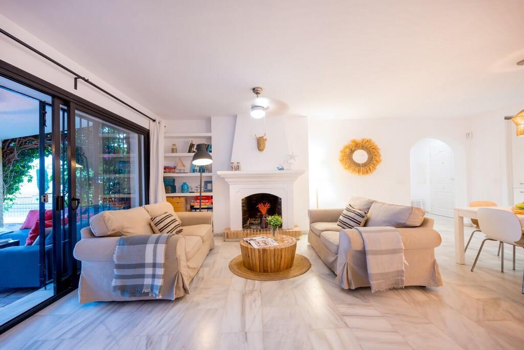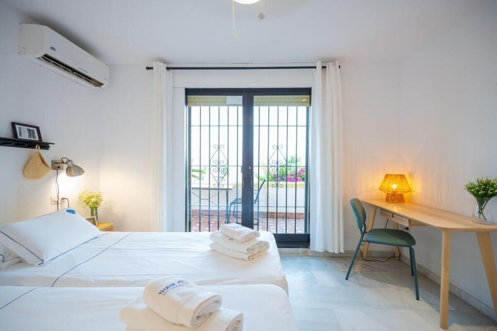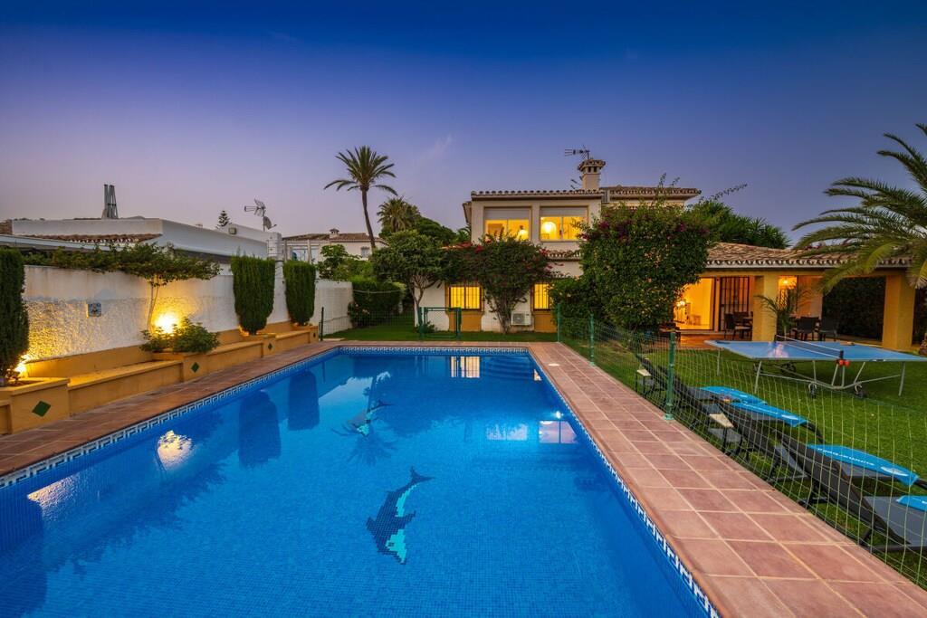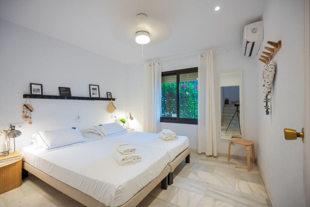 Genießen Sie die Schönheit und Authentizität dieses typischen Strandhauses mit vier Schlafzimmern in Las Chapas Playa. Die Innenräume sind so gestaltet, dass sie das Auge erfreuen, die weißen Marmorböden, die einfachen Möbel und die sorgfältig ausgewählten Dekorationen schaffen eine ruhige und einladende Atmosphäre. Der Garten und die Terrassen, der Pool (9mx5m) und die Tischtennisplatte, die Nähe zum Strand vervollständigen die Freude an einem unvergesslichen Urlaub im Kreise der Familie. ~ Innen Das Wohnzimmer dieses schönen Hauses ist die kühle Oase des Anwesens: Marmorfliesen auf dem Boden, dezentes minimalistisches Design, Holzkamin. Die Sitzecke ist mit zwei bequemen Sofas und einer Leselampe am Kamin ausgestattet. Der Essbereich befindet sich neben der offenen Küche und hat einen Holztisch für sechs Personen. Die Küche ist mit allen notwendigen Utensilien ausgestattet und verfügt über eine Insel mit zwei Barhockern. Die zweite Sitzecke verfügt über einen Flachbildfernseher vor einem Sofa und bietet direkten Zugang zum Innenhof des Hauses. Die beiden Schlafzimmer im Erdgeschoss haben jeweils zwei Einzelbetten (90x200cm), Klimaanlagen, Nachttische mit Lampen und geräumige Einbauschränke. Das Familienbadezimmer hat zwei getrennte Räume, einen mit Toilette und Waschbecken und einen separaten Raum mit Waschbecken und begehbarer Dusche. Im Erdgeschoss befindet sich eine komplett ausgestattete Waschküche mit Waschmaschine und Trockner. Im Obergeschoss befinden sich die beiden anderen Schlafzimmer, beide mit zwei Einzelbetten (90x200) ausgestattet, mit beeindruckendem Meer- und Poolblick. Das Hauptschlafzimmer hat einen kleinen Balkon mit einem Mosaiktisch und zwei Sesseln. Beide Schlafzimmer haben Klimaanlagen. Das Familienbadezimmer hat eine begehbare Dusche und ein Waschbecken. ~ Garten und Terrassen Das Grundstück (600m2) dieser Villa ist aufgeteilt in einen Poolbereich, einen Unterhaltungsbereich mit einer Tischtennisplatte und einen Loungebereich mit Sonnenliegen und einem Sonnenschirm. Sie können die Sonne genießen oder einfach nur im Pool (9mx5m) mit römischer Treppe inmitten eines Gartens mit frisch geschnittenem Gras und exotischer Vegetation verweilen. Auf der Terrasse befindet sich ein Esstisch mit 8 Rattansesseln. Die Sitzecke ist mit einem kleinen Couchtisch und Rattansesseln ausgestattet. Ausstattung: Flachbildfernseher (1), DVD-Player, Klimaanlage, Toaster, Bügeleisen, Bügelbrett, Geschirrspüler, Backofen, Mikrowelle, Kühlschrank, Gefrierschrank, Waschmaschine, Trockner, Espresso mit Kapseln, Wasserkocher, Vitro-Keramik, Herd, Küchenutensilien, Haartrockner. Räume: 4 Schlafzimmer, 2 Bäder, großes Wohnzimmer mit Essbereich und zwei Sitzecken, 1 offene Küche. Möbel: Einzelbetten (8), Außentisch mit Sitzgelegenheiten (8), Terrassensofas mit Couchtisch, Esstisch mit Sitzgelegenheiten (8), Liegestühle (6). Sonstiges: Internet, Bettwäsche und Handtücher inklusive. Draußen: Terrasse, Balkon, privater Außenpool (9mx5m), privater Garten, Parkplatz auf der Straße, Tischtennisplatte, Liegestühle.