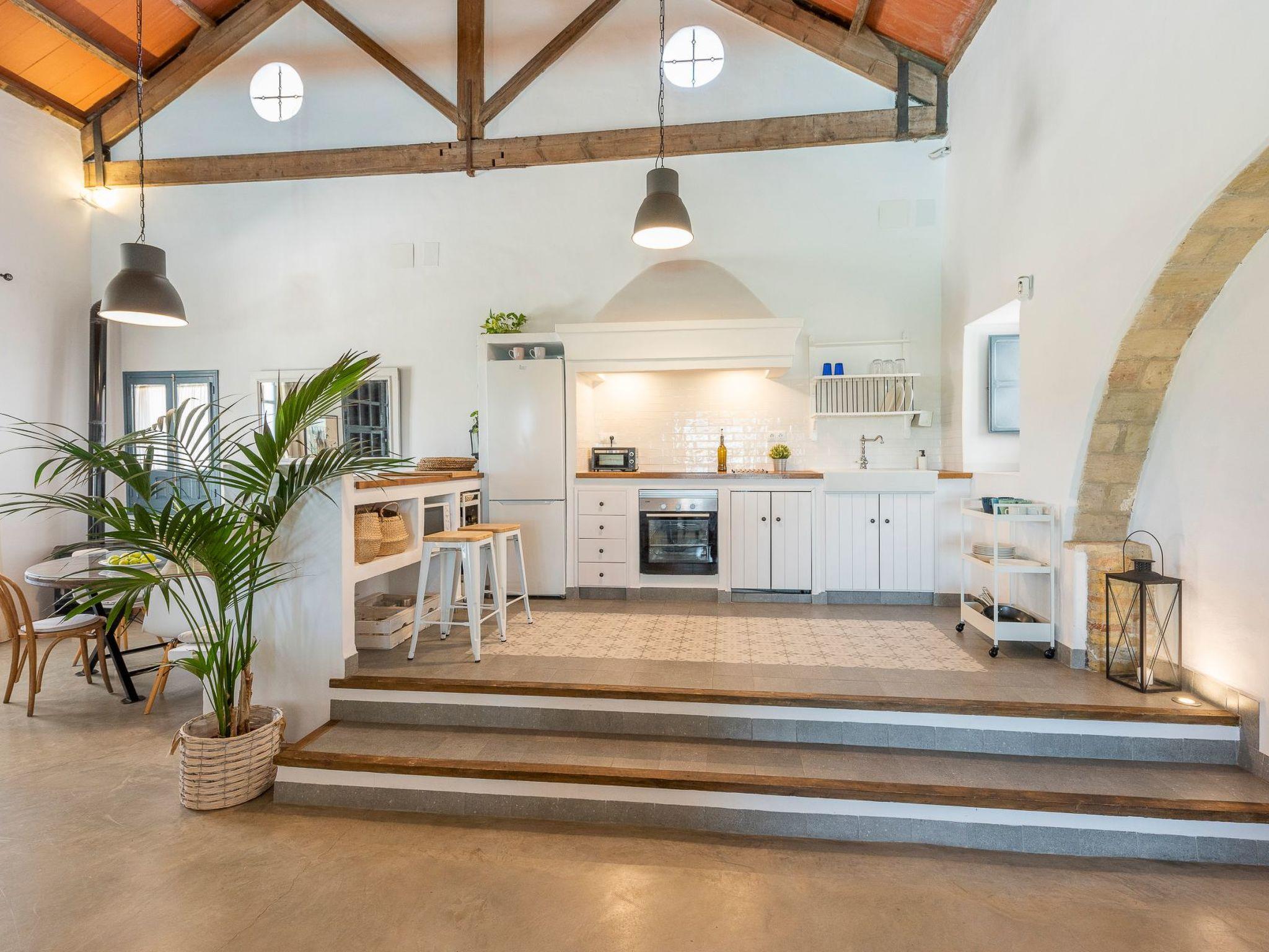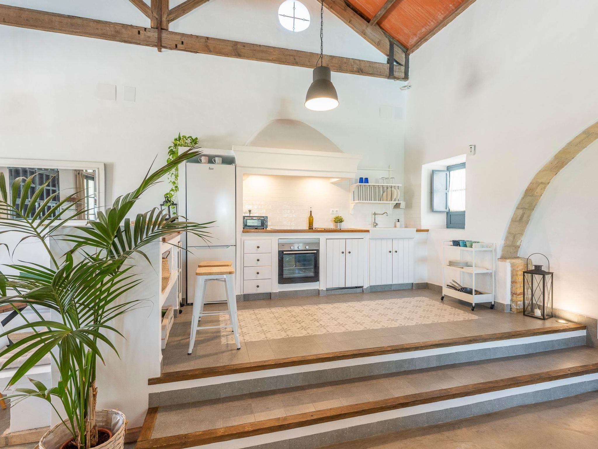 Kitchen open to the living room with fully equipped, ceramic hob, oven, dishwasher, coffee maker,...