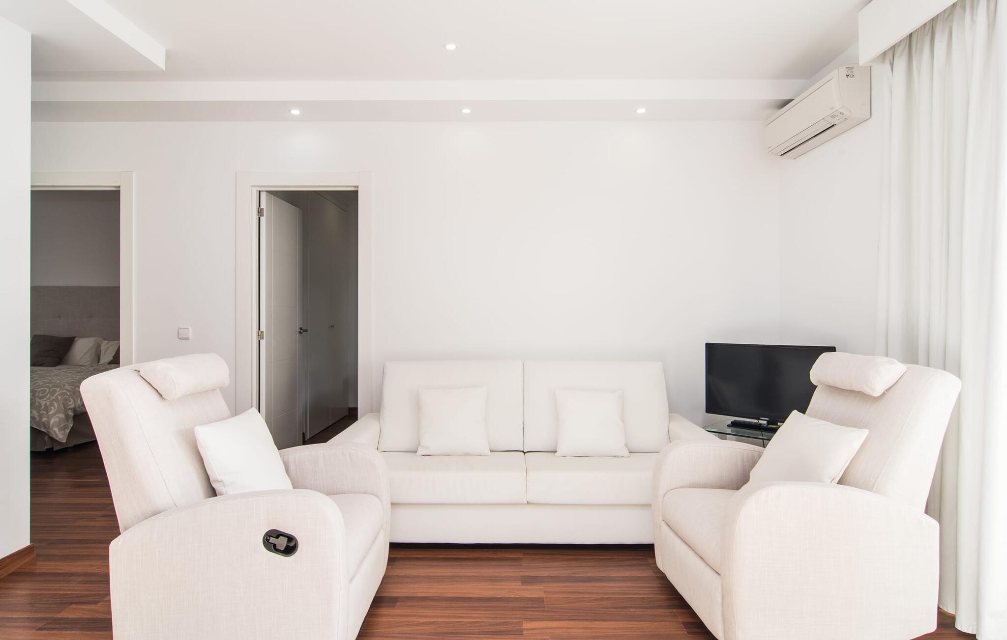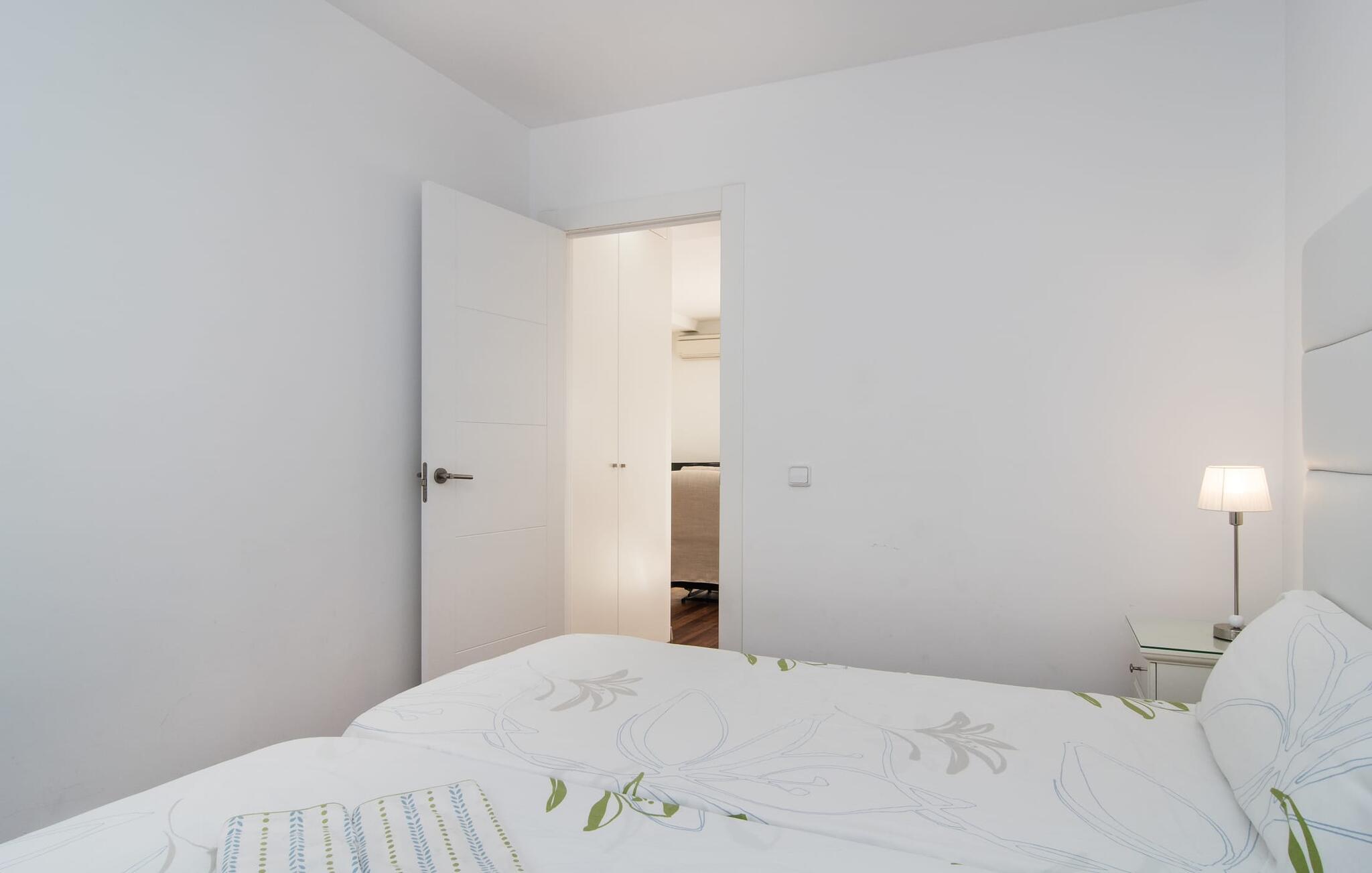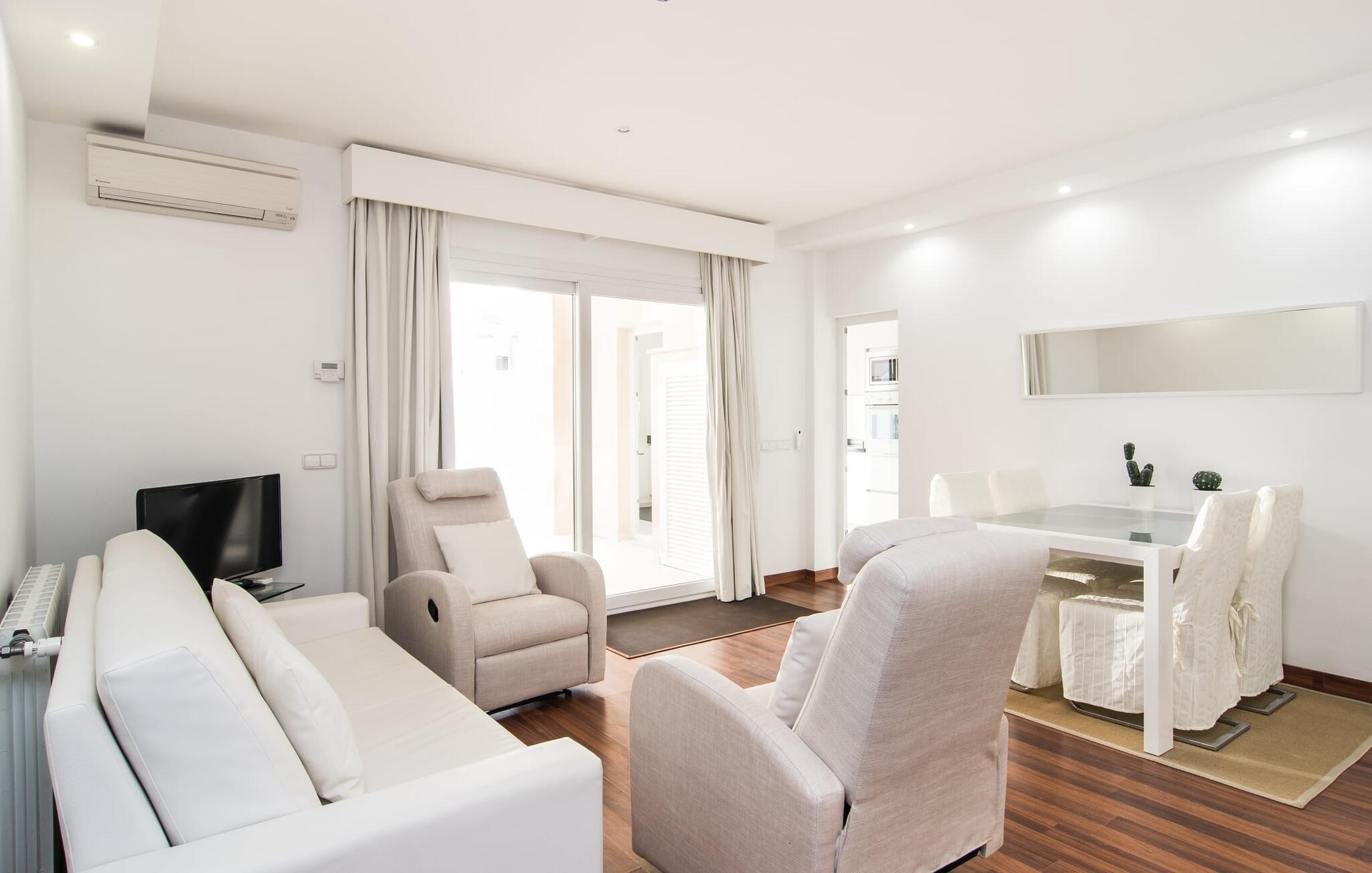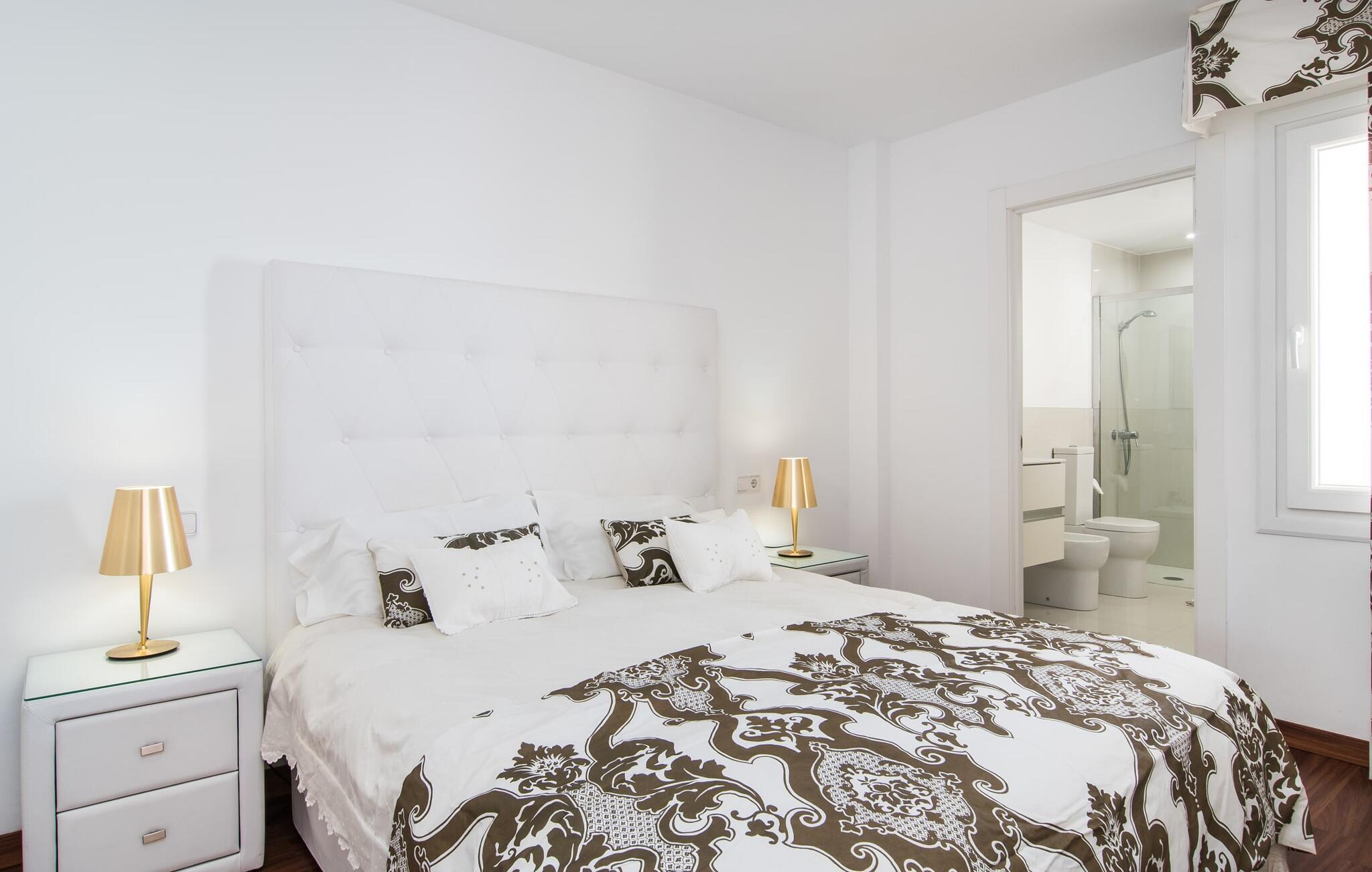 I den helt hvide "Marieta Bajos" kan I lade jeres egne farver skinne og nyde den behagelige kølighed i rummene. Vinduer og døre slipper lys og luft ind (der er også ventilatorer og aircondition), men samtidig trækker indretningen sig markant tilbage fra det, der sker udenfor. Det betyder, at I hurtigt kan slappe af efter en dag på havet og ikke bliver distraheret af andre indtryk. Tre mindre soveværelser er samlet omkring stue/spisestue med udgang til terrasse og køkken. En dobbeltseng (1,60 x 2 m) og senge med enkeltmadrasser (0,90 x 2 m) er til rådighed, og indbyggede overskabe skaber plads. Der er to moderne badeværelser med walk-in brusere (hvoraf det ene er en suite), og den udendørs bruser kan bruges til forfriskning. Med vaskemaskine og tørretumbler i det ekstra værelse gør denne ferielejlighed jer velegnet til strande, udflugter og vandsport, selv med lille bagage.