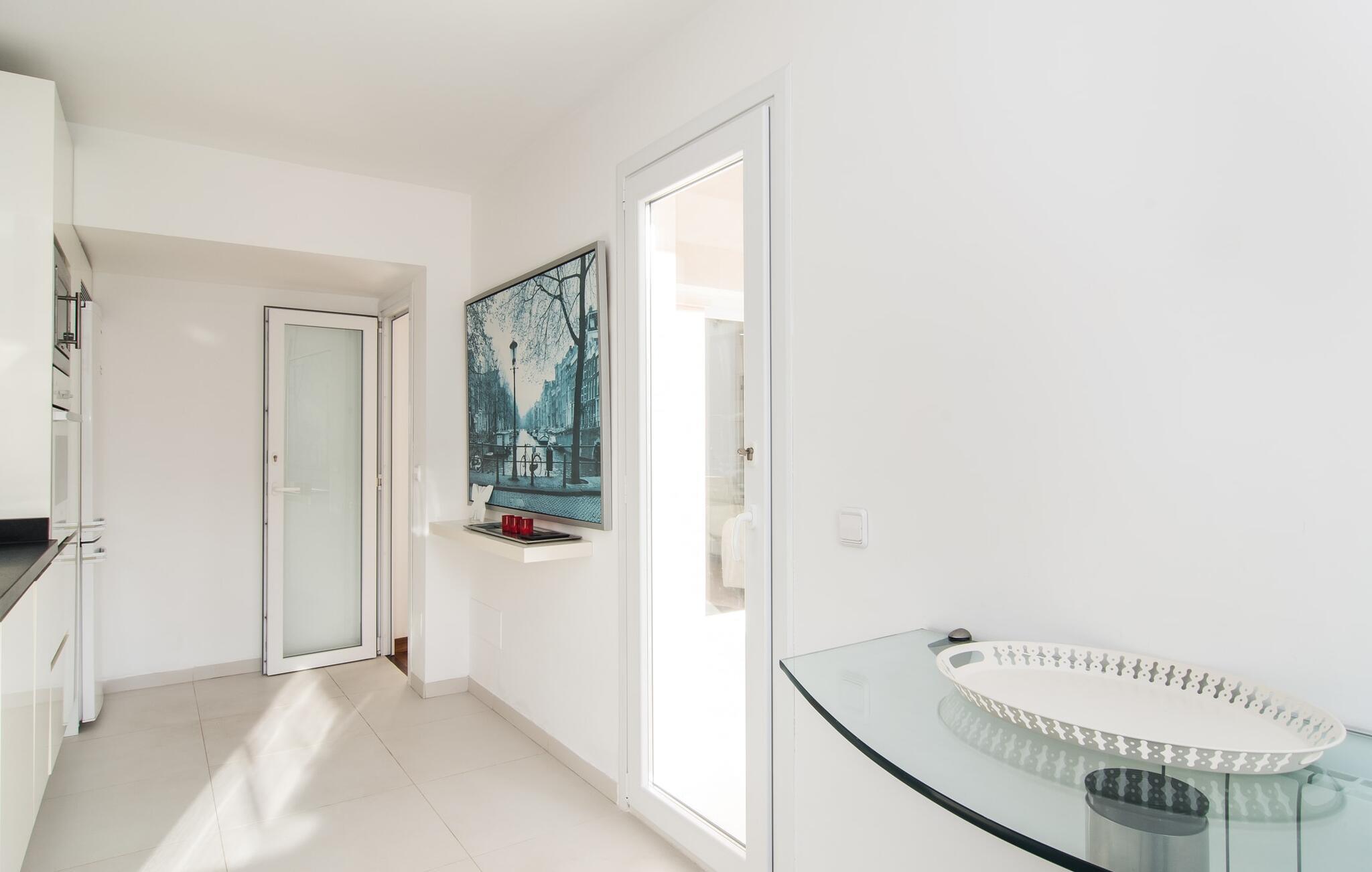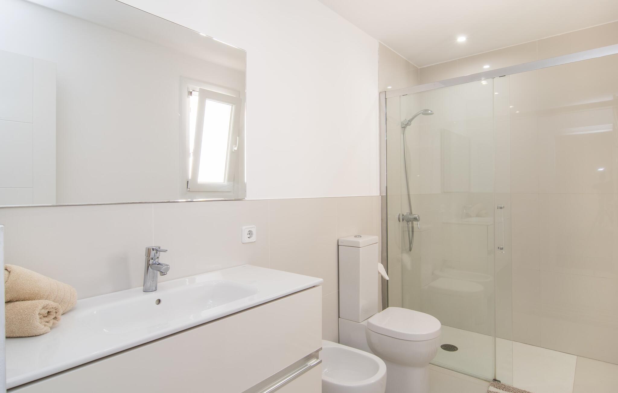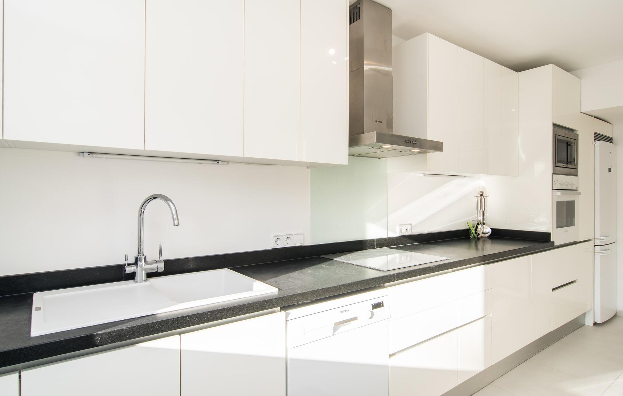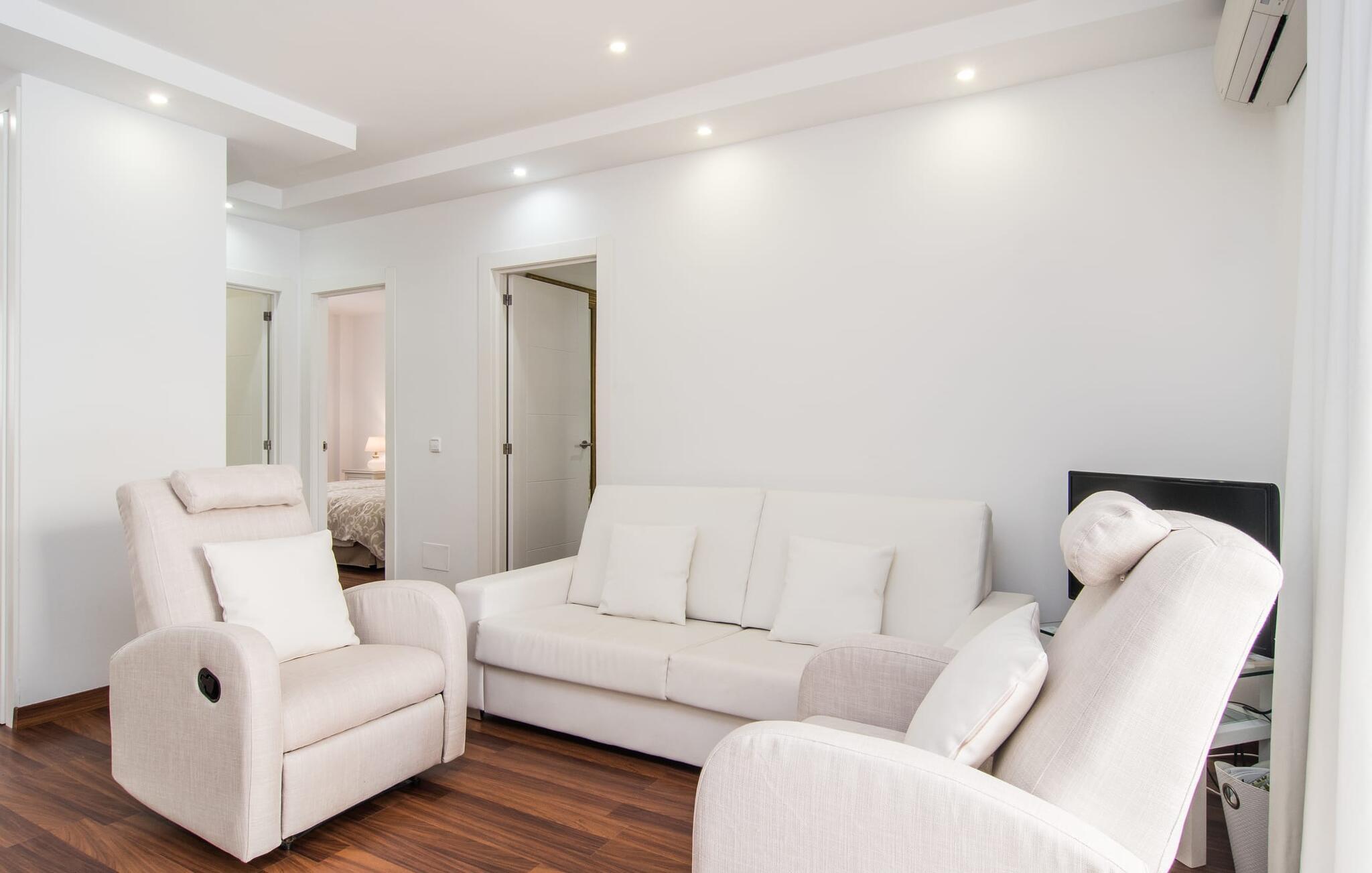 I den helt hvide "Marieta Bajos" kan I lade jeres egne farver skinne og nyde den behagelige kølighed i rummene. Vinduer og døre slipper lys og luft ind (der er også ventilatorer og aircondition), men samtidig trækker indretningen sig markant tilbage fra det, der sker udenfor. Det betyder, at I hurtigt kan slappe af efter en dag på havet og ikke bliver distraheret af andre indtryk. Tre mindre soveværelser er samlet omkring stue/spisestue med udgang til terrasse og køkken. En dobbeltseng (1,60 x 2 m) og senge med enkeltmadrasser (0,90 x 2 m) er til rådighed, og indbyggede overskabe skaber plads. Der er to moderne badeværelser med walk-in brusere (hvoraf det ene er en suite), og den udendørs bruser kan bruges til forfriskning. Med vaskemaskine og tørretumbler i det ekstra værelse gør denne ferielejlighed jer velegnet til strande, udflugter og vandsport, selv med lille bagage.