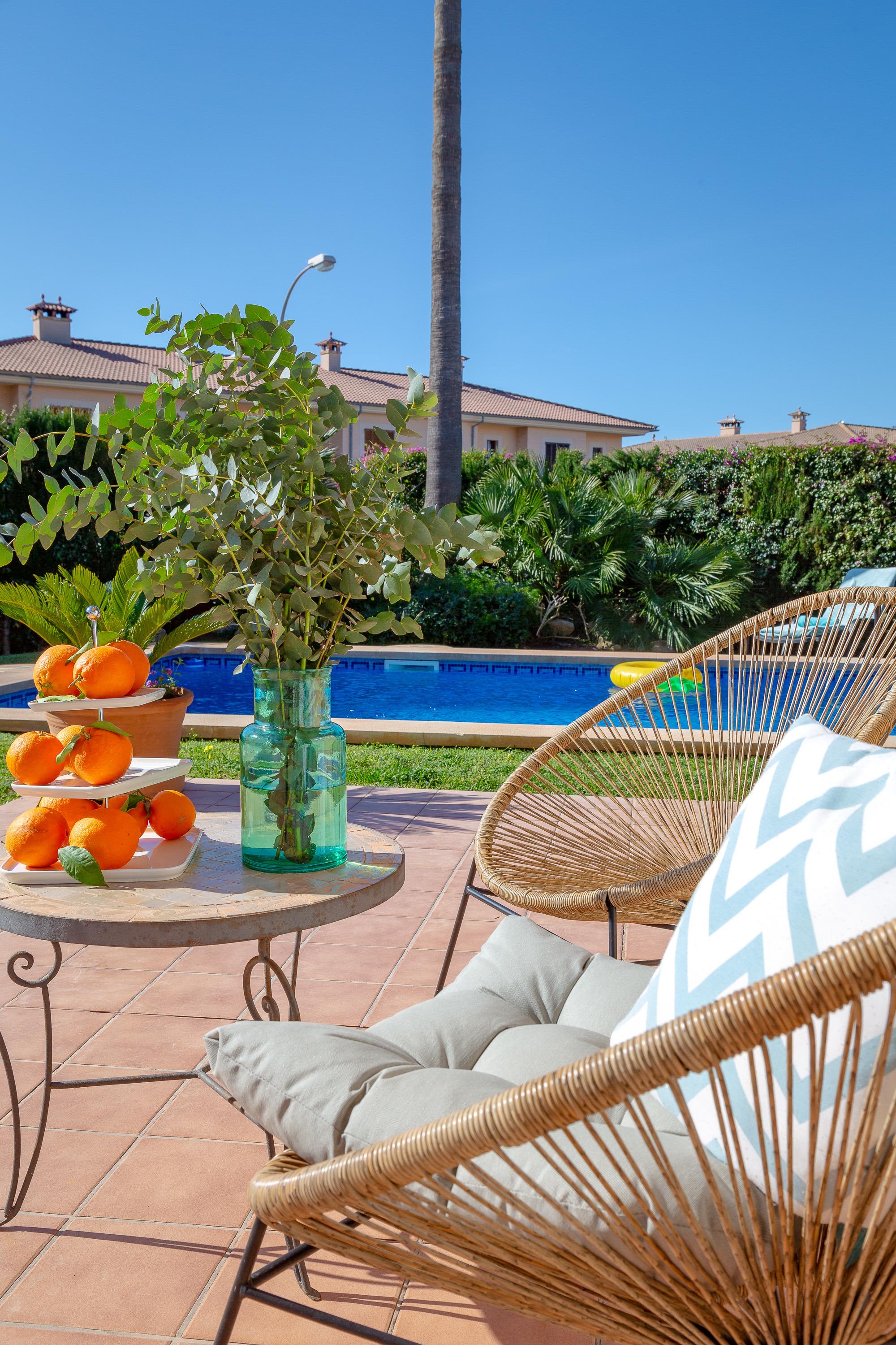 Der weitläufige, mediterrane Garten mit altem Olivenbaum, Palmen und blühenden Bougainvillea-Hecken ist eine wahre Oase der Ruhe. Der große 8x4 m Pool bietet die perfekte Erfrischung, während der Grillbereich zu geselligen Abenden unter Mallorcas Sternenhimmel einlädt.