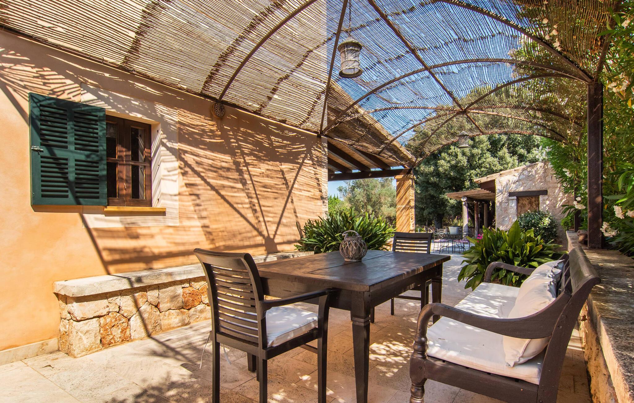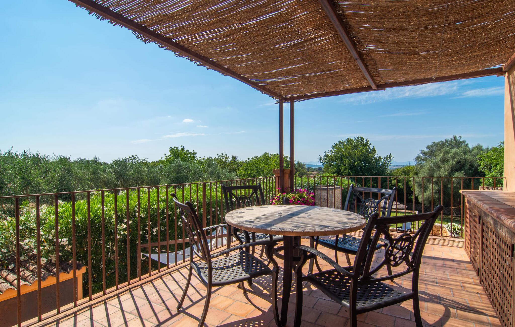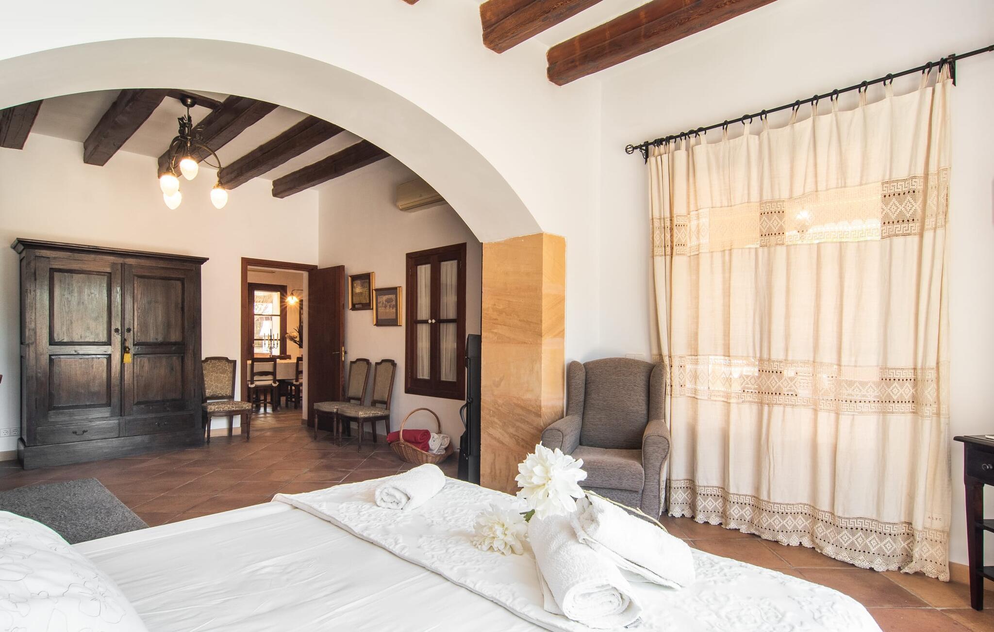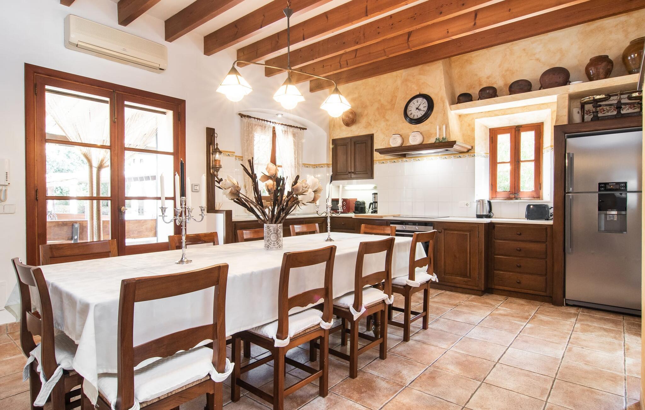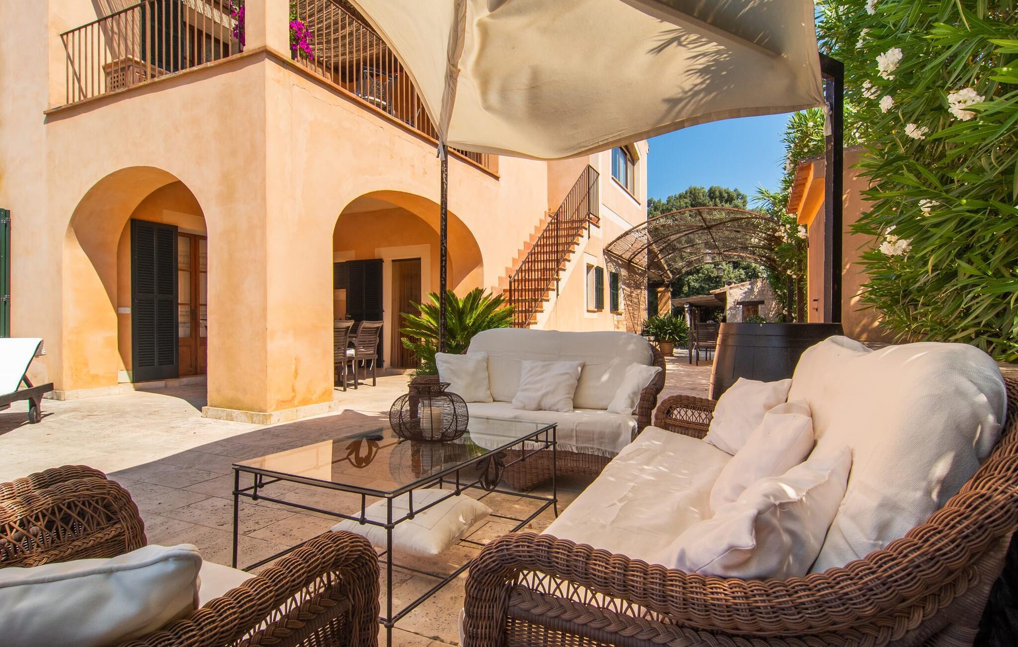 "Martijoan" er et glimrende eksempel på et privat mallorcansk landsted. Vores luftfotos fremhæver placeringen ved "Campo", selvom du allerede kan se Manacors skyline i baggrunden. Området er domineret af landbrugsjord, som sammen med den smukke have tilføjer villaens charme. Gå en rolig tur rundt i ejendommen, hvor du finder attraktive siddepladser både i haven og i huset. Skyggefulde terrasser med daybeds, morgenmadssteder til din morgenkaffe, bambus- eller stofparasoller med fede møbler, en spiseplads på verandaen, et opholdsområde på altanen ovenpå, det hyggelige hjørne i haven foran dammen - disse er bare nogle få af de områder, der er tilgængelige. Det er værd at opdage og vil især glæde dine børn. Ud over opdagelsesturen i det åbne område er der fitness- og spillelokale i garagen til rådighed for store og små. Der er også mål i en fodboldkamp, og intet står i vejen for en bordtennis- eller bordfodboldturnering. To andre højdepunkter skal nævnes: den store pool og det overdækkede udendørs køkken med grill og ovn. Poolen er indlejret i en terrasse udstyret med liggestole og en chill lounge lavet af kurvemøbler. Udetoilettet er særligt praktisk, da det betyder, at du ikke behøver at afbryde dine aktiviteter for længe. I sommerkøkkenet kan du tilberede en grill af frisk fisk, kød og grøntsager og nyde de smagfulde produkter, som Mallorca har at byde på. Dette er et Fincallorca feriehus. Den velholdte nybyggede villa med charmen fra en mallorcansk landejendom byder på et fantastisk layout, perfekt hvis du rejser med to eller flere familier. Huset byder på komplette faciliteter på begge etager, hver med stue og køkken, så I kan tilbringe jeres ferie sammen på trods af at de er noget adskilt. I stueetagen ligger landstedets køkken med pejs ved siden af spisepladsen og grænser op til den åbne opholdsstue. Møblerne er af høj kvalitet og er traditionelt suppleret med antikke møbler. Indretningen ser meget moderne ud, med et strejf af nostalgi. Et klaver supplerer det attraktive "Ensemble des Parterres", som også har to udsøgt møblerede soveværelser med masser af opbevaringsplads og et moderne badeværelse med badekar og bruser. Ovenpå finder du et lignende anlæg med en stue, et meget moderne, fuldt udstyret køkken arrangeret omkring en hyggelig ø og en pejs. Tre soveværelser med aircondition, komfortable dobbeltsenge og et moderne brusebad fuldender denne selvforsynende boligenhed, som derfor er perfekt til en anden familie. På øverste etage er der desuden en overdækket altan med pooludsigt, hvor I kan tilbringe hyggelige timer med en smuk udsigt. Denne opdeling giver en større rejsegruppe meget behagelig autonomi - den ene ferierytme forstyrrer ikke den anden, og samværet med at grille og lege er udelukkende til afslapning. Lille bemærkning: På grund af en aktuel teknisk indstilling på den digitale elmåler skal de tre klimaanlæg tændes efter hinanden og kan ikke bruges samtidigt. Hvis en familie bevidst vælger en landvilla, som det er tilfældet med den anbefalede "Martijoan", kan de føle sig særligt frie. Det er endnu pænere, når du næsten er inden for synsvidde af en by. Da den alsidige villa er bekvemt placeret i nærheden af en vej, der nogle gange er hørbar, kan Manacor nås på 5 minutter i bil. Manacor er dog ikke en hvilken som helst by, men den næststørste på Mallorca. Oversat betyder navnet "hånden på hjertet", og det afspejler virkelig, hvor smuk byen er. Den er ikke kun kendt for sin perleindustri, men også for keramik, vin og meget mere. Der er et frugt- og grøntsagsmarked hver dag (undtagen søndage) på Placa Constitucio. Alt er perfekt til en selvbestemt ferie med venner og familie. Det vidunderlige layout og fantastiske indretning af den familievenlige villa "Martijoan" er ideelle til to familier, der rejser sammen. Huset er omgivet af et skønt havelandskab med mange detaljer og ligger helt landligt, ca 3 km fra Manacor. Her kan du gøre dine daglige indkøb eller nyde en omfattende shoppingtur. Fantastisk smukke strande, som er relativt ukendte for turister, såsom Cala Varques, kan nemt nås i bil.