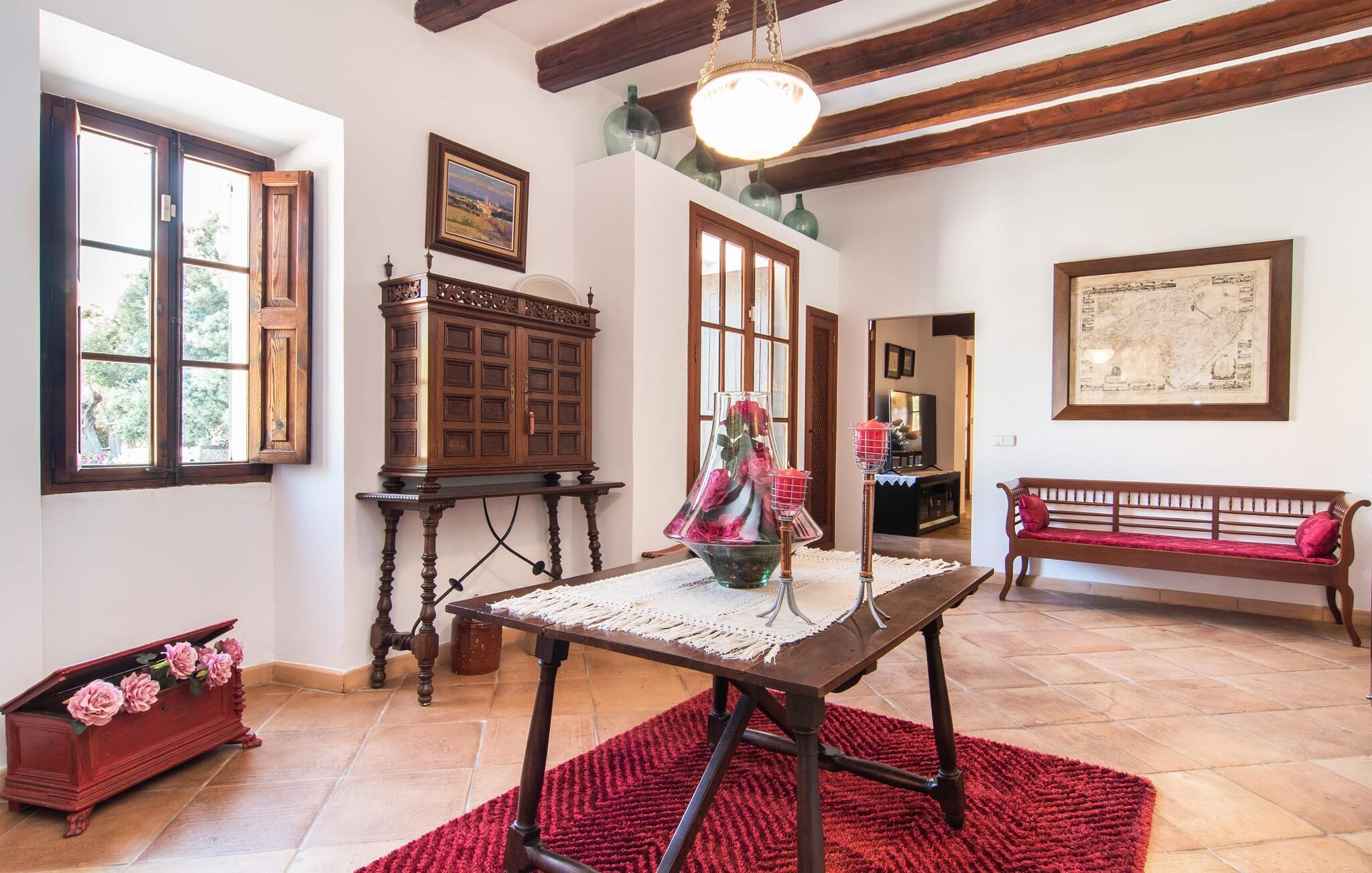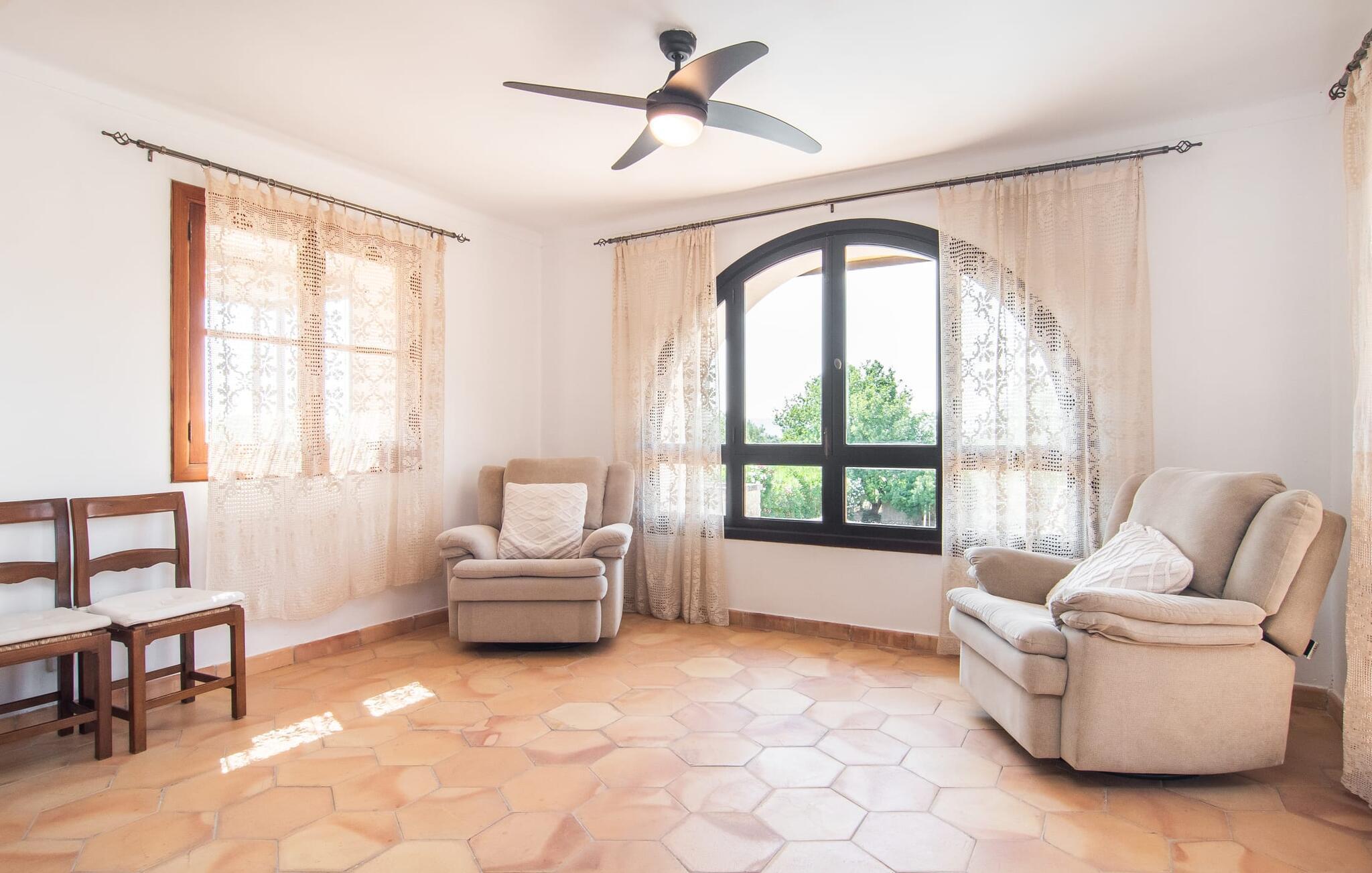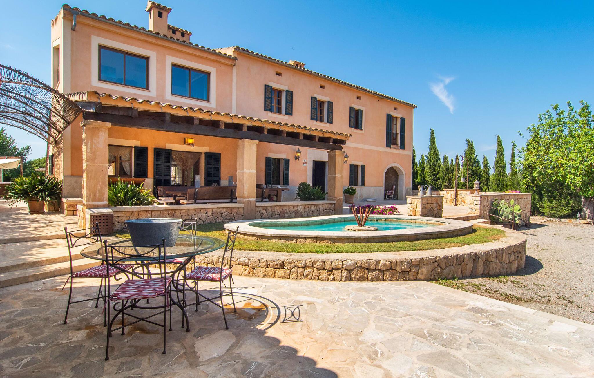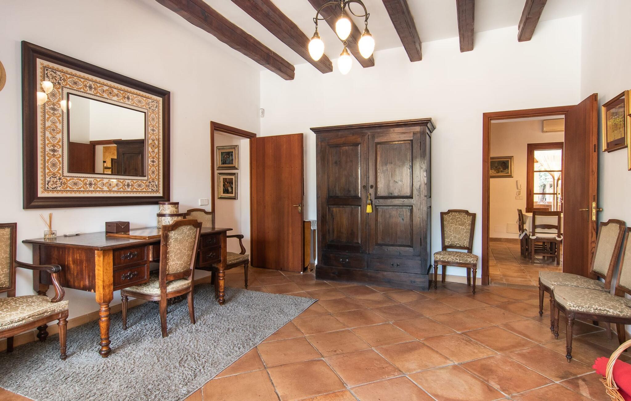 "Martijoan" er et glimrende eksempel på et privat mallorcansk landsted. Vores luftfotos fremhæver placeringen ved "Campo", selvom du allerede kan se Manacors skyline i baggrunden. Området er domineret af landbrugsjord, som sammen med den smukke have tilføjer villaens charme. Gå en rolig tur rundt i ejendommen, hvor du finder attraktive siddepladser både i haven og i huset. Skyggefulde terrasser med daybeds, morgenmadssteder til din morgenkaffe, bambus- eller stofparasoller med fede møbler, en spiseplads på verandaen, et opholdsområde på altanen ovenpå, det hyggelige hjørne i haven foran dammen - disse er bare nogle få af de områder, der er tilgængelige. Det er værd at opdage og vil især glæde dine børn. Ud over opdagelsesturen i det åbne område er der fitness- og spillelokale i garagen til rådighed for store og små. Der er også mål i en fodboldkamp, og intet står i vejen for en bordtennis- eller bordfodboldturnering. To andre højdepunkter skal nævnes: den store pool og det overdækkede udendørs køkken med grill og ovn. Poolen er indlejret i en terrasse udstyret med liggestole og en chill lounge lavet af kurvemøbler. Udetoilettet er særligt praktisk, da det betyder, at du ikke behøver at afbryde dine aktiviteter for længe. I sommerkøkkenet kan du tilberede en grill af frisk fisk, kød og grøntsager og nyde de smagfulde produkter, som Mallorca har at byde på. Dette er et Fincallorca feriehus. Den velholdte nybyggede villa med charmen fra en mallorcansk landejendom byder på et fantastisk layout, perfekt hvis du rejser med to eller flere familier. Huset byder på komplette faciliteter på begge etager, hver med stue og køkken, så I kan tilbringe jeres ferie sammen på trods af at de er noget adskilt. I stueetagen ligger landstedets køkken med pejs ved siden af spisepladsen og grænser op til den åbne opholdsstue. Møblerne er af høj kvalitet og er traditionelt suppleret med antikke møbler. Indretningen ser meget moderne ud, med et strejf af nostalgi. Et klaver supplerer det attraktive "Ensemble des Parterres", som også har to udsøgt møblerede soveværelser med masser af opbevaringsplads og et moderne badeværelse med badekar og bruser. Ovenpå finder du et lignende anlæg med en stue, et meget moderne, fuldt udstyret køkken arrangeret omkring en hyggelig ø og en pejs. Tre soveværelser med aircondition, komfortable dobbeltsenge og et moderne brusebad fuldender denne selvforsynende boligenhed, som derfor er perfekt til en anden familie. På øverste etage er der desuden en overdækket altan med pooludsigt, hvor I kan tilbringe hyggelige timer med en smuk udsigt. Denne opdeling giver en større rejsegruppe meget behagelig autonomi - den ene ferierytme forstyrrer ikke den anden, og samværet med at grille og lege er udelukkende til afslapning. Lille bemærkning: På grund af en aktuel teknisk indstilling på den digitale elmåler skal de tre klimaanlæg tændes efter hinanden og kan ikke bruges samtidigt. Hvis en familie bevidst vælger en landvilla, som det er tilfældet med den anbefalede "Martijoan", kan de føle sig særligt frie. Det er endnu pænere, når du næsten er inden for synsvidde af en by. Da den alsidige villa er bekvemt placeret i nærheden af en vej, der nogle gange er hørbar, kan Manacor nås på 5 minutter i bil. Manacor er dog ikke en hvilken som helst by, men den næststørste på Mallorca. Oversat betyder navnet "hånden på hjertet", og det afspejler virkelig, hvor smuk byen er. Den er ikke kun kendt for sin perleindustri, men også for keramik, vin og meget mere. Der er et frugt- og grøntsagsmarked hver dag (undtagen søndage) på Placa Constitucio. Alt er perfekt til en selvbestemt ferie med venner og familie. Det vidunderlige layout og fantastiske indretning af den familievenlige villa "Martijoan" er ideelle til to familier, der rejser sammen. Huset er omgivet af et skønt havelandskab med mange detaljer og ligger helt landligt, ca 3 km fra Manacor. Her kan du gøre dine daglige indkøb eller nyde en omfattende shoppingtur. Fantastisk smukke strande, som er relativt ukendte for turister, såsom Cala Varques, kan nemt nås i bil.