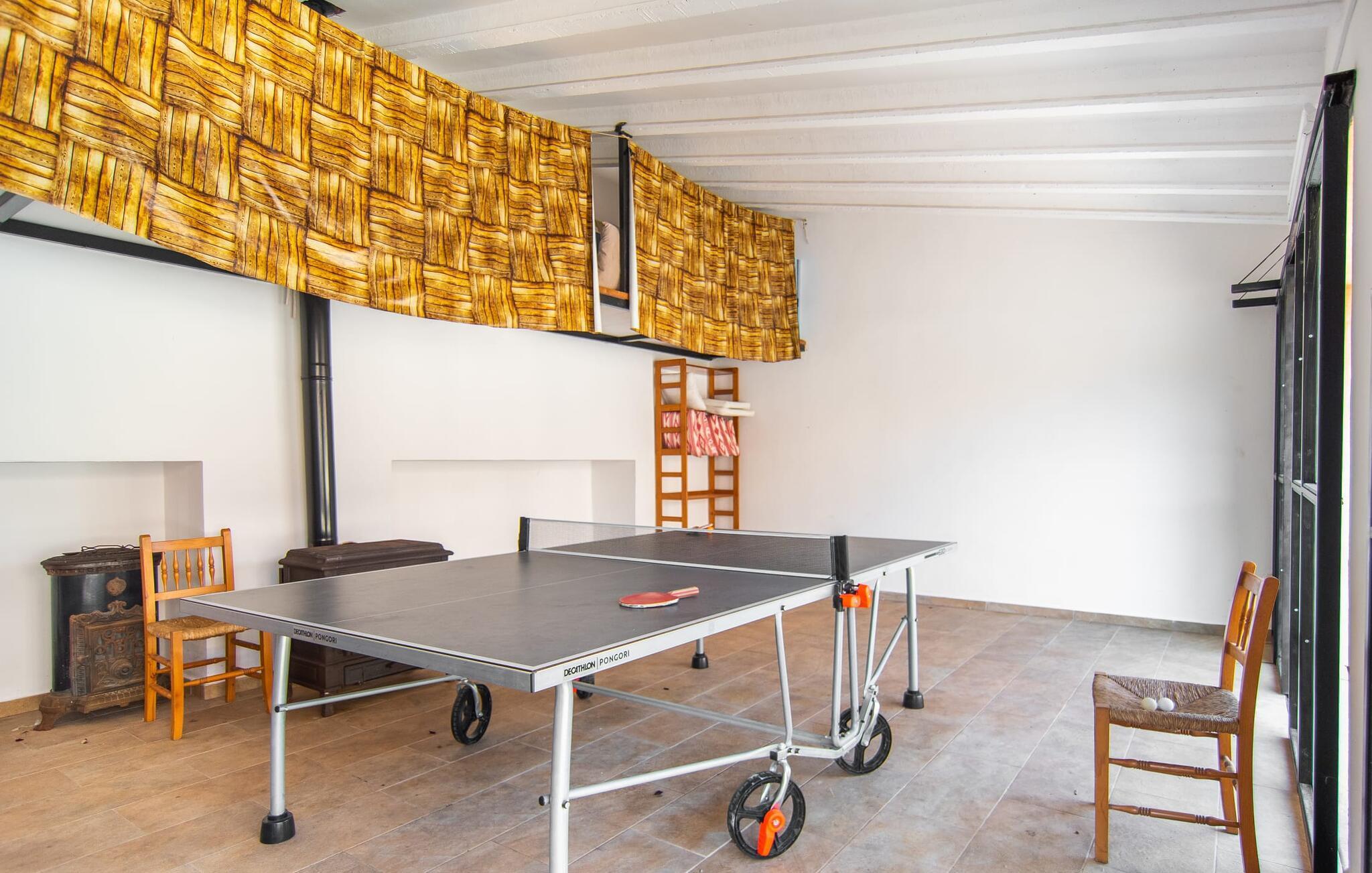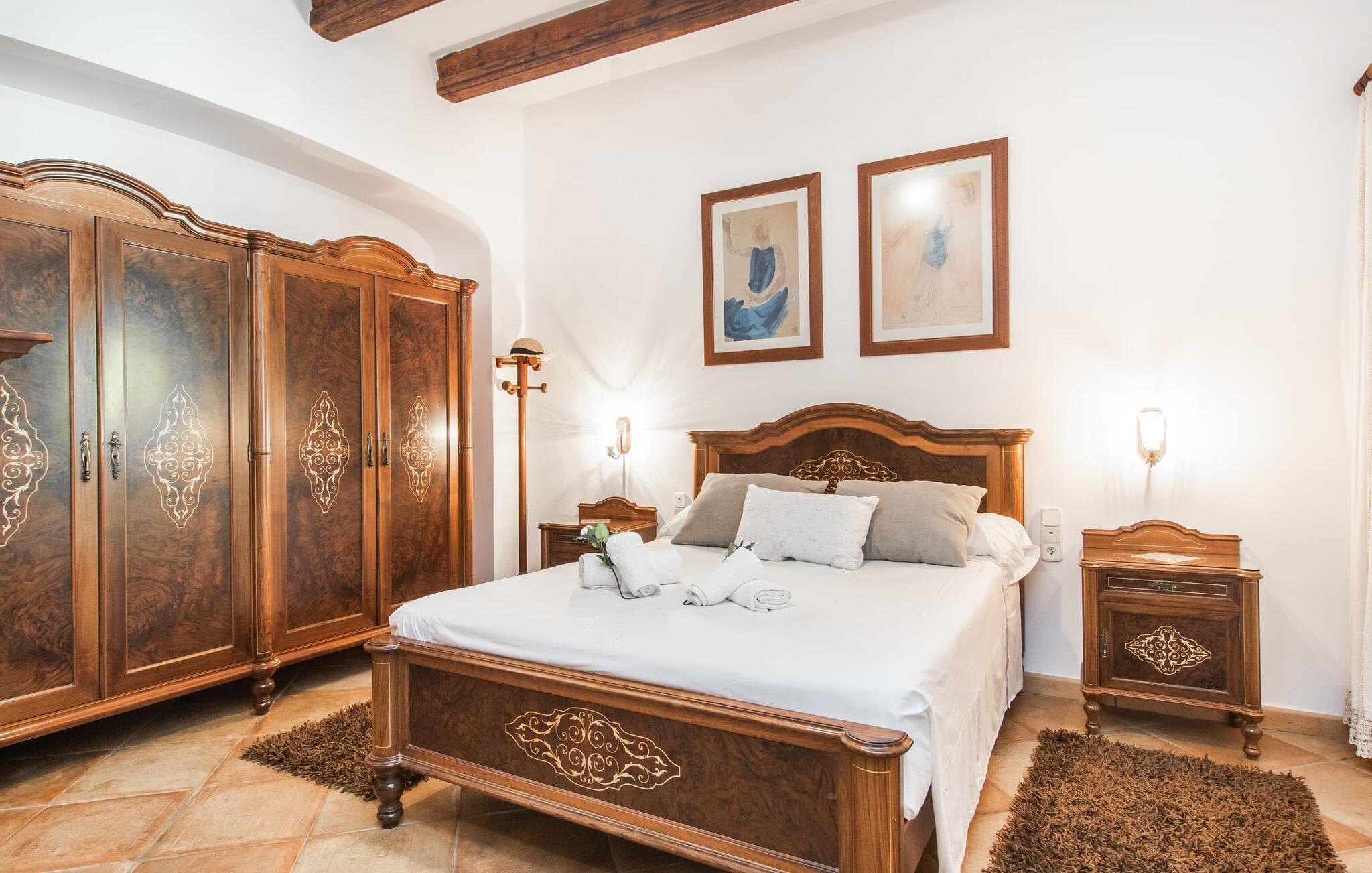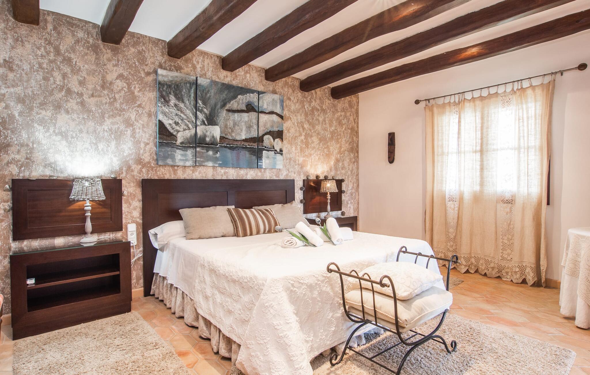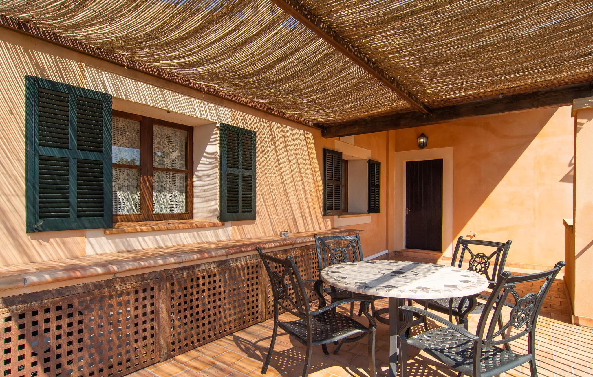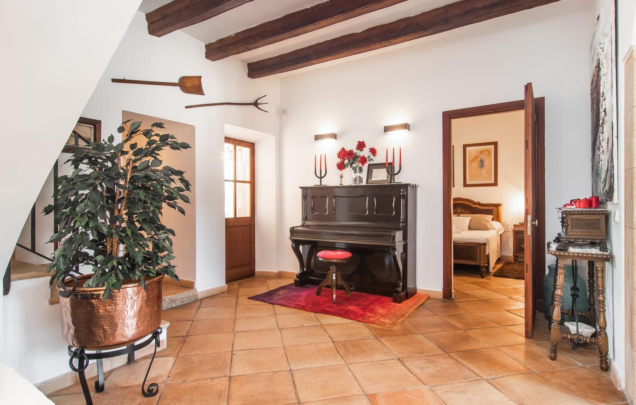 "Martijoan" er et glimrende eksempel på et privat mallorcansk landsted. Vores luftfotos fremhæver placeringen ved "Campo", selvom du allerede kan se Manacors skyline i baggrunden. Området er domineret af landbrugsjord, som sammen med den smukke have tilføjer villaens charme. Gå en rolig tur rundt i ejendommen, hvor du finder attraktive siddepladser både i haven og i huset. Skyggefulde terrasser med daybeds, morgenmadssteder til din morgenkaffe, bambus- eller stofparasoller med fede møbler, en spiseplads på verandaen, et opholdsområde på altanen ovenpå, det hyggelige hjørne i haven foran dammen - disse er bare nogle få af de områder, der er tilgængelige. Det er værd at opdage og vil især glæde dine børn. Ud over opdagelsesturen i det åbne område er der fitness- og spillelokale i garagen til rådighed for store og små. Der er også mål i en fodboldkamp, og intet står i vejen for en bordtennis- eller bordfodboldturnering. To andre højdepunkter skal nævnes: den store pool og det overdækkede udendørs køkken med grill og ovn. Poolen er indlejret i en terrasse udstyret med liggestole og en chill lounge lavet af kurvemøbler. Udetoilettet er særligt praktisk, da det betyder, at du ikke behøver at afbryde dine aktiviteter for længe. I sommerkøkkenet kan du tilberede en grill af frisk fisk, kød og grøntsager og nyde de smagfulde produkter, som Mallorca har at byde på. Dette er et Fincallorca feriehus. Den velholdte nybyggede villa med charmen fra en mallorcansk landejendom byder på et fantastisk layout, perfekt hvis du rejser med to eller flere familier. Huset byder på komplette faciliteter på begge etager, hver med stue og køkken, så I kan tilbringe jeres ferie sammen på trods af at de er noget adskilt. I stueetagen ligger landstedets køkken med pejs ved siden af spisepladsen og grænser op til den åbne opholdsstue. Møblerne er af høj kvalitet og er traditionelt suppleret med antikke møbler. Indretningen ser meget moderne ud, med et strejf af nostalgi. Et klaver supplerer det attraktive "Ensemble des Parterres", som også har to udsøgt møblerede soveværelser med masser af opbevaringsplads og et moderne badeværelse med badekar og bruser. Ovenpå finder du et lignende anlæg med en stue, et meget moderne, fuldt udstyret køkken arrangeret omkring en hyggelig ø og en pejs. Tre soveværelser med aircondition, komfortable dobbeltsenge og et moderne brusebad fuldender denne selvforsynende boligenhed, som derfor er perfekt til en anden familie. På øverste etage er der desuden en overdækket altan med pooludsigt, hvor I kan tilbringe hyggelige timer med en smuk udsigt. Denne opdeling giver en større rejsegruppe meget behagelig autonomi - den ene ferierytme forstyrrer ikke den anden, og samværet med at grille og lege er udelukkende til afslapning. Lille bemærkning: På grund af en aktuel teknisk indstilling på den digitale elmåler skal de tre klimaanlæg tændes efter hinanden og kan ikke bruges samtidigt. Hvis en familie bevidst vælger en landvilla, som det er tilfældet med den anbefalede "Martijoan", kan de føle sig særligt frie. Det er endnu pænere, når du næsten er inden for synsvidde af en by. Da den alsidige villa er bekvemt placeret i nærheden af en vej, der nogle gange er hørbar, kan Manacor nås på 5 minutter i bil. Manacor er dog ikke en hvilken som helst by, men den næststørste på Mallorca. Oversat betyder navnet "hånden på hjertet", og det afspejler virkelig, hvor smuk byen er. Den er ikke kun kendt for sin perleindustri, men også for keramik, vin og meget mere. Der er et frugt- og grøntsagsmarked hver dag (undtagen søndage) på Placa Constitucio. Alt er perfekt til en selvbestemt ferie med venner og familie. Det vidunderlige layout og fantastiske indretning af den familievenlige villa "Martijoan" er ideelle til to familier, der rejser sammen. Huset er omgivet af et skønt havelandskab med mange detaljer og ligger helt landligt, ca 3 km fra Manacor. Her kan du gøre dine daglige indkøb eller nyde en omfattende shoppingtur. Fantastisk smukke strande, som er relativt ukendte for turister, såsom Cala Varques, kan nemt nås i bil.