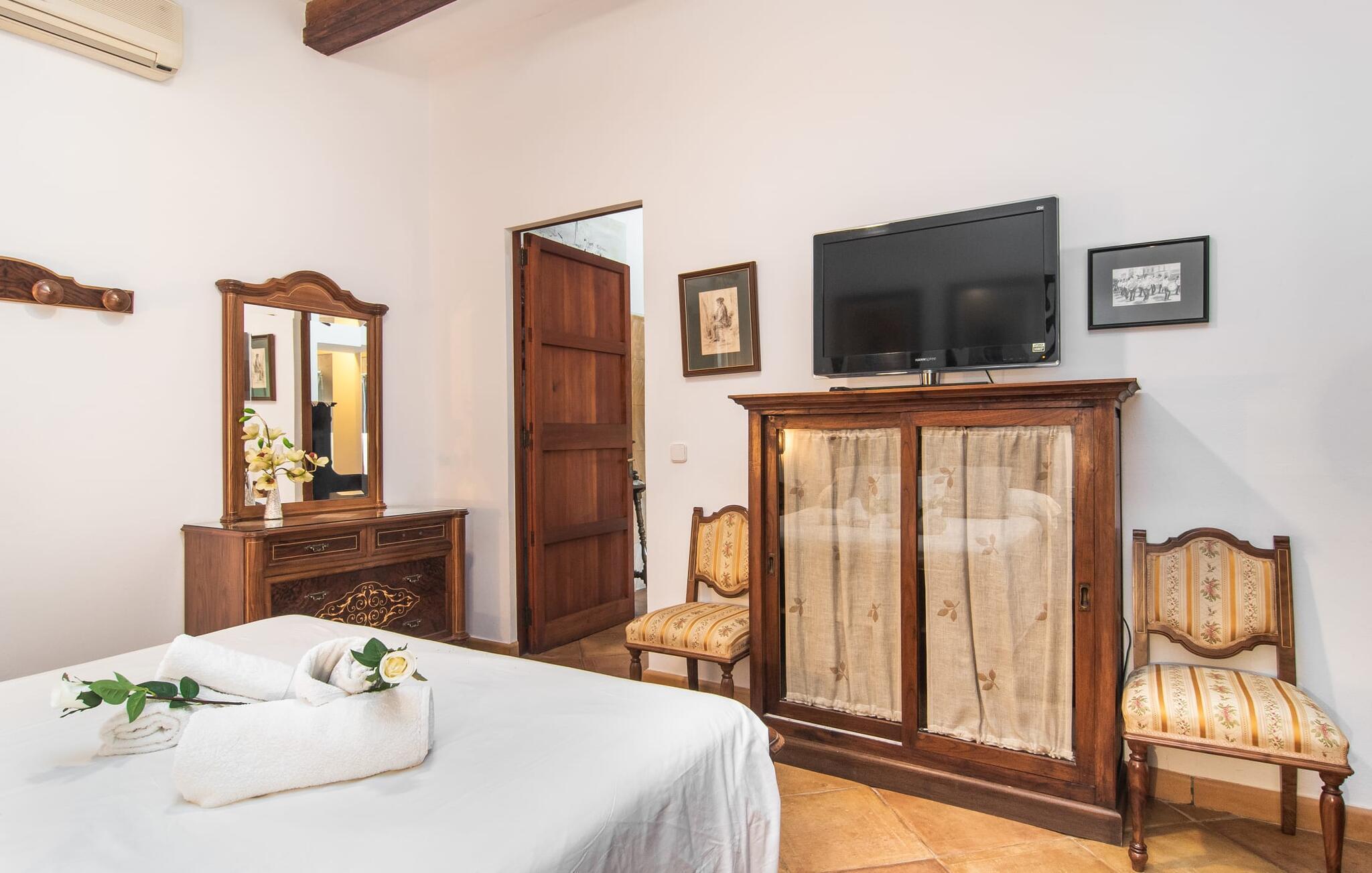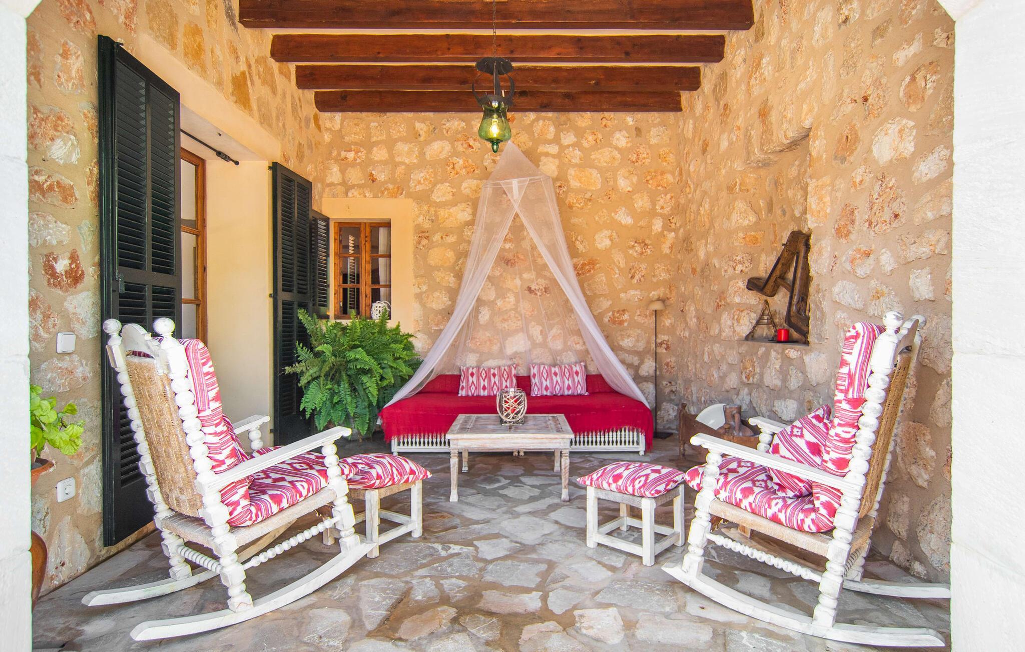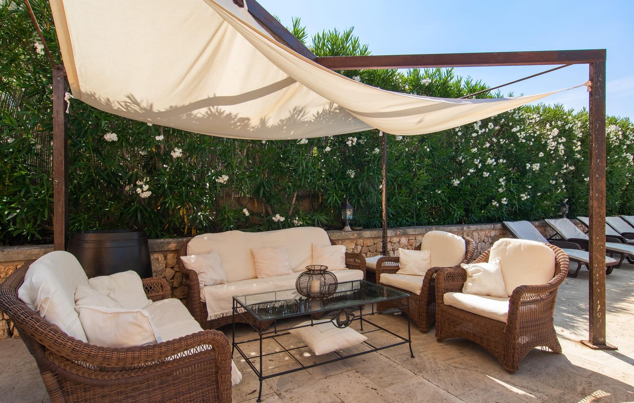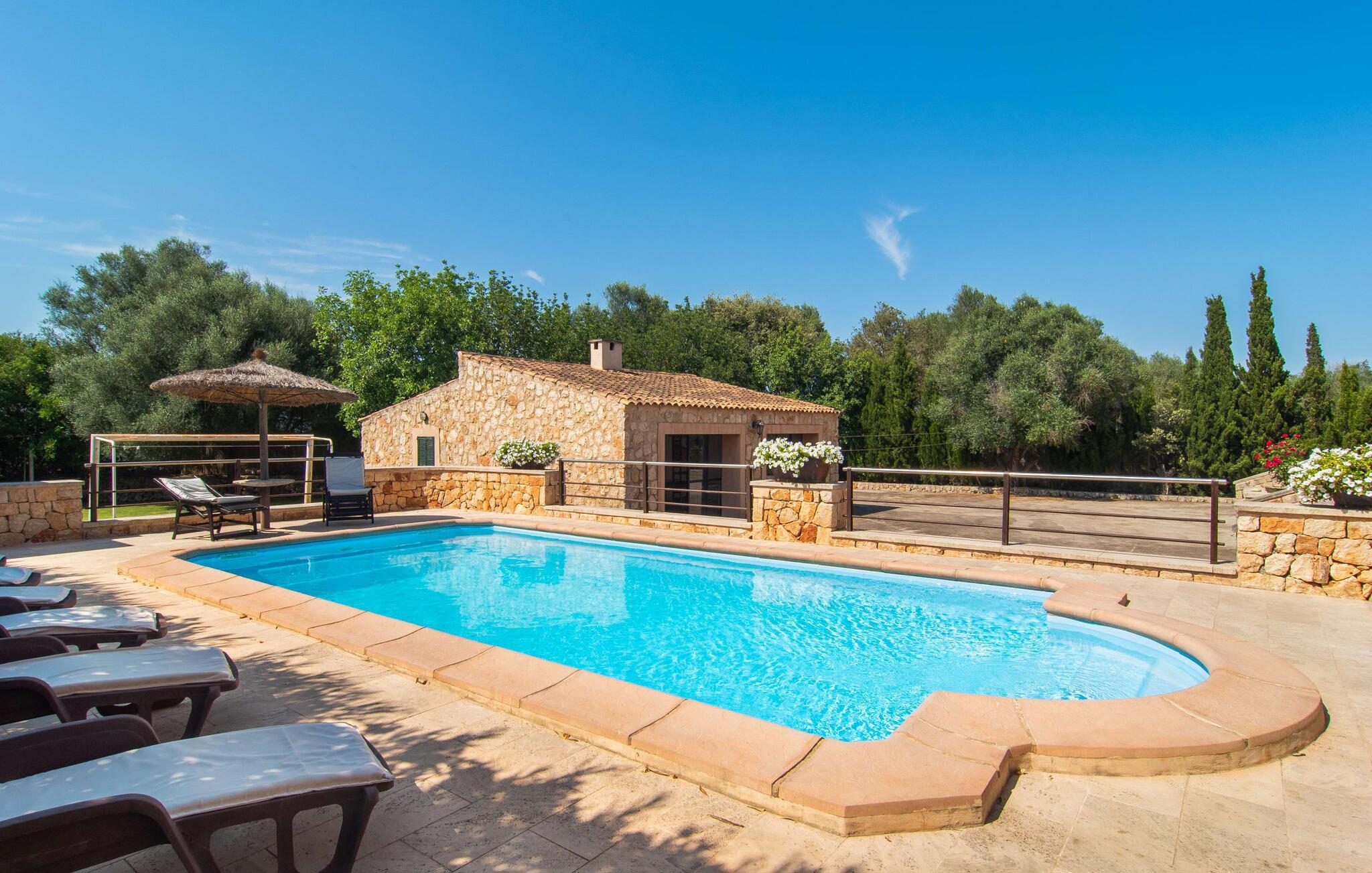 "Martijoan" er et glimrende eksempel på et privat mallorcansk landsted. Vores luftfotos fremhæver placeringen ved "Campo", selvom du allerede kan se Manacors skyline i baggrunden. Området er domineret af landbrugsjord, som sammen med den smukke have tilføjer villaens charme. Gå en rolig tur rundt i ejendommen, hvor du finder attraktive siddepladser både i haven og i huset. Skyggefulde terrasser med daybeds, morgenmadssteder til din morgenkaffe, bambus- eller stofparasoller med fede møbler, en spiseplads på verandaen, et opholdsområde på altanen ovenpå, det hyggelige hjørne i haven foran dammen - disse er bare nogle få af de områder, der er tilgængelige. Det er værd at opdage og vil især glæde dine børn. Ud over opdagelsesturen i det åbne område er der fitness- og spillelokale i garagen til rådighed for store og små. Der er også mål i en fodboldkamp, og intet står i vejen for en bordtennis- eller bordfodboldturnering. To andre højdepunkter skal nævnes: den store pool og det overdækkede udendørs køkken med grill og ovn. Poolen er indlejret i en terrasse udstyret med liggestole og en chill lounge lavet af kurvemøbler. Udetoilettet er særligt praktisk, da det betyder, at du ikke behøver at afbryde dine aktiviteter for længe. I sommerkøkkenet kan du tilberede en grill af frisk fisk, kød og grøntsager og nyde de smagfulde produkter, som Mallorca har at byde på. Dette er et Fincallorca feriehus. Den velholdte nybyggede villa med charmen fra en mallorcansk landejendom byder på et fantastisk layout, perfekt hvis du rejser med to eller flere familier. Huset byder på komplette faciliteter på begge etager, hver med stue og køkken, så I kan tilbringe jeres ferie sammen på trods af at de er noget adskilt. I stueetagen ligger landstedets køkken med pejs ved siden af spisepladsen og grænser op til den åbne opholdsstue. Møblerne er af høj kvalitet og er traditionelt suppleret med antikke møbler. Indretningen ser meget moderne ud, med et strejf af nostalgi. Et klaver supplerer det attraktive "Ensemble des Parterres", som også har to udsøgt møblerede soveværelser med masser af opbevaringsplads og et moderne badeværelse med badekar og bruser. Ovenpå finder du et lignende anlæg med en stue, et meget moderne, fuldt udstyret køkken arrangeret omkring en hyggelig ø og en pejs. Tre soveværelser med aircondition, komfortable dobbeltsenge og et moderne brusebad fuldender denne selvforsynende boligenhed, som derfor er perfekt til en anden familie. På øverste etage er der desuden en overdækket altan med pooludsigt, hvor I kan tilbringe hyggelige timer med en smuk udsigt. Denne opdeling giver en større rejsegruppe meget behagelig autonomi - den ene ferierytme forstyrrer ikke den anden, og samværet med at grille og lege er udelukkende til afslapning. Lille bemærkning: På grund af en aktuel teknisk indstilling på den digitale elmåler skal de tre klimaanlæg tændes efter hinanden og kan ikke bruges samtidigt. Hvis en familie bevidst vælger en landvilla, som det er tilfældet med den anbefalede "Martijoan", kan de føle sig særligt frie. Det er endnu pænere, når du næsten er inden for synsvidde af en by. Da den alsidige villa er bekvemt placeret i nærheden af en vej, der nogle gange er hørbar, kan Manacor nås på 5 minutter i bil. Manacor er dog ikke en hvilken som helst by, men den næststørste på Mallorca. Oversat betyder navnet "hånden på hjertet", og det afspejler virkelig, hvor smuk byen er. Den er ikke kun kendt for sin perleindustri, men også for keramik, vin og meget mere. Der er et frugt- og grøntsagsmarked hver dag (undtagen søndage) på Placa Constitucio. Alt er perfekt til en selvbestemt ferie med venner og familie. Det vidunderlige layout og fantastiske indretning af den familievenlige villa "Martijoan" er ideelle til to familier, der rejser sammen. Huset er omgivet af et skønt havelandskab med mange detaljer og ligger helt landligt, ca 3 km fra Manacor. Her kan du gøre dine daglige indkøb eller nyde en omfattende shoppingtur. Fantastisk smukke strande, som er relativt ukendte for turister, såsom Cala Varques, kan nemt nås i bil.