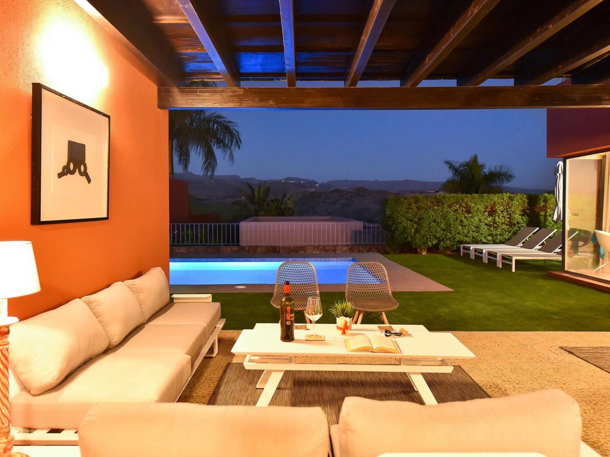 Modern, beautiful villa "Par 4 Villa 19 with Pool Salobre". In the centre of Salobre Golf Resort Masapalomas, in a secluded, quiet, sunny position. Private: garden (fenced) with lawn, swimming pool angular (8 x 4 m, depth 140 - 140 cm, seasonal availability: 01.Jan. - 31.Dec.). Garden furniture, barbecue, parking on the premises, public parking on the road. Bus stop "Las Crucitas" 19 km. The owner does not accept any youth groups. Neighbourhood highly sensitive to noise. Quietness and good behaviour expected.