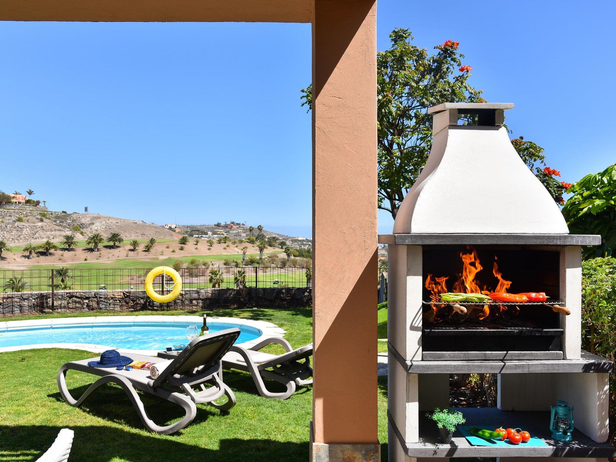 5-room house 280 m2. Modern and cosy furnishings: living room with satellite TV, digital TV and hi-fi system. Exit to the patio. Open kitchen (oven, dishwasher, 4 ceramic glass hob hotplates, toaster, kettle, microwave, freezer, electric coffee machine) with dining nook. On the lower ground floor: dining room with dining table. 1 room with 1 french bed and air conditioning. Upper floor: 1 room with 1 french bed, shower/WC and air conditioning. 1 room with 2 beds, bath/WC and air conditioning. Patio 310 m2. Terrace furniture, barbecue, deck chairs. View of the sea, the garden, the countryside and golf course. Facilities: washing machine, safe, iron, children's high chair, baby cot for up to 2 year olds, hair dryer. Internet (WiFi, free). Parking (fenced), garage (1 car). Please note: non-smoking house. Maximum 1 pet/ dog allowed. 2020-T7230 // Reg. Nr.: ESFCTU0000350120003160250000000000000VV-35-1-00151041
