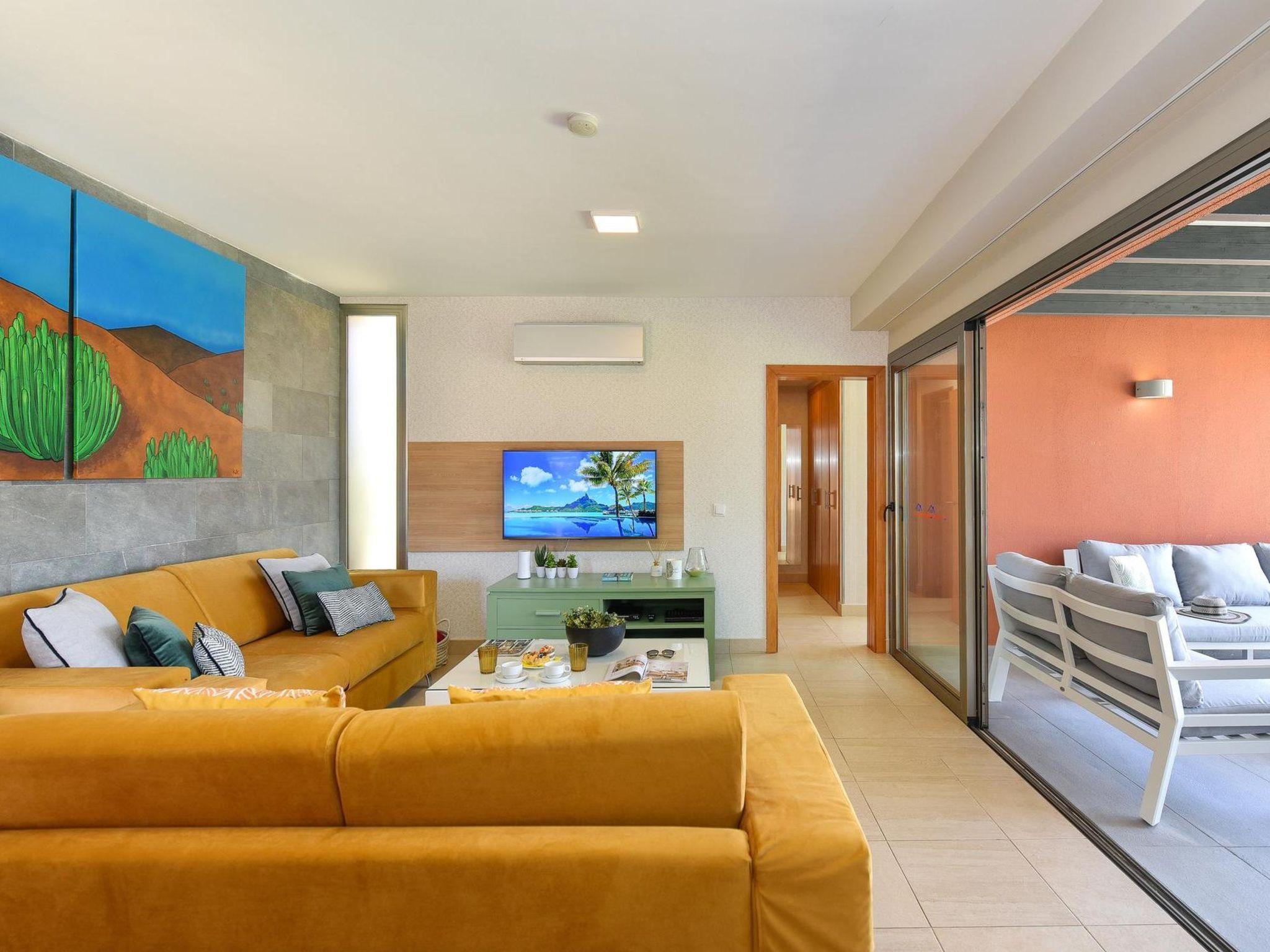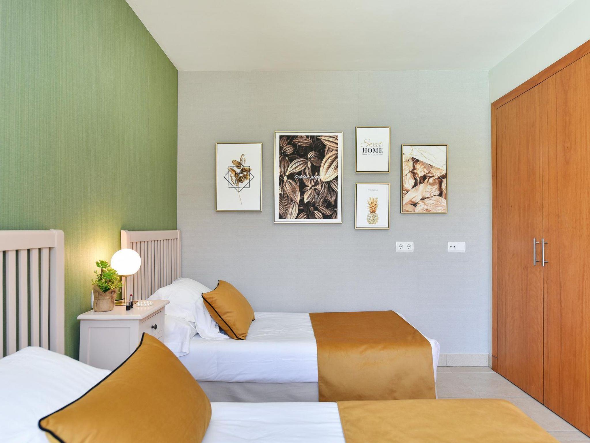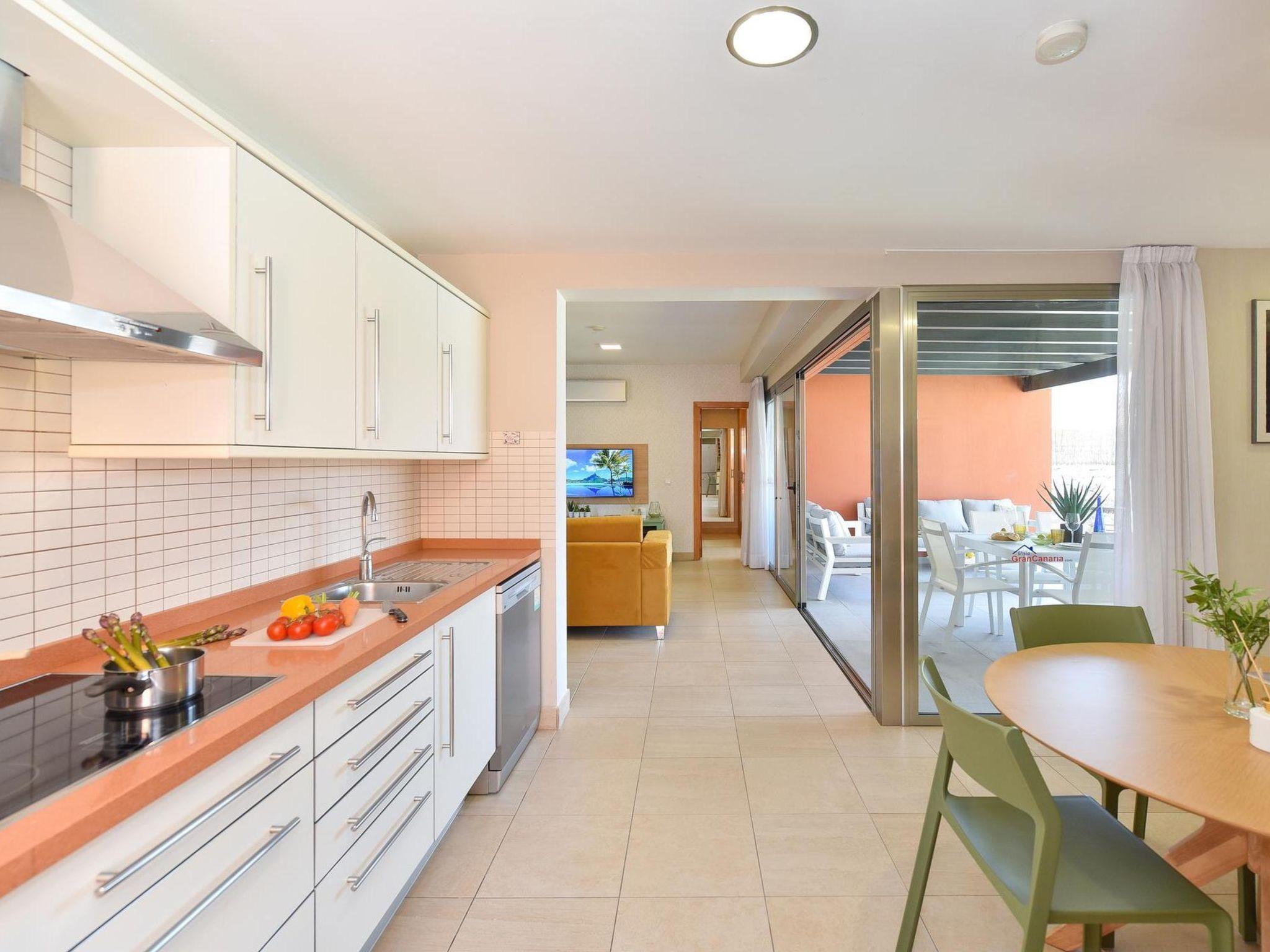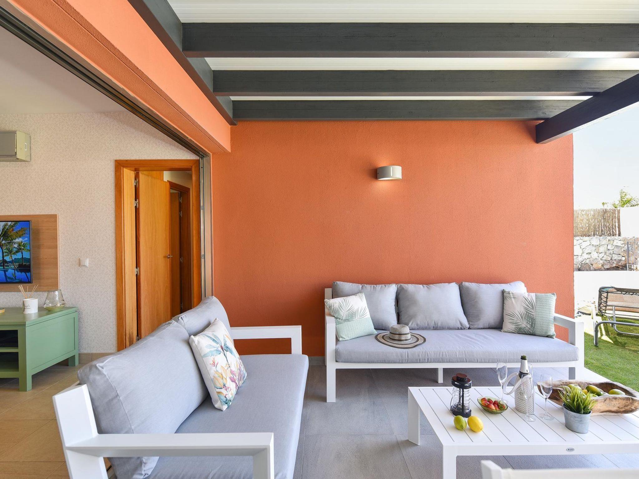 "Tipo 2 dormitorios", 3-room house 115 m2. Comfortable and modern furnishings: living room with satellite TV, digital TV, hi-fi system, DVD and air conditioning. Exit to the patio. 1 room with 1 french bed, shower/WC and air conditioning. Exit to the garden, to the swimming pool. 1 room with 2 beds, shower/WC and air conditioning. Exit to the garden, to the swimming pool. Kitchen (oven, dishwasher, 4 ceramic glass hob hotplates, toaster, kettle, microwave, freezer, electric coffee machine) with dining table and air conditioning. Patio 80 m2. Terrace furniture, barbecue, deck chairs. View of the mountains and the resort. Facilities: washing machine, dryer, iron, children's high chair, baby cot for up to 2 year olds, hair dryer. Internet (WiFi, free). Parking (1 car). Please note: non-smoking house. Maximum 1 pet/ dog allowed. VV-35-1-0018193 // Reg. Nr.: ESFCTU0000350120004735130000000000000000VV35100181935