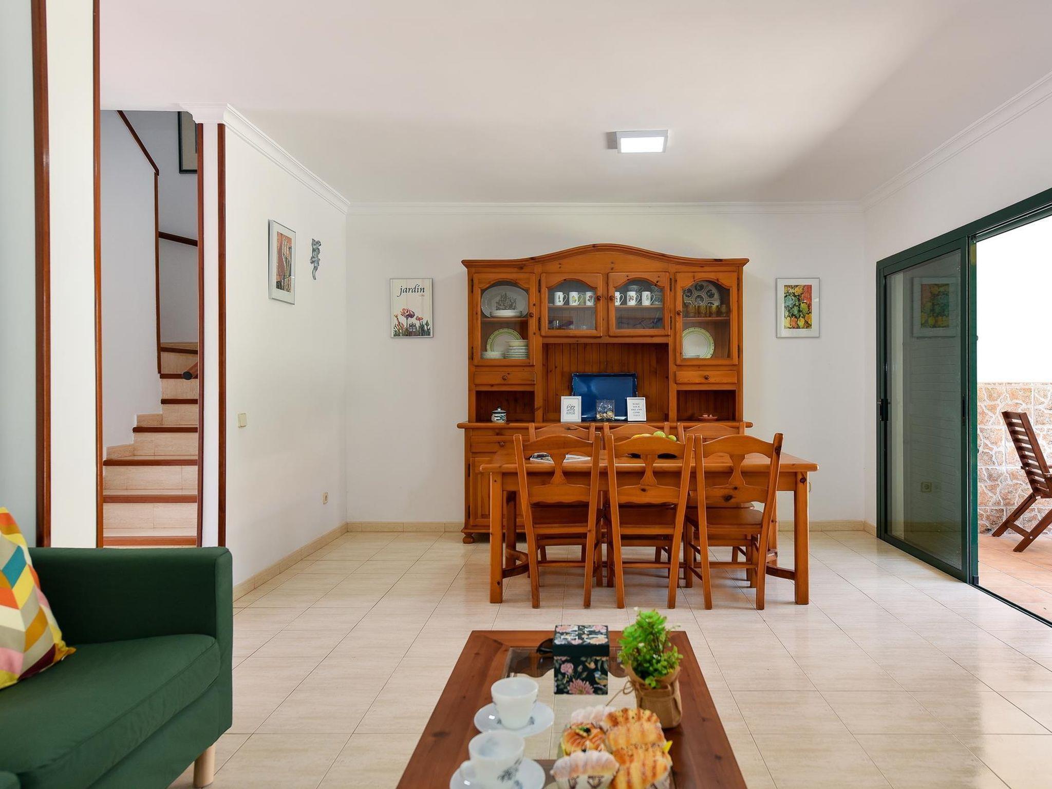 "Bungalow Sonnenland Los Tinos II 45", 3-room apartment 120 m2. Comfortable and cosy furnishings: living/dining room with dining table and digital TV. Exit to the terrace. Kitchen (oven, 3 ceramic glass hob hotplates, kettle, microwave, freezer, electric coffee machine) with dining table. Sep. WC. Upper floor: 1 room with 1 french bed. 1 room with 2 beds. Bath/WC. Terrace. Terrace furniture, barbecue, deck chairs. Facilities: washing machine, safe, iron, children's high chair, baby cot for up to 2 year olds, hair dryer. Internet (WiFi, free). Parking (1 car). Please note: non-smokers only. Maximum 1 pet/ dog allowed. VV-35-1-0018173