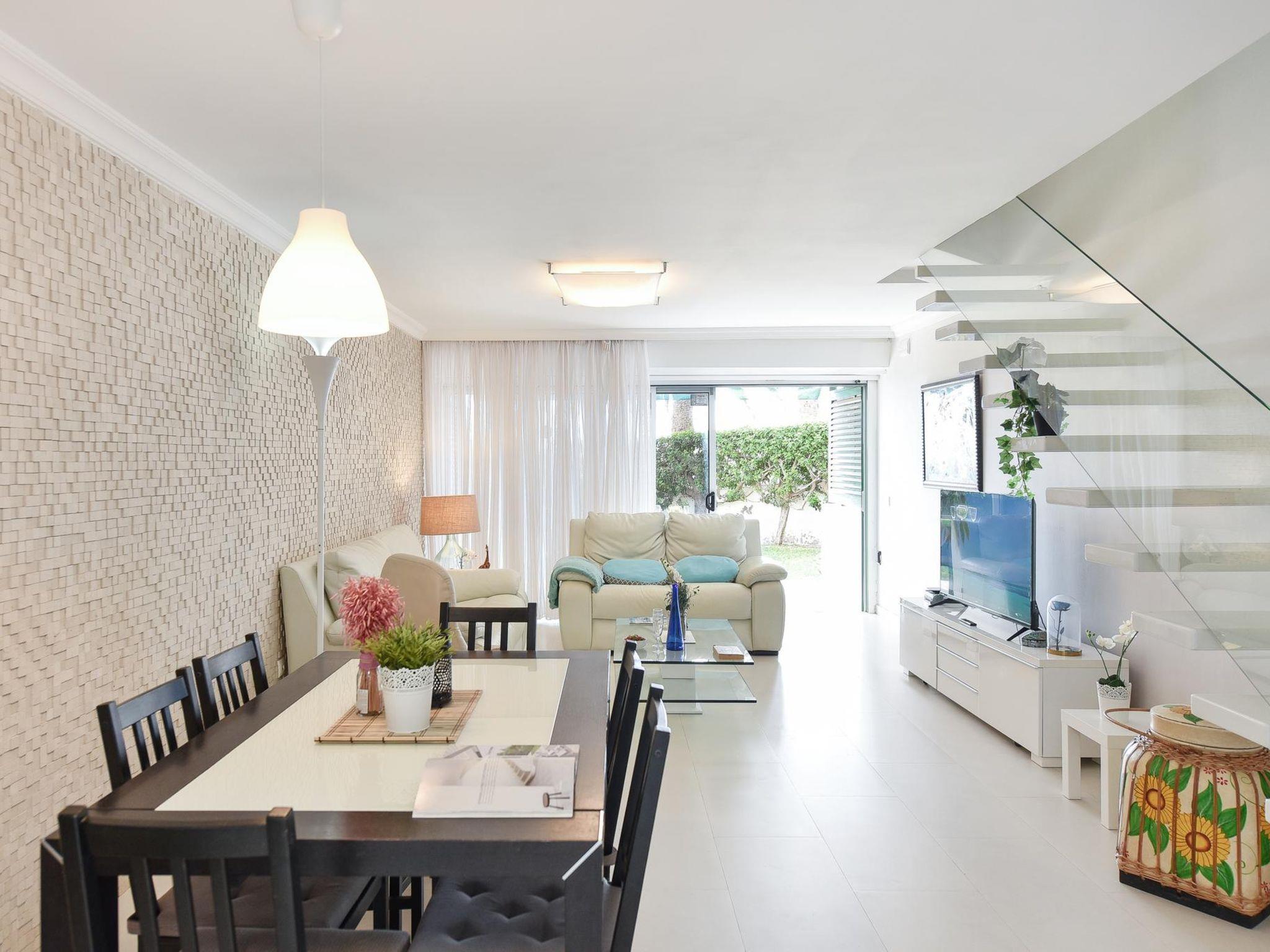 "Mira II", 4-room apartment 100 m2 on 2 levels, on the ground floor. Comfortable and cosy furnishings: living/dining room with dining table, digital TV and air conditioning. Open kitchen (oven, dishwasher, 4 ceramic glass hob hotplates, toaster, kettle, microwave, freezer, electric coffee machine, Capsules for coffee machine (Nespresso) extra). Shower/WC. Upper floor: 1 room with 1 french bed and air conditioning. 1 room with 2 beds and air conditioning. 1 room with 2 beds. Shower/WC. Terrace furniture. View of the sea. Facilities: washing machine, safe, iron, children's high chair, baby cot for up to 2 year olds, hair dryer. Internet (WiFi, free). Please note: non-smokers only. 2023-T5610 // Reg. Nr.: ESFCTU00003501200013446900000000000000VV-35-100180587