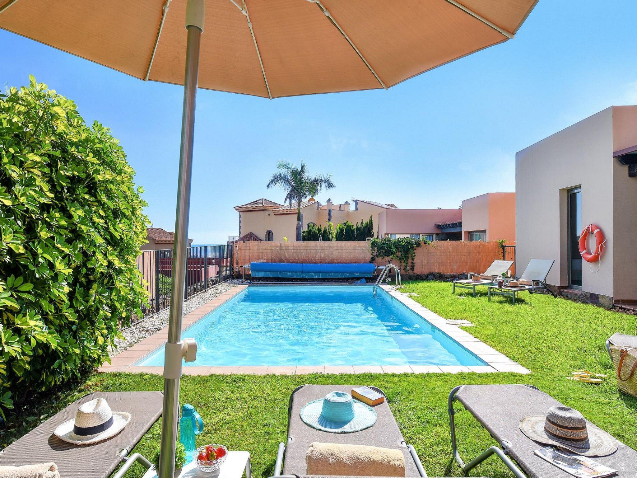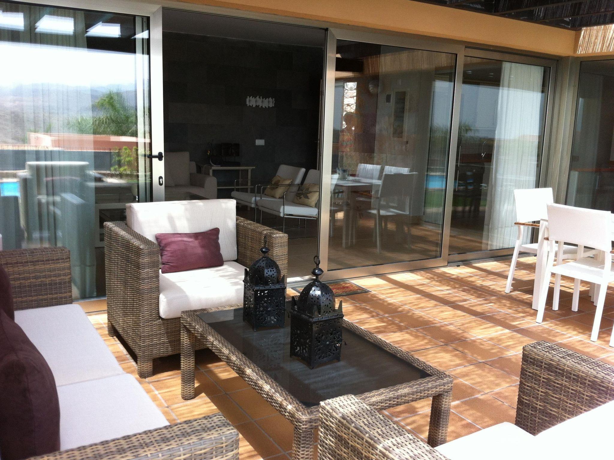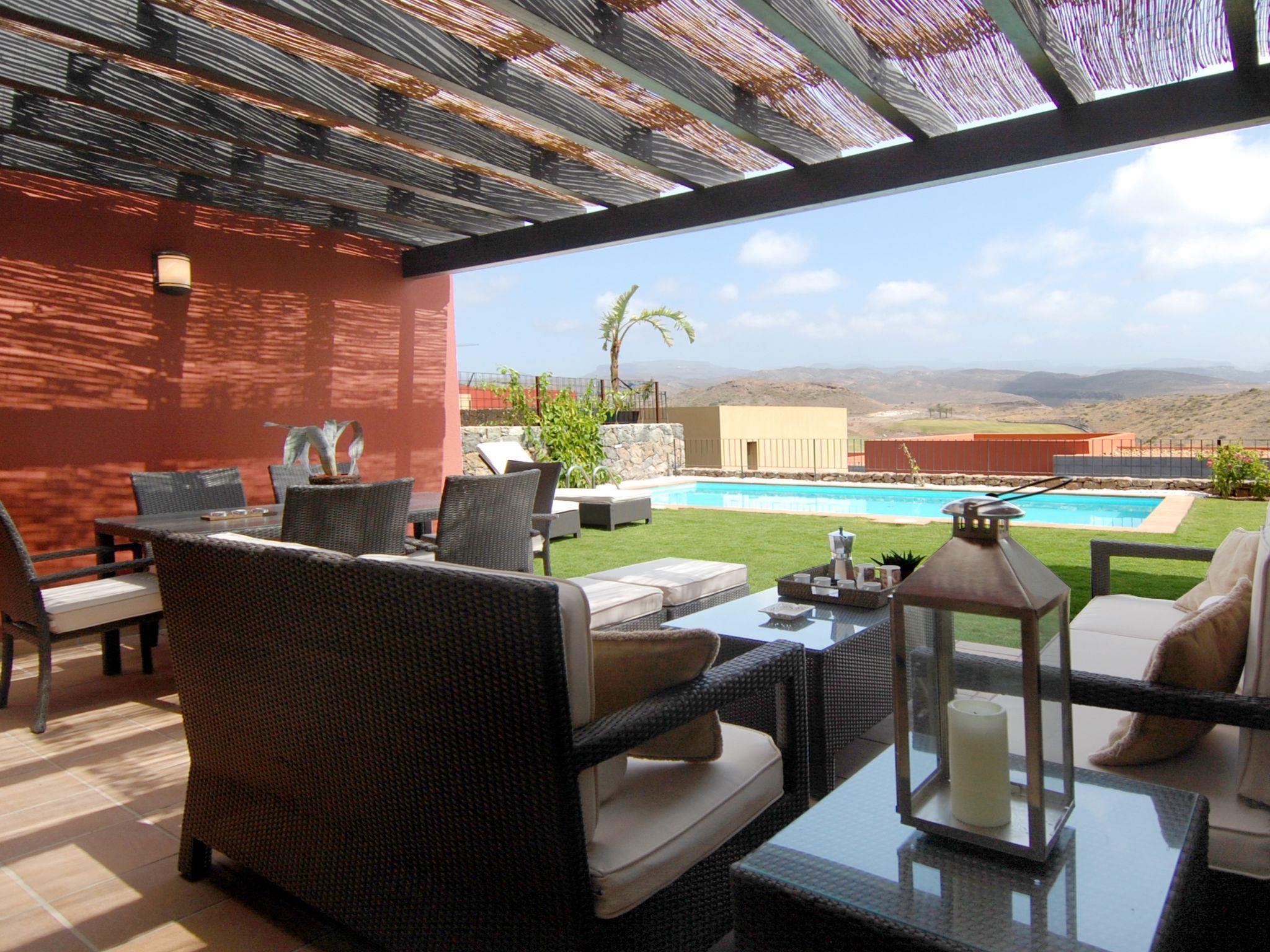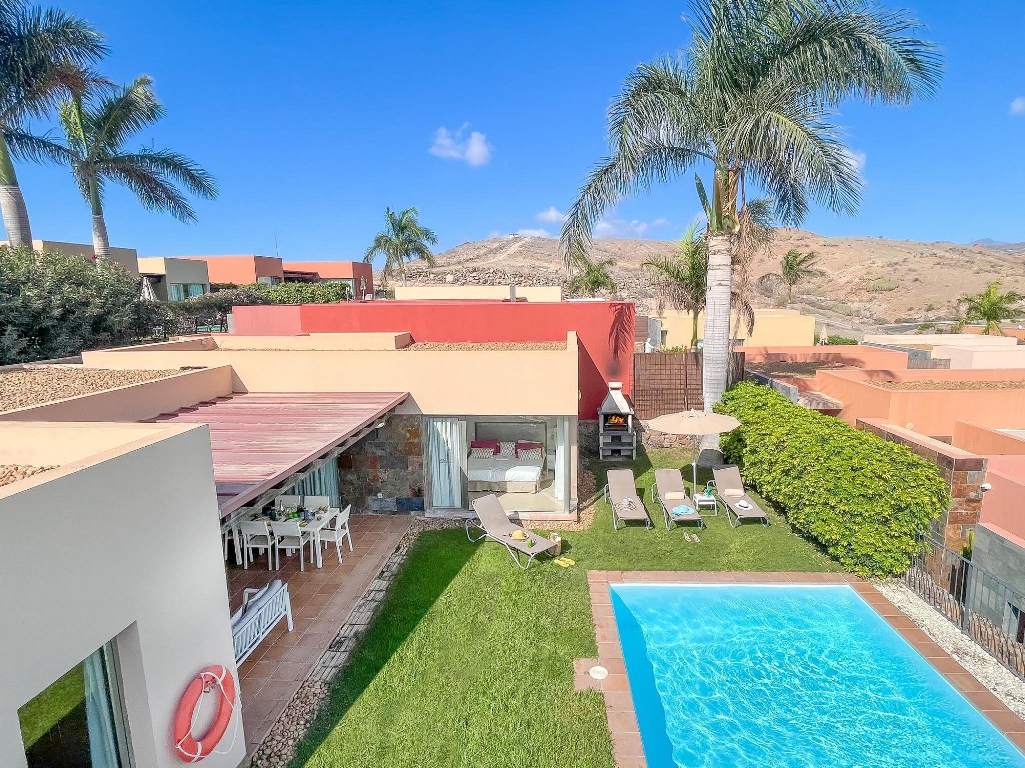 Modern, comfortable villa "Par4 Villa 7". In the centre of Salobre Golf Resort Maspalomas 5 km Meloneras 7 km, in a quiet, sunny, elevated position. Private: property 380 m2 (fenced), garden 80 m2, lawn for sunbathing, swimming pool (8 x 4 m, depth 1 - depth 40 cm, seasonal availability: 01.Jan. - 31.Dec.). Barbecue. In the house: WiFi, air conditioning, washing machine, tumble dryer. Parking at the house on the premises. Shop 4 km, supermarket 3 km, restaurant 200 m, bus stop "Las Crucitas" 19 km, sandy beach "3000". Golf course (18 hole) 500 m. Please note: car recommended. Suitable for families, suitable for seniors baby equipment on request. The owner does not accept any youth groups. Airfield 25 km from the property.