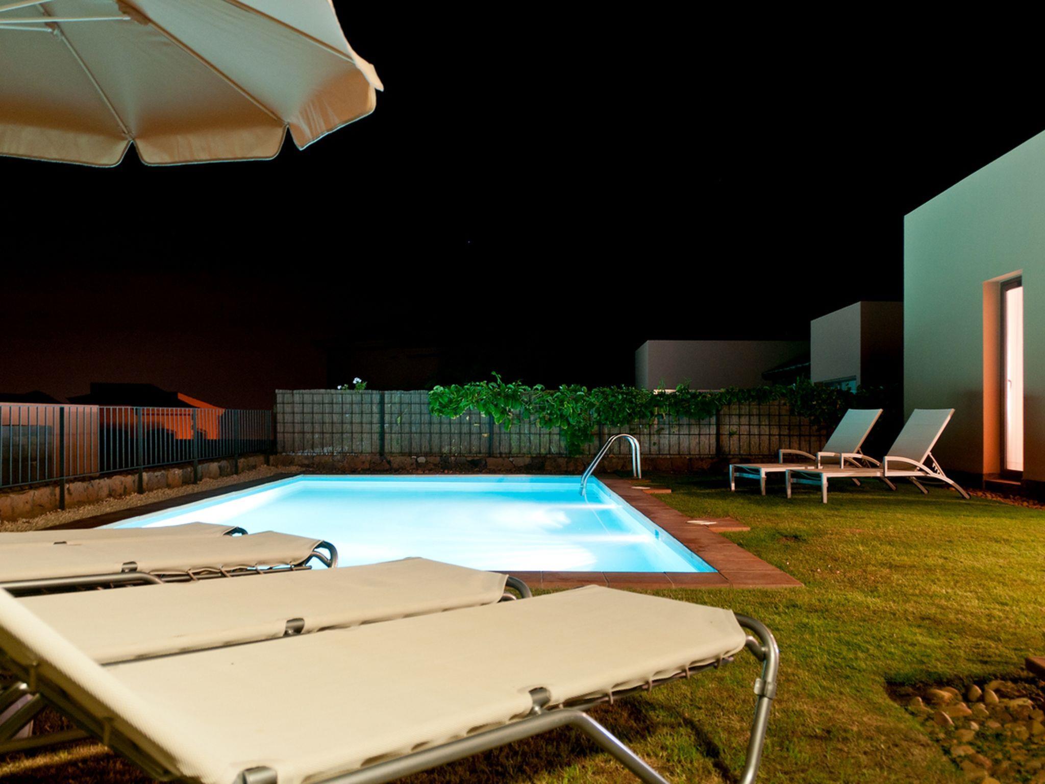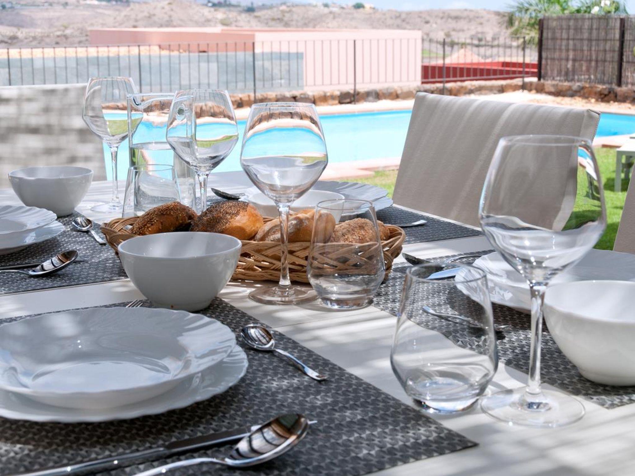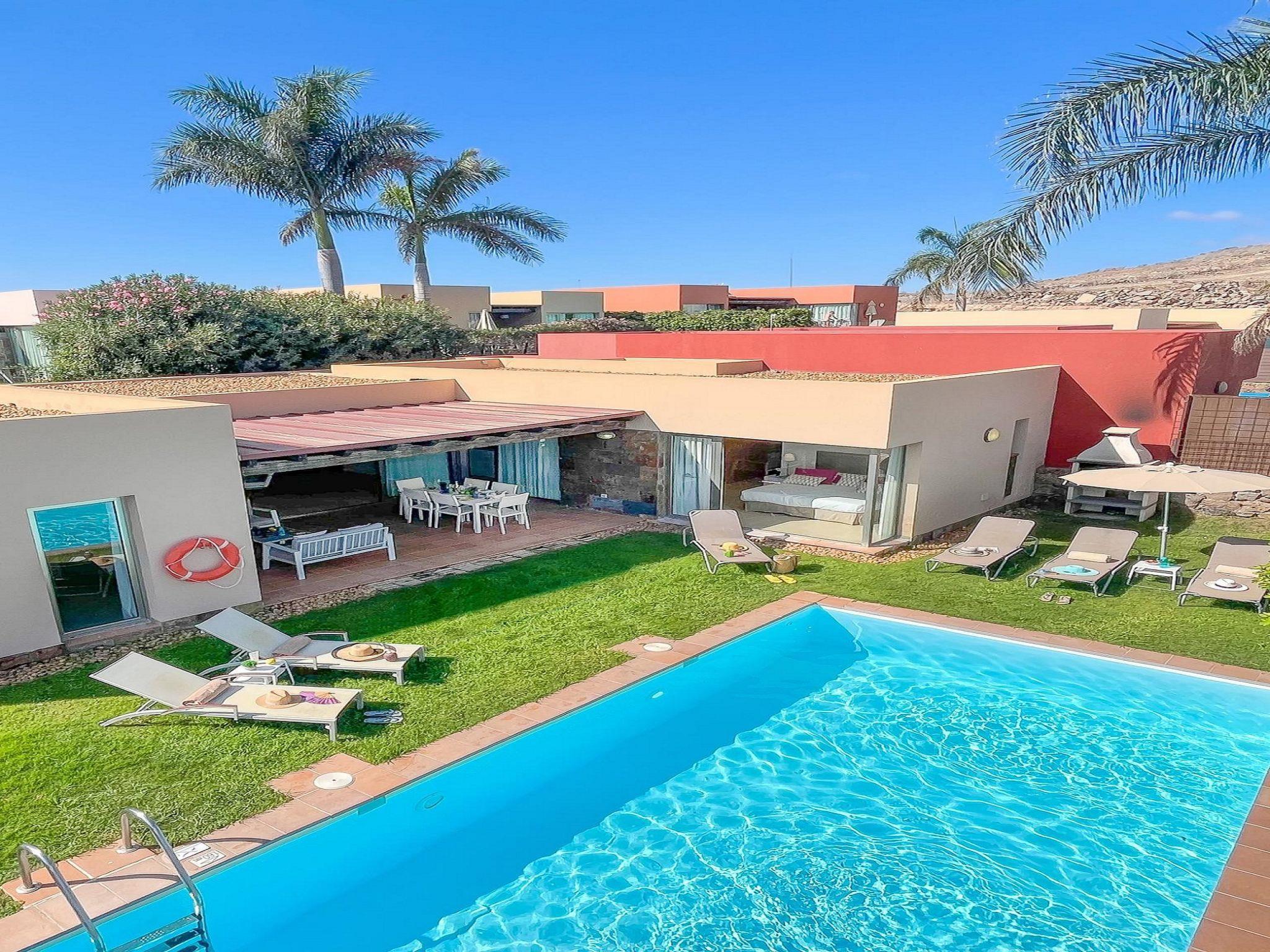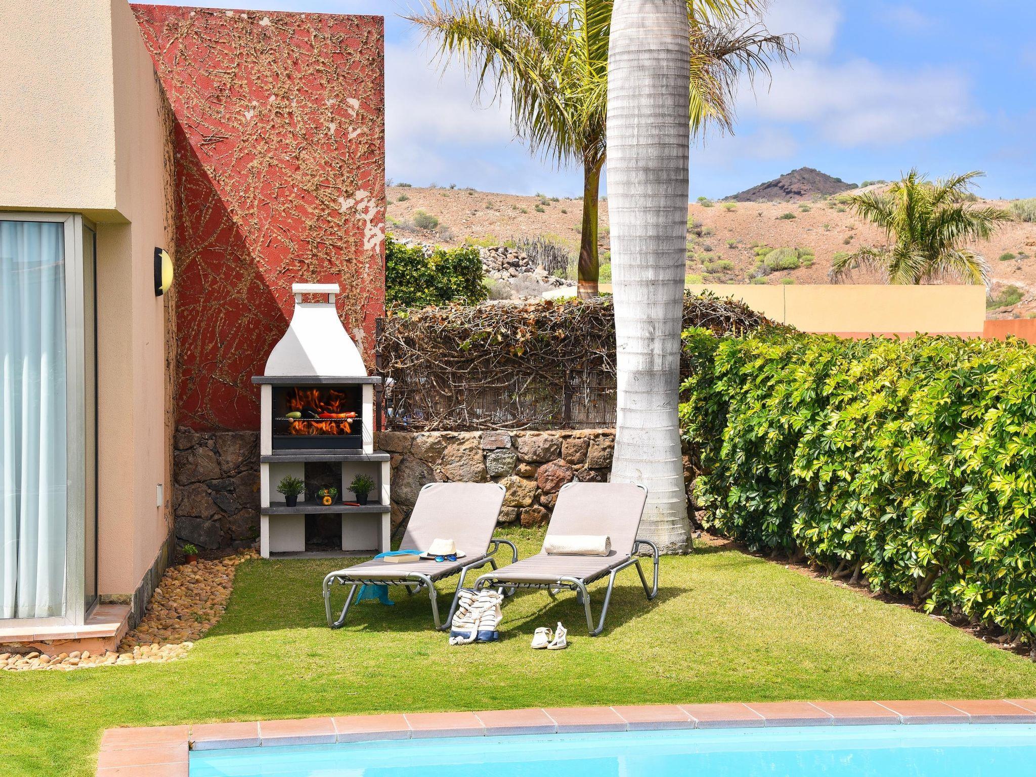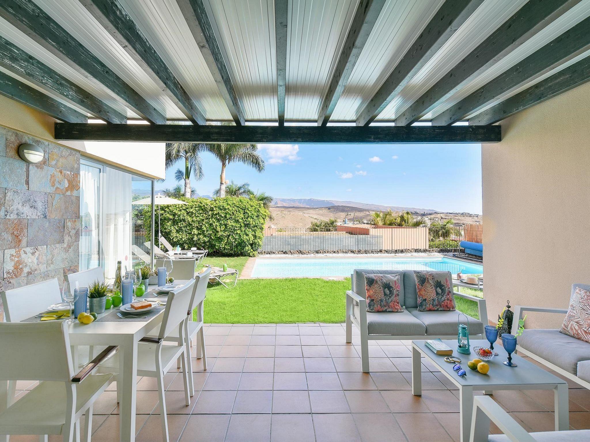Modern, comfortable villa "Par4 Villa 7". In the centre of Salobre Golf Resort Maspalomas 5 km Meloneras 7 km, in a quiet, sunny, elevated position. Private: property 380 m2 (fenced), garden 80 m2, lawn for sunbathing, swimming pool (8 x 4 m, depth 1 - depth 40 cm, seasonal availability: 01.Jan. - 31.Dec.). Barbecue. In the house: WiFi, air conditioning, washing machine, tumble dryer. Parking at the house on the premises. Shop 4 km, supermarket 3 km, restaurant 200 m, bus stop "Las Crucitas" 19 km, sandy beach "3000". Golf course (18 hole) 500 m. Please note: car recommended. Suitable for families, suitable for seniors baby equipment on request. The owner does not accept any youth groups. Airfield 25 km from the property.