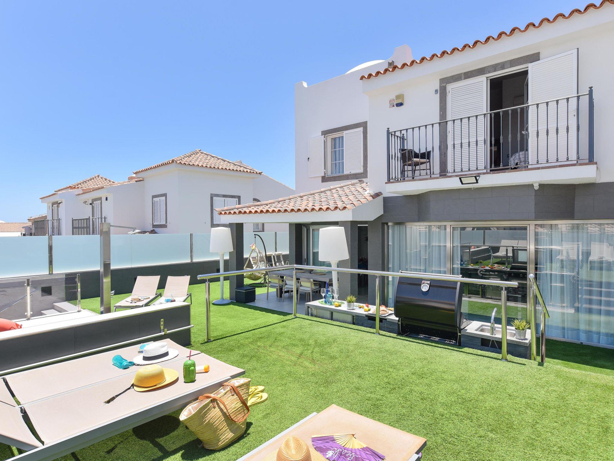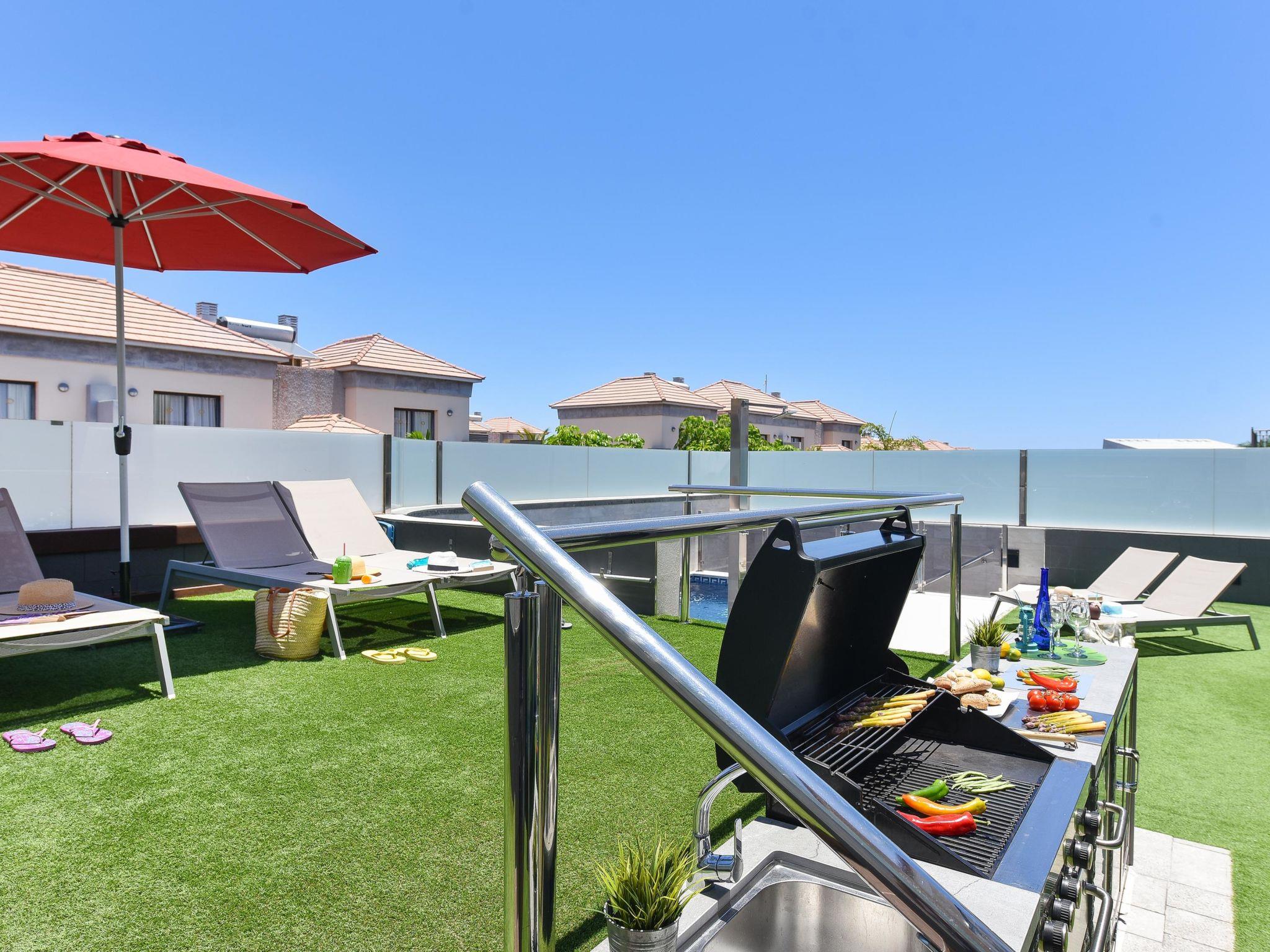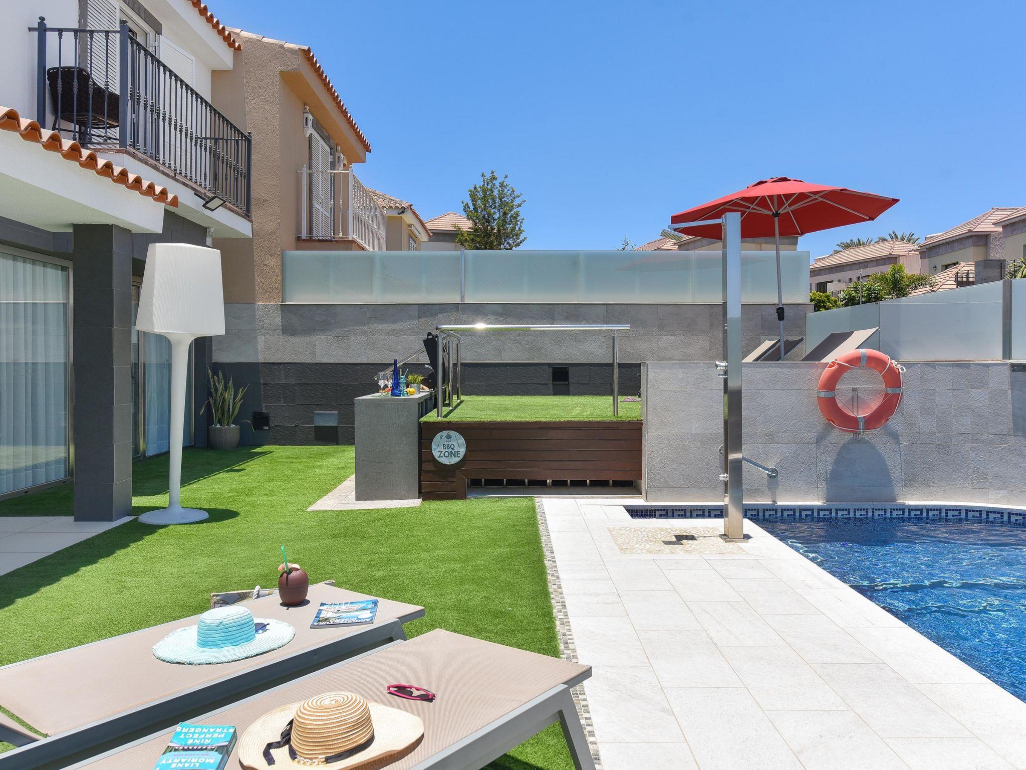 Modern, luxurious single-family house "Meloneras Hills 19". In the centre of Meloneras, on the outskirts Maspalomas, in a central, quiet position in the residential district, excellent location: right in the centre but still quiet. Private: garden (fenced), swimming pool (4 x 2 m, depth 1 - depth 60 cm, seasonal availability: 01.Jan. - 31.Dec.). Outdoor shower, parking at the house. Shop, grocery, supermarket 500 m, restaurant 100 m, bus stop "Faro de Maspalomas" 1.2 km, sandy beach "300". Golf course (18 hole) 2.4 km, tennis 500 m. Please note: car recommended. Baby equipment on request. The owner does not accept any youth groups. Airfield 33 km from the property.