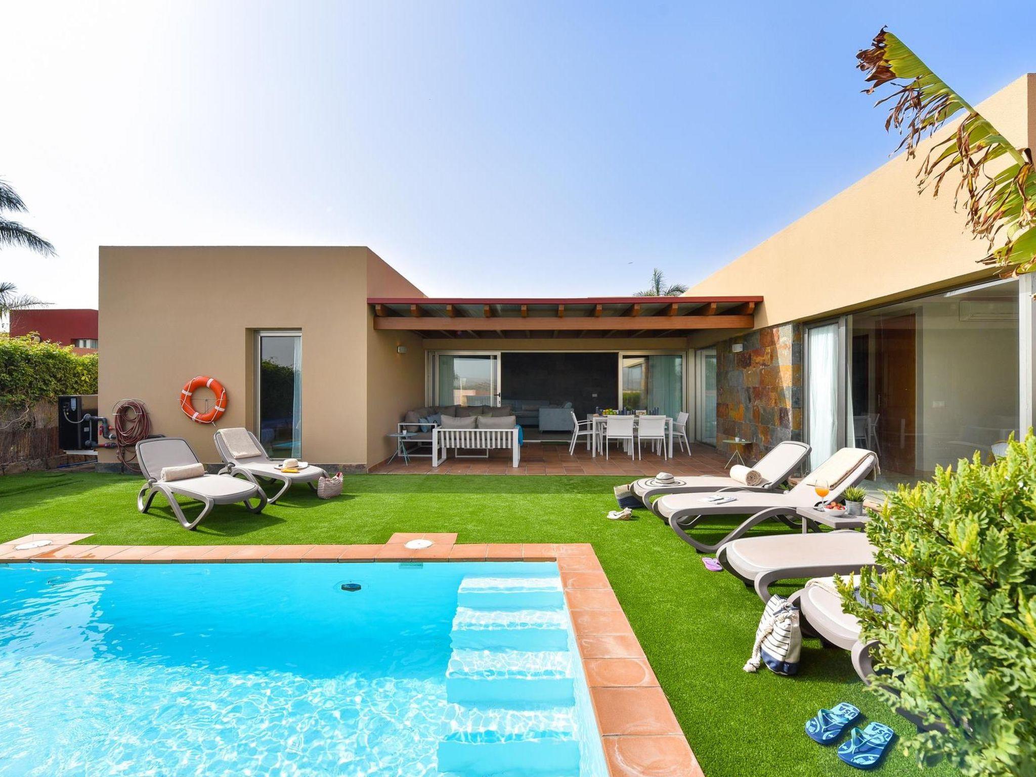 Modern, comfortable villa "Par 4 Villa 9 with Pool Salobre". In the centre of Salobre Golf Resort, on the outskirts Maspalomas 5 km, outside the resort Meloneras 7 km, in a quiet, sunny, elevated position. Private: garden (fenced) with lawn 80 m2, swimming pool angular (8 x 4 m, depth 140 - 140 cm, seasonal availability: 01.Jan. - 31.Dec.). Barbecue. In the house: sun terrace, air conditioning. Parking on the premises, public parking on the road. Shop 4 km, supermarket 3 km, restaurant 200 m, bus stop "Las Crucitas" 19 km, sandy beach 10 km. Golf course (18 hole) 50 m. Please note: car recommended. The owner does not accept any youth groups. Airfield 40 km from the property. Neighbourhood highly sensitive to noise. Quietness and good behaviour expected.