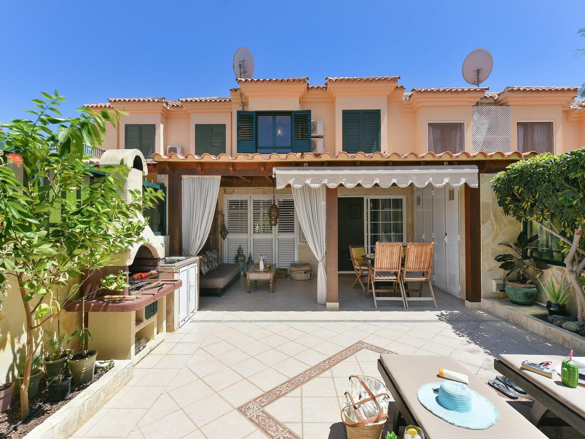 Very cosy, simple holiday development "en Sonnenland". In the resort Pueblo Salobre, 500 m from the beach. For shared use: swimming pool angular (seasonal availability: 01.Jan. - 31.Dec.). Outdoor shower. Private: terrace, garden furniture, barbecue, parking at the house. Shop 500 m, supermarket 250 m, bar 200 m, bus stop "Los Robles Verdes" 150 m. Please note: car recommended. Baby equipment on request. Object suitable for 2 adults. The owner does not accept any youth groups. Neighbourhood highly sensitive to noise. Quietness and good behaviour expected. Late arrivals will have an extra cost to be paid in cash: 20:30-22:00: 30€, 22:00-00:00: 50€, 00:00-01:30: 80€..