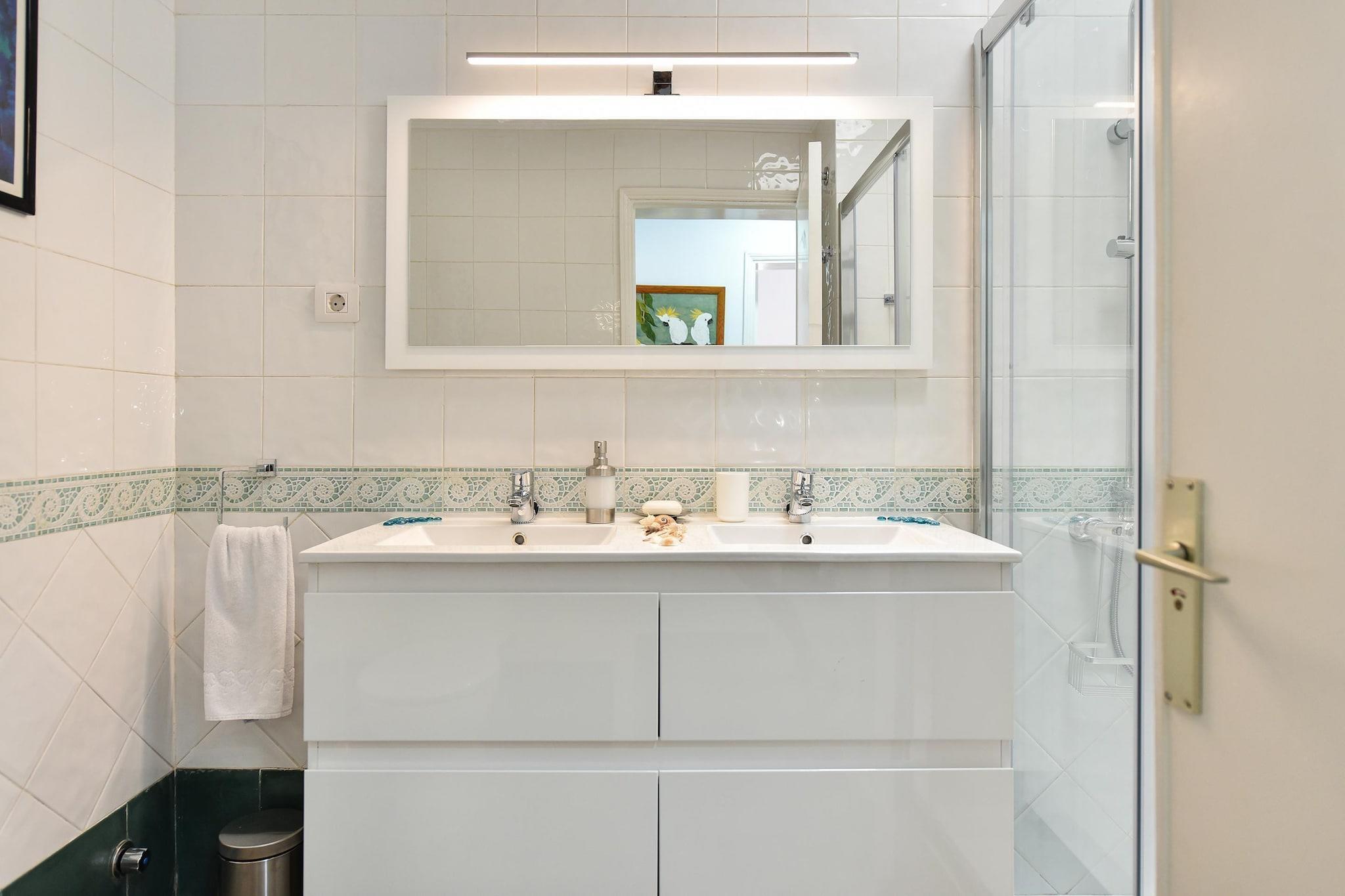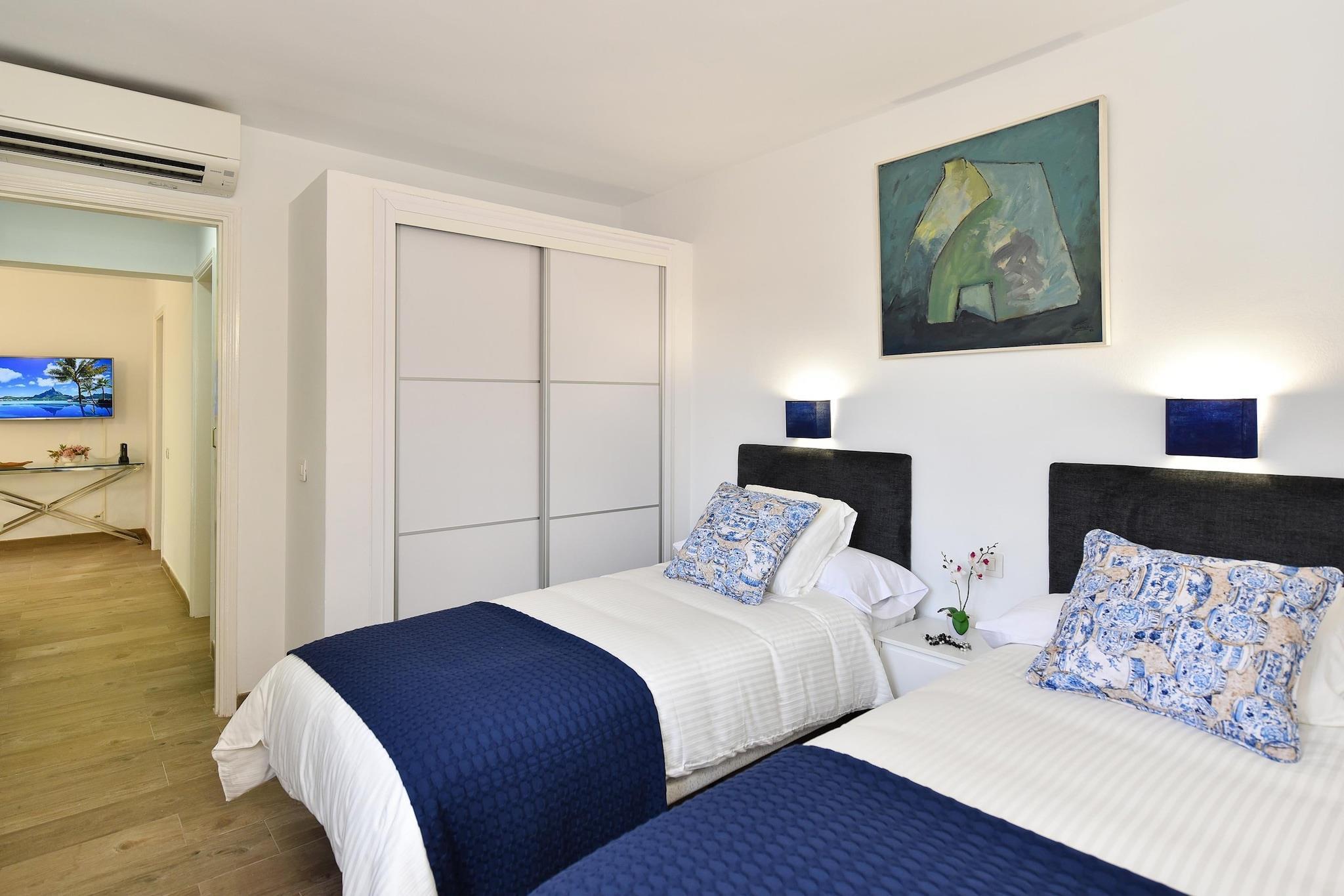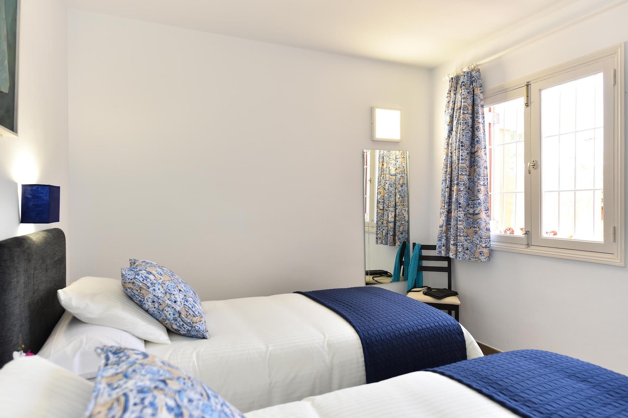 Stueetage: (Køkken(brødrister, komfur(glaskeramisk), kaffemaskine(kaffetragt), ovn, mikrobølgeovn, køle-fryseskab, vaskemaskine, Blender), stue / spisestue(Fjernsyn(parabol), spisebord, sofahjørne), soveværelse(2x enkeltseng), soveværelse(2x enkeltseng), badeværelse(bruser, 2x håndvask)) klimaanlæg, terrasse(privat, overdækket), have, havemøbler, solstole, parkering, swimmingpool(deles med andre gæster)