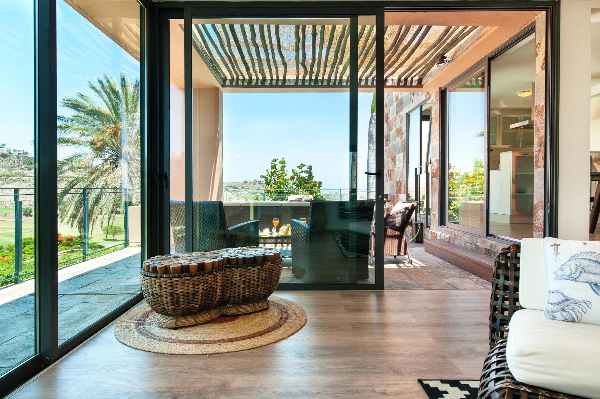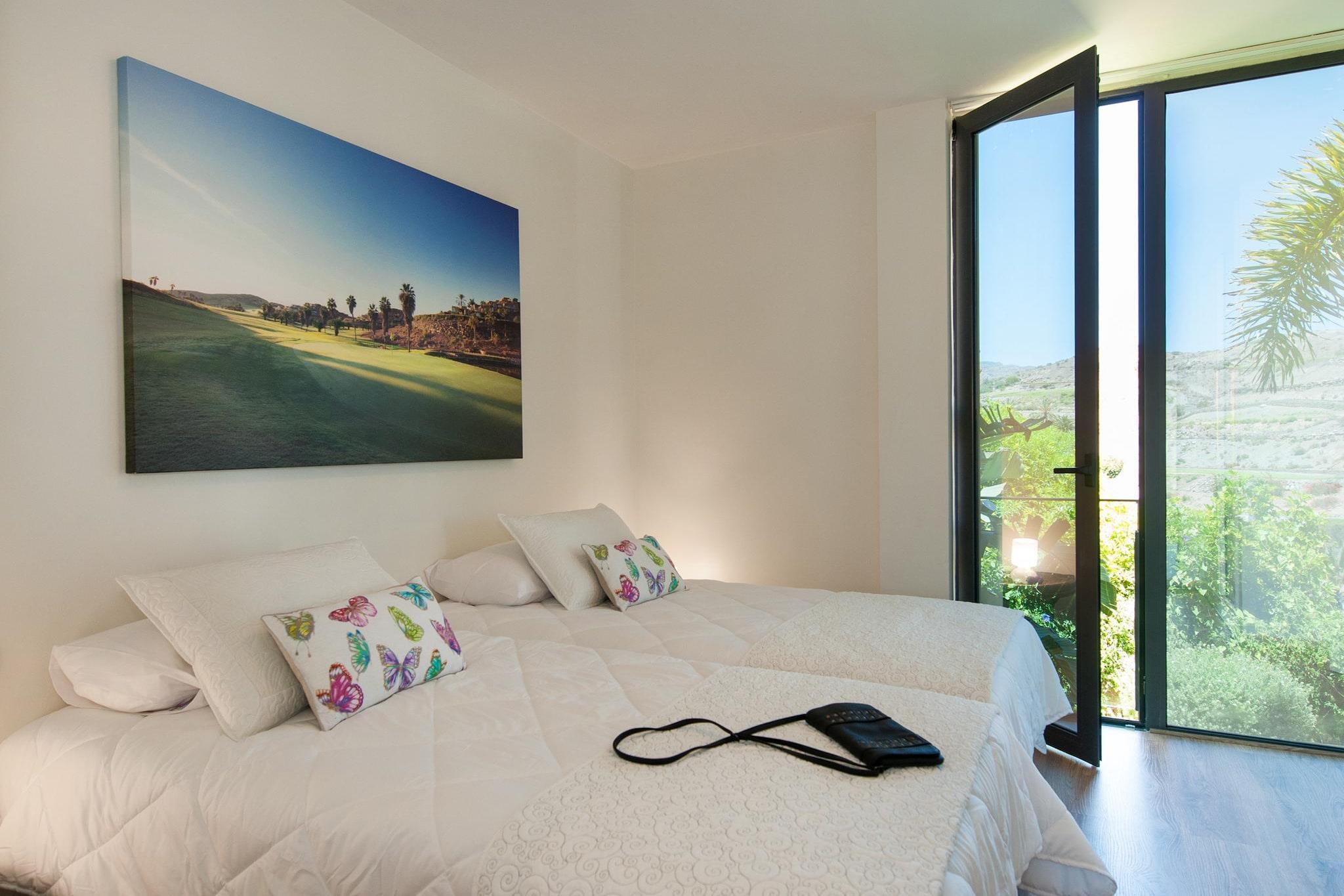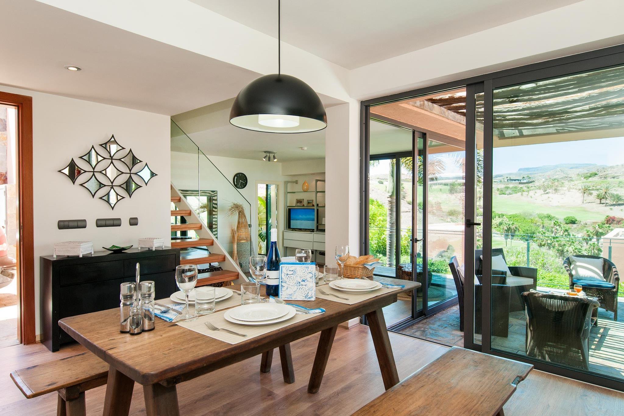 Dette er en intim ferieresidens i to etager i det eksklusive Salobre Golf Resort. Det har en lille privat pool over jorden, 2 soveværelser og en smuk privat have. Denne private villa har sin egen stil og meget komfortabelt udstyr. Den har to soveværelser, et på øverste etage med dobbeltseng, et badeværelse med badekar og store vinduespartier med udgang til en terrasse med udsigt. Det andet værelse i stueetagen har to enkeltsenge og et badeværelse med bruser. Indretningen afsluttes med en moderne og lys stue, spisestue i tilknytning til køkkenet, som er fuldt udstyret. Denne feriebolig har fladskærms-tv med satellitkanaler, aircondition og grill. Alt for at vores gæster skal føle sig hjemme! Udendørsområdet har en privat overjordisk swimmingpool, mål: 2,40m x 1,80m (kan opvarmes mod tillæg) og en smuk terrasse med spisestue og solarium med liggestole. Denne villa har også adgang til en dejlig fælles swimmingpool. Denne villa er et meget hyggeligt sted at nyde en velfortjent ferie med din familie. El Salobre Golf Resort, er et afsondret område for fred og ro, men ligger samtidig kun 10 minutters kørsel fra Maspalomas eller Meloneras, eller 40 minutter fra hovedstaden. På Gran Canaria er alt inden for rækkevidde på en kort køretur!