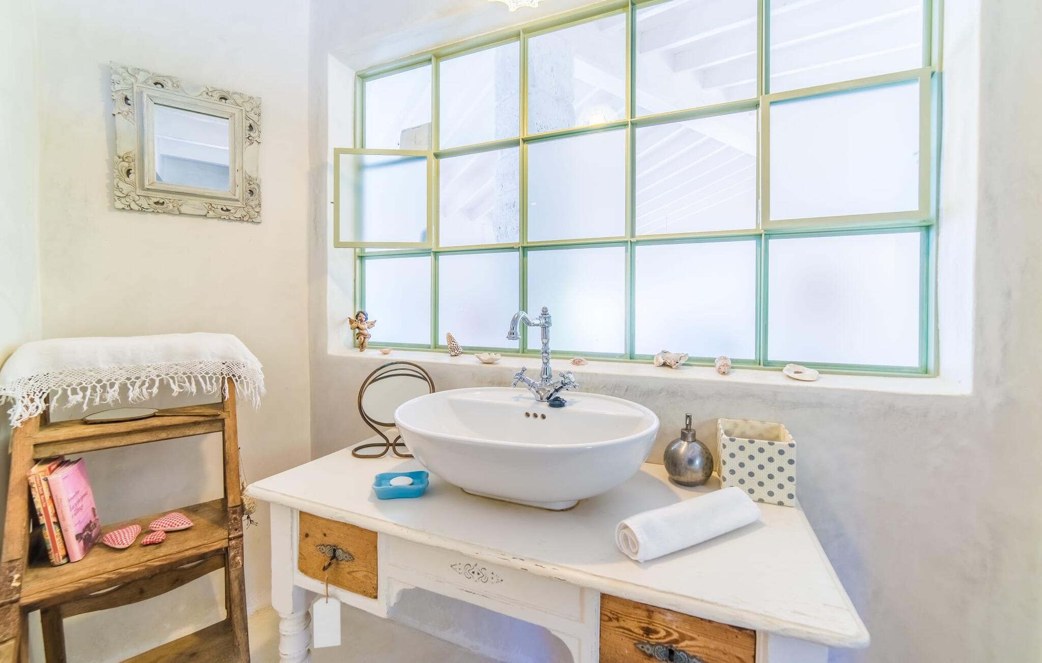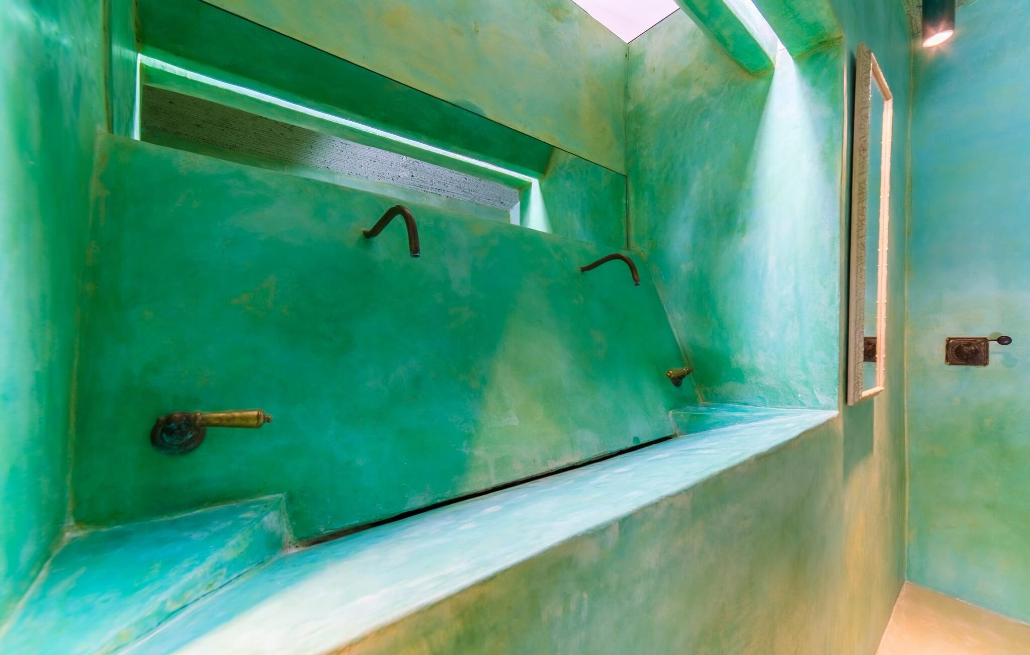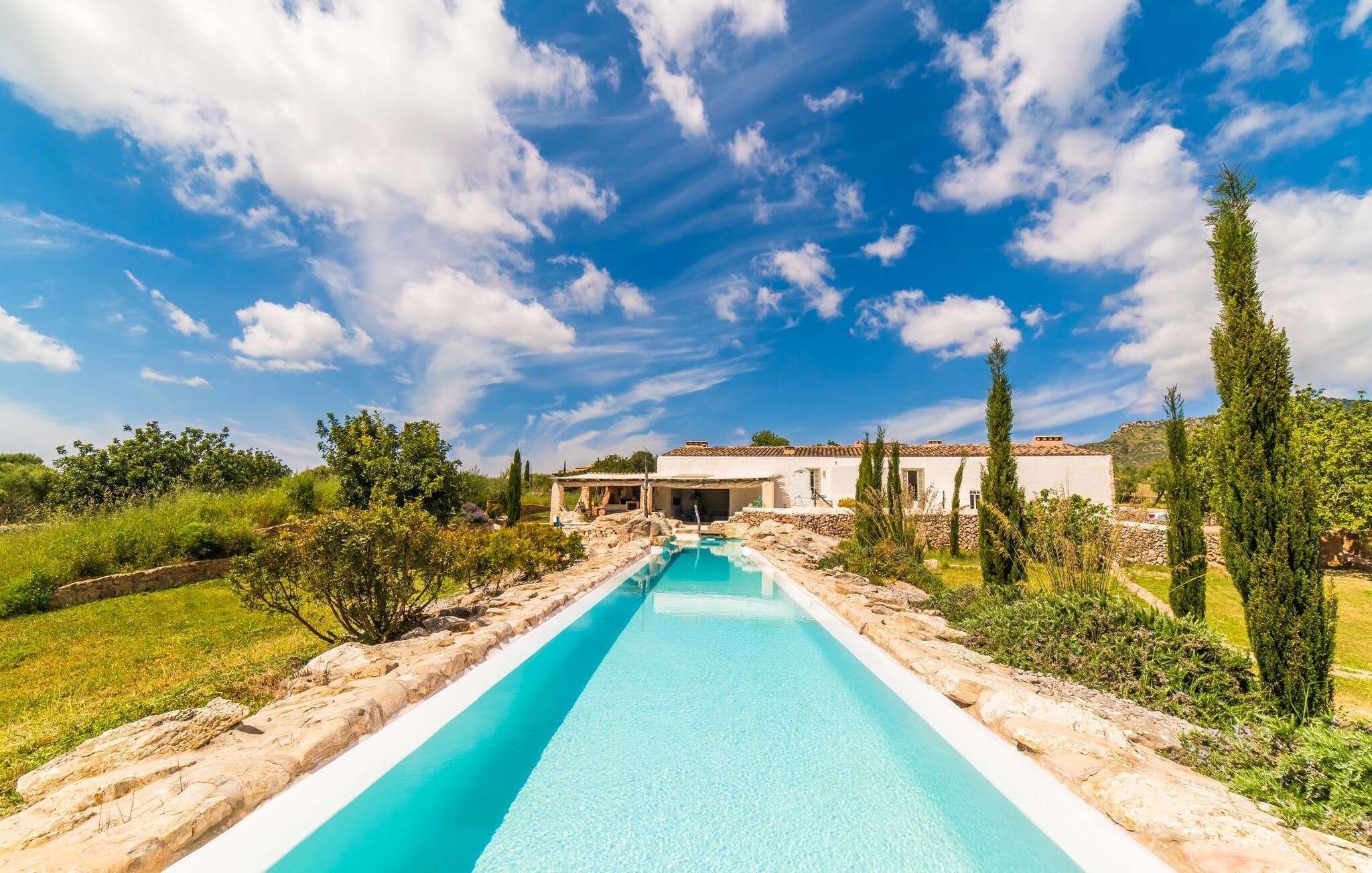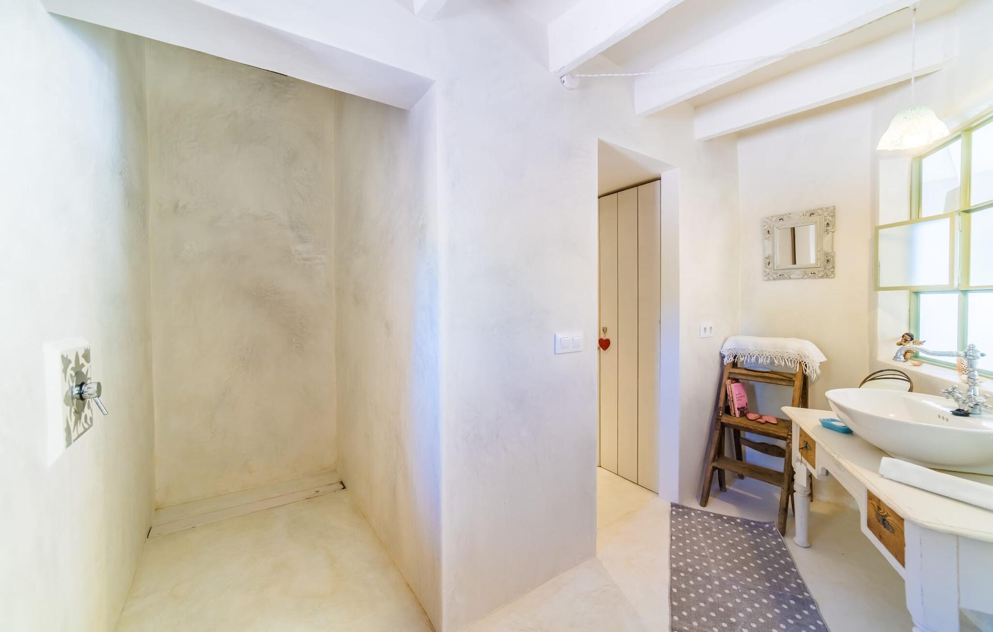 "Alle er kunstnere," sagde den tyske kunstteoretiker Joseph Beuys. Denne ekstraordinære villa er ikke kun tegnet af en af ??dem - her lod ejeren fantasien løbe løbsk både inde og ude og lavede meget af arbejdet selv - den vil helt sikkert også gøre gæsterne, der bor her, til ægte "kunstnere". I hvert fald når det kommer til kunsten at give slip. Den ret aflange "Massari" er designet som en enkelt chill-out-zone, hvor et samfund på seks "kunstnere" kan slippe dampen af ??hjertens lyst. Når familietid ser sådan ud, er det ikke kun de ældre børn, der vil elske det. Hvad andre kalder en pool er her en våd lounge: beplantet med sten og naturlige kampesten! En lavvandszone! En gangbro i træ, hvor du kan dingle dine ben! Liggestole lavet af træ, flet og sten, til glæde for underdele af enhver art! En 29 meter lang svømmekanal, som selv de mest ambitiøse omgangssvømmere vil nyde! En udendørs bruser! Og så er der den træoverdækkede terrasse med polstrede stenbåse i Ibiza-stil og det utrolige udekøkken, perfekt til rustikke frilufts-fingerfood-fester, hvor alle kan samles om den enorme grill og servere sig selv uden bekymringer kan gøres ved at plaske med fedt. Og for at toppe det hele ligger denne eksotiske villa i et toscansk-lignende landskab i absolut fred og ro, med grønne bakker rundt omkring og kun få naboer på afstand... Og så (frivilligt, ifølge Beuys): "Lad dig selv falde, tag en masse små lur, grin meget og bad i måneskin." Det, du ser her, er enten restaureret eller specialfremstillet. Boligrummet, der åbner helt ud til poolterrassen, er en slags kæmpe kunstnerhems med designelementer lavet af muddersten; Sofaarrangementet ser ud over trægangen til poolen og videre. Polstrede alkover og mantels i sandsten, lænestole, høje hvide lofter, tæpper, kunstgenstande og samleobjekter harmonerer godt sammen for at skabe en afslappet og afslappet atmosfære. Kun stearinlys brænder i den dekorative pejs, men villaens varmesystem holder dine fødder varme, når det er nødvendigt. Som kok har du mulighed for at holde øje med alt: lige fra galleriet til køkkenet. Men bliver rygterne for varme, kan du altid gå direkte til spisebordet udenfor. Men hvem kryber sammen med hvem under hvilket myggenet? Bag køkkenet er der tre soveværelser med enten en 1,80 meter bred dobbeltseng eller to enkeltsenge skubbet sammen; to er over for hinanden i samme højde, den anden er et par trin lavere. Selv de unikke eventyrlys har en afslappende følelse, så du kan være sikker på, at dette er et fantastisk sted at hvile og slappe af. En ting, der virkelig skiller sig ud ved dette sted, er de to badeværelser (to af dem en-suite): enten gå gennem en hjertesmykket "garderobegang" til et brusebad, der er bygget lige ind i væggen, med vinduer, der giver naturligt lys til stuen område ; Eller du kan komme ind i det overnaturlige grønne badeværelse, designet til mere end én person, hvor brusevandet kommer direkte fra loftet midt i rummet, og du kan gå ned i det store badekar. Og hvis du ikke har set nok til at stille din appetit på afslapning, så træn dig ind på de smalle trapper og klatre op på loftet på "Massari" - hvis nogen begraver sig i "læsehulen" deroppe, kan du finde dem glemt for en stund . Der er en verden til forskel på det rolige Sant Llorenç des Cardassar (San Lorenzo) og det meget mere turistede Cala Millor – og alligevel ligger de to steder kun få kilometer fra hinanden. Lige meget om du tager afsted fra "Massari" på egen hånd og cykler eller vandrer gennem bakkerne, eller tager på en (guidet) chopper-tur og lader dig vise de bedste badesteder og indimellem bare hopper ind - det er din ferie, så gør hvad du har lyst til. På den anden side supplerer familiedrevne bodegaer i små vinbyer som Petra og Ariany og barerne og restauranterne i Porto Cristo hinanden perfekt – friskfanget fisk smager dobbelt så godt med en lokal hvidvin. Det burde være mere end nok til at støtte dig på den moderat vanskelige vandretur forbi olivenlunde og fåre-græsgange til det 473 meter høje Muntanya de Calicant, hvor du vil se, at selv Mallorca selv blev skabt af en sand kunstner. Det harmoniske samspil mellem blå, grønne og jordfarver virker som farveterapi, indtil du føler, at du er en del af et kæmpe kunstværk. "Massari", en imponerende villa med en kunstnerisk sjæl og farverige møbler og dekoration, ligger blandt grønne bakker i den østlige del af øen og alligevel kun 3 km fra det rolige Sant Llorenç med sine typiske mallorcanske butikker og restauranter, supermarked og pengeautomater . Den smukke havn i Porto Cristo inviterer dig også til at udforske, mens strandene S'Illot, Sa Coma og Cala Millor (ca. 20 minutter væk i bil) byder på vidunderlige bademuligheder i krystalklart vand. Dette er et Fincallorca feriehus.