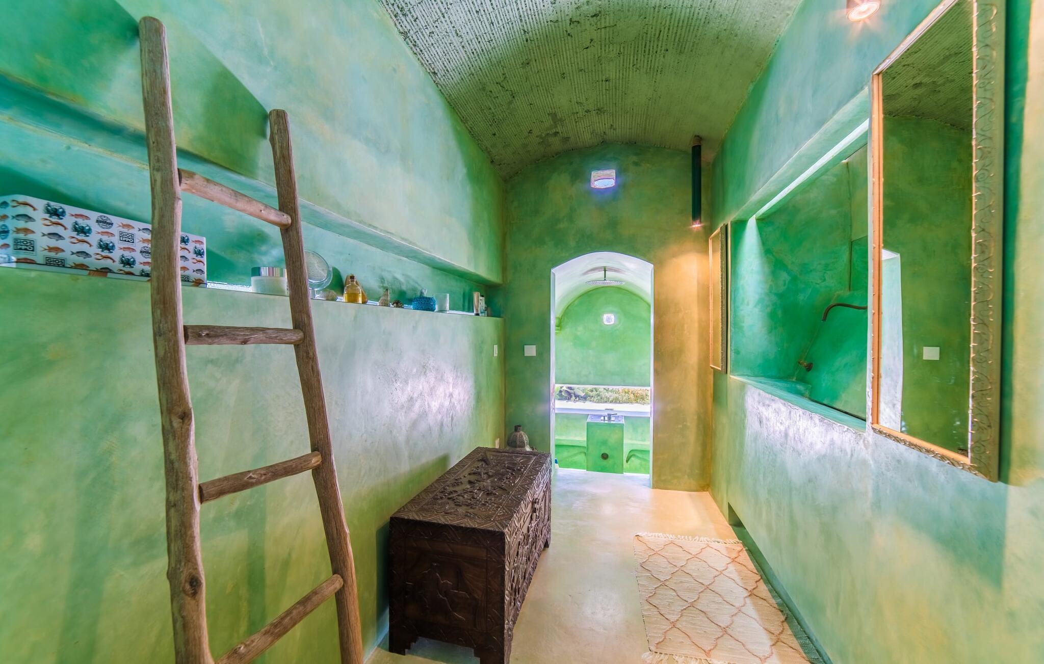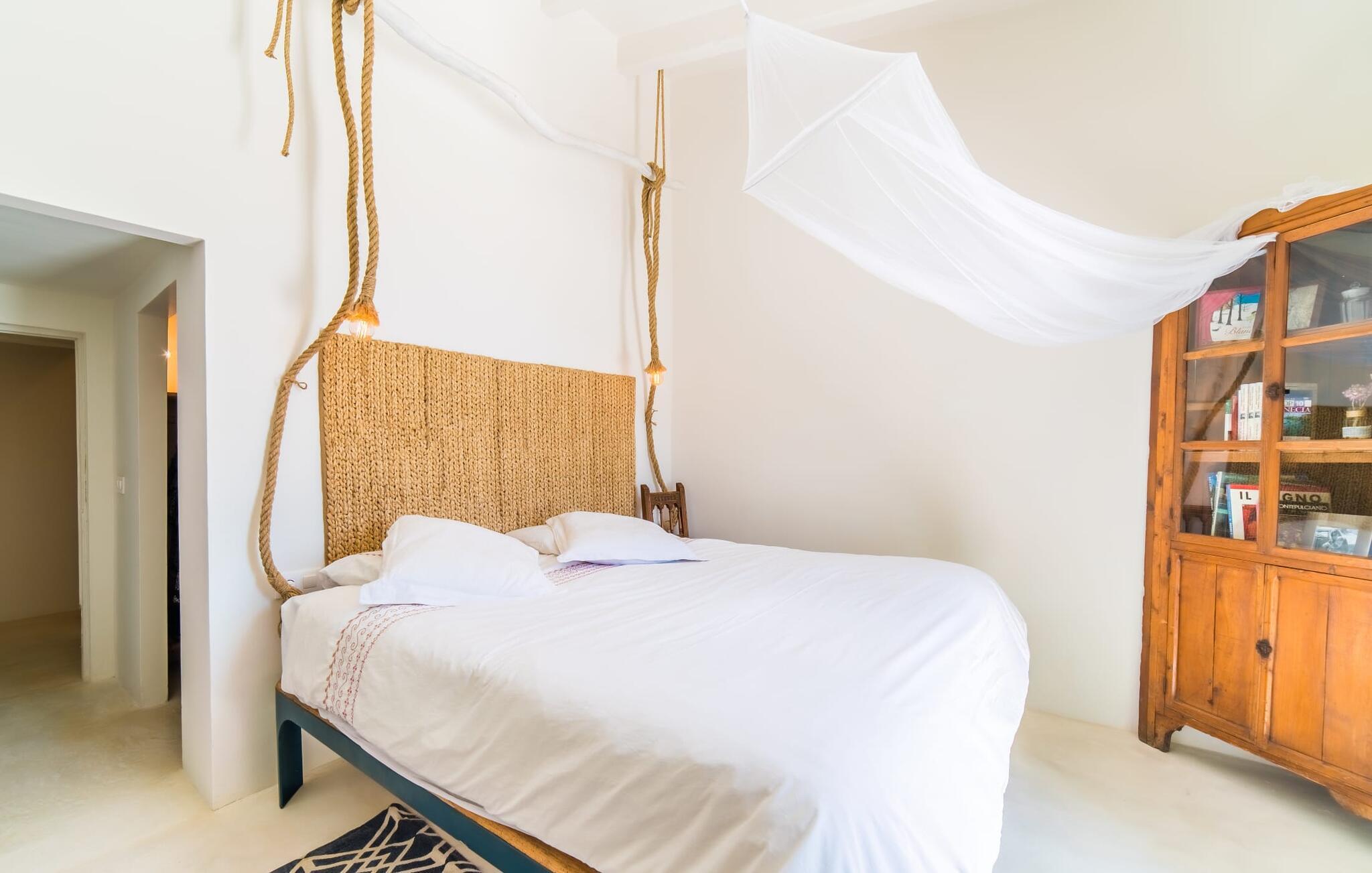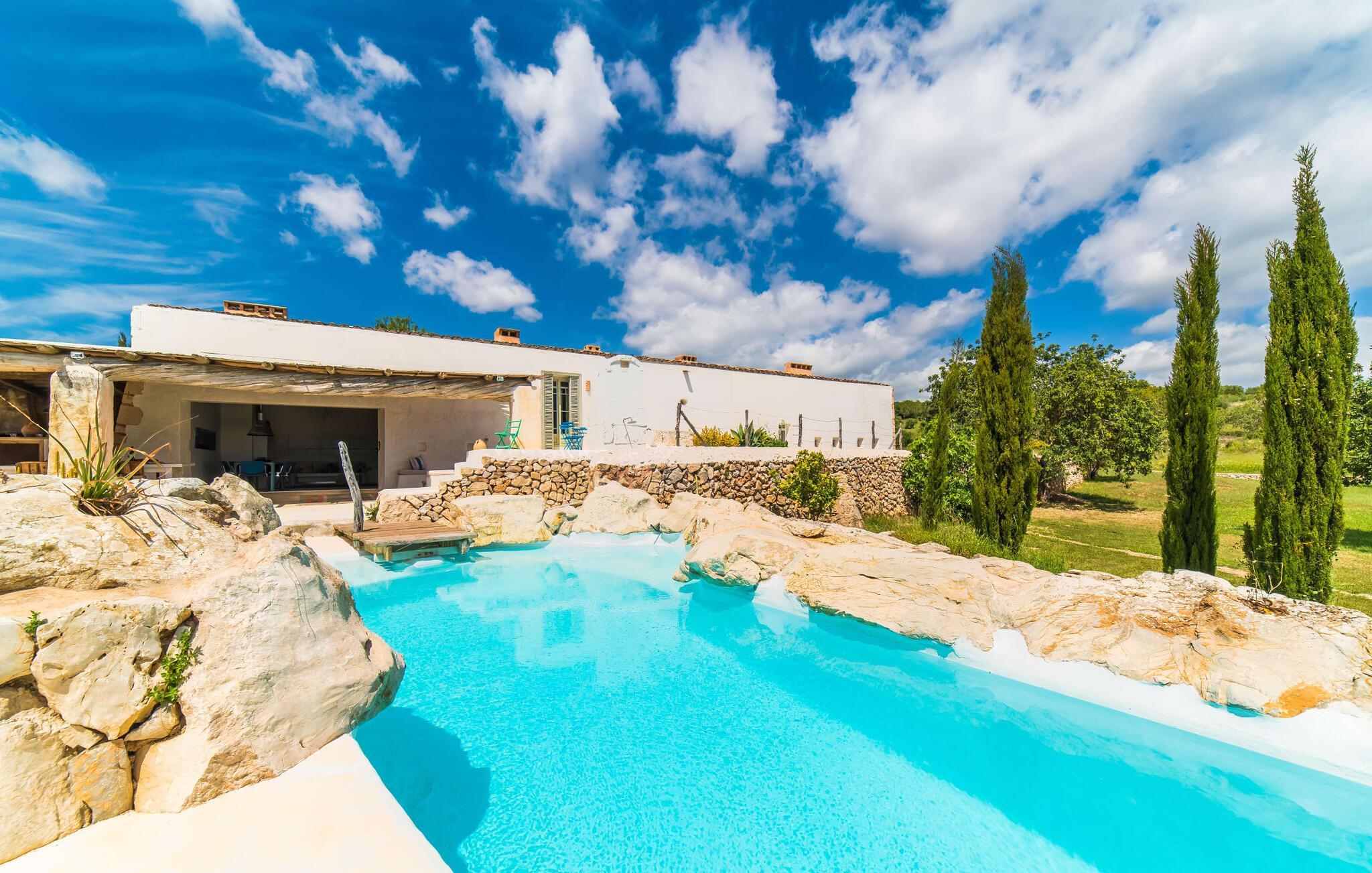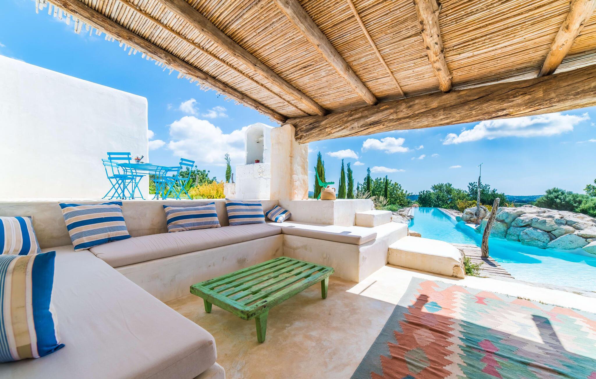 "Alle er kunstnere," sagde den tyske kunstteoretiker Joseph Beuys. Denne ekstraordinære villa er ikke kun tegnet af en af ??dem - her lod ejeren fantasien løbe løbsk både inde og ude og lavede meget af arbejdet selv - den vil helt sikkert også gøre gæsterne, der bor her, til ægte "kunstnere". I hvert fald når det kommer til kunsten at give slip. Den ret aflange "Massari" er designet som en enkelt chill-out-zone, hvor et samfund på seks "kunstnere" kan slippe dampen af ??hjertens lyst. Når familietid ser sådan ud, er det ikke kun de ældre børn, der vil elske det. Hvad andre kalder en pool er her en våd lounge: beplantet med sten og naturlige kampesten! En lavvandszone! En gangbro i træ, hvor du kan dingle dine ben! Liggestole lavet af træ, flet og sten, til glæde for underdele af enhver art! En 29 meter lang svømmekanal, som selv de mest ambitiøse omgangssvømmere vil nyde! En udendørs bruser! Og så er der den træoverdækkede terrasse med polstrede stenbåse i Ibiza-stil og det utrolige udekøkken, perfekt til rustikke frilufts-fingerfood-fester, hvor alle kan samles om den enorme grill og servere sig selv uden bekymringer kan gøres ved at plaske med fedt. Og for at toppe det hele ligger denne eksotiske villa i et toscansk-lignende landskab i absolut fred og ro, med grønne bakker rundt omkring og kun få naboer på afstand... Og så (frivilligt, ifølge Beuys): "Lad dig selv falde, tag en masse små lur, grin meget og bad i måneskin." Det, du ser her, er enten restaureret eller specialfremstillet. Boligrummet, der åbner helt ud til poolterrassen, er en slags kæmpe kunstnerhems med designelementer lavet af muddersten; Sofaarrangementet ser ud over trægangen til poolen og videre. Polstrede alkover og mantels i sandsten, lænestole, høje hvide lofter, tæpper, kunstgenstande og samleobjekter harmonerer godt sammen for at skabe en afslappet og afslappet atmosfære. Kun stearinlys brænder i den dekorative pejs, men villaens varmesystem holder dine fødder varme, når det er nødvendigt. Som kok har du mulighed for at holde øje med alt: lige fra galleriet til køkkenet. Men bliver rygterne for varme, kan du altid gå direkte til spisebordet udenfor. Men hvem kryber sammen med hvem under hvilket myggenet? Bag køkkenet er der tre soveværelser med enten en 1,80 meter bred dobbeltseng eller to enkeltsenge skubbet sammen; to er over for hinanden i samme højde, den anden er et par trin lavere. Selv de unikke eventyrlys har en afslappende følelse, så du kan være sikker på, at dette er et fantastisk sted at hvile og slappe af. En ting, der virkelig skiller sig ud ved dette sted, er de to badeværelser (to af dem en-suite): enten gå gennem en hjertesmykket "garderobegang" til et brusebad, der er bygget lige ind i væggen, med vinduer, der giver naturligt lys til stuen område ; Eller du kan komme ind i det overnaturlige grønne badeværelse, designet til mere end én person, hvor brusevandet kommer direkte fra loftet midt i rummet, og du kan gå ned i det store badekar. Og hvis du ikke har set nok til at stille din appetit på afslapning, så træn dig ind på de smalle trapper og klatre op på loftet på "Massari" - hvis nogen begraver sig i "læsehulen" deroppe, kan du finde dem glemt for en stund . Der er en verden til forskel på det rolige Sant Llorenç des Cardassar (San Lorenzo) og det meget mere turistede Cala Millor – og alligevel ligger de to steder kun få kilometer fra hinanden. Lige meget om du tager afsted fra "Massari" på egen hånd og cykler eller vandrer gennem bakkerne, eller tager på en (guidet) chopper-tur og lader dig vise de bedste badesteder og indimellem bare hopper ind - det er din ferie, så gør hvad du har lyst til. På den anden side supplerer familiedrevne bodegaer i små vinbyer som Petra og Ariany og barerne og restauranterne i Porto Cristo hinanden perfekt – friskfanget fisk smager dobbelt så godt med en lokal hvidvin. Det burde være mere end nok til at støtte dig på den moderat vanskelige vandretur forbi olivenlunde og fåre-græsgange til det 473 meter høje Muntanya de Calicant, hvor du vil se, at selv Mallorca selv blev skabt af en sand kunstner. Det harmoniske samspil mellem blå, grønne og jordfarver virker som farveterapi, indtil du føler, at du er en del af et kæmpe kunstværk. "Massari", en imponerende villa med en kunstnerisk sjæl og farverige møbler og dekoration, ligger blandt grønne bakker i den østlige del af øen og alligevel kun 3 km fra det rolige Sant Llorenç med sine typiske mallorcanske butikker og restauranter, supermarked og pengeautomater . Den smukke havn i Porto Cristo inviterer dig også til at udforske, mens strandene S'Illot, Sa Coma og Cala Millor (ca. 20 minutter væk i bil) byder på vidunderlige bademuligheder i krystalklart vand. Dette er et Fincallorca feriehus.