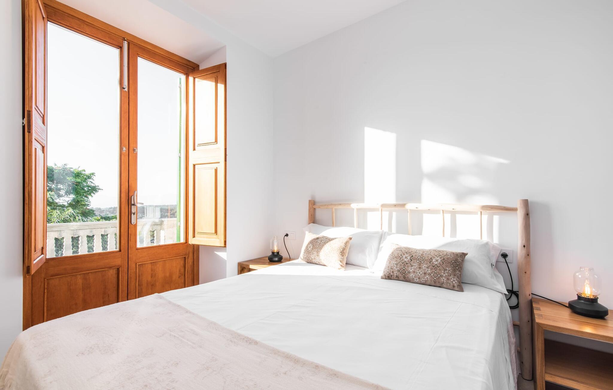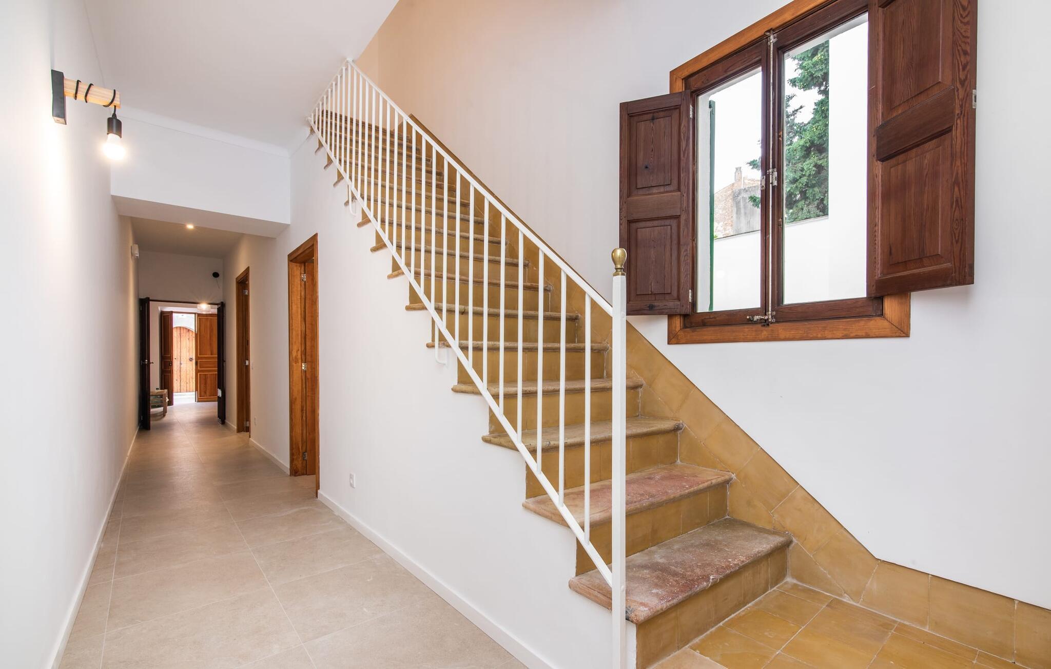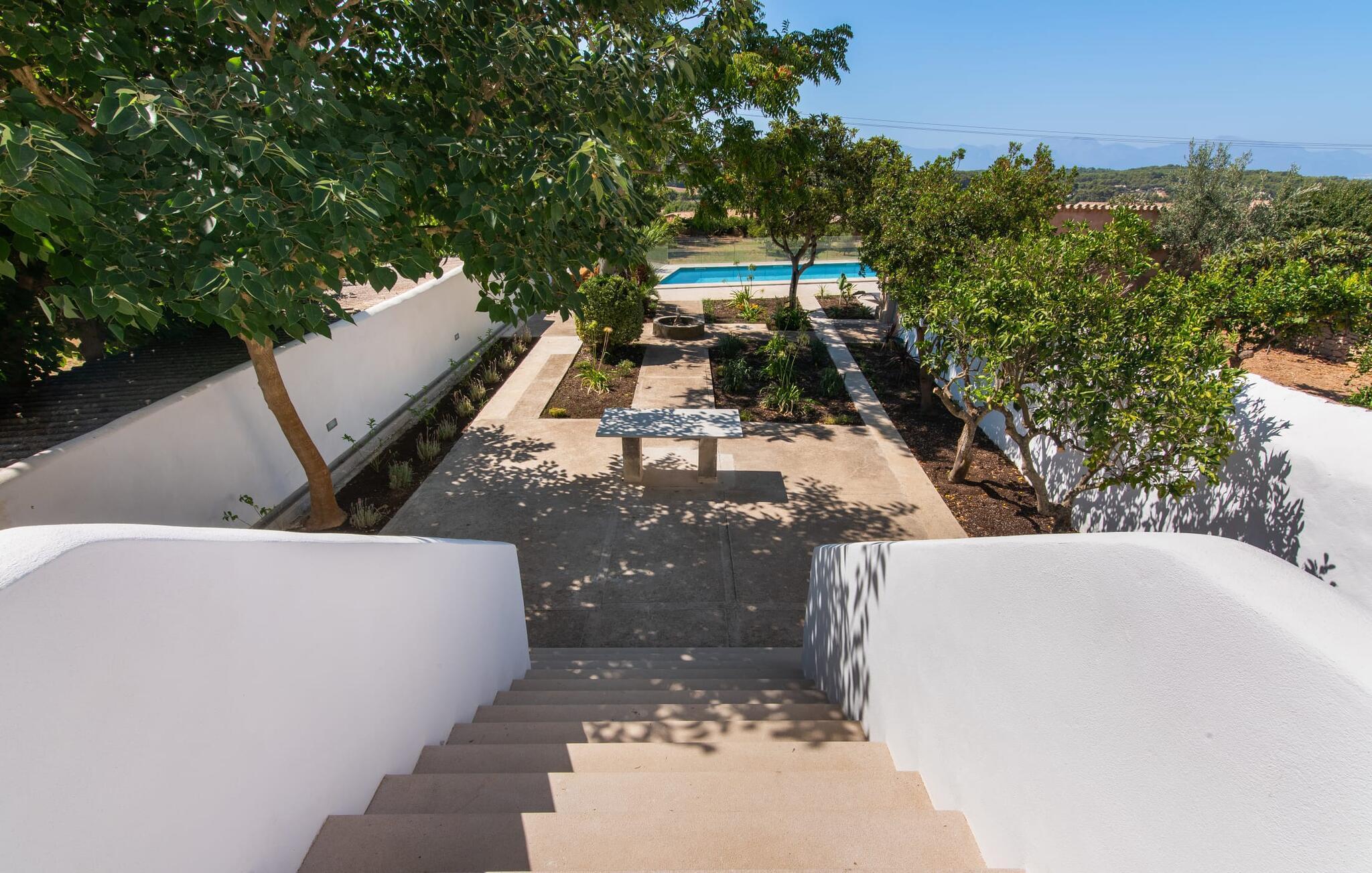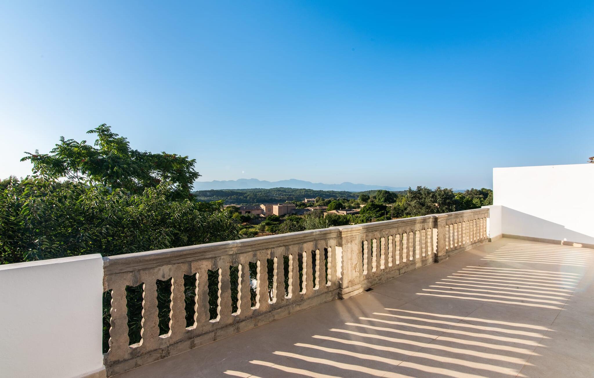 Rækkehuset "Mater Randa" er en helt speciel feriebolig for op til 12 gæster på Mallorca. Det hørte tidligere til kirken og byder efter omfattende renovering på lyse, venlige lokaler og moderne boligkomfort. Takket være sin beliggenhed i udkanten af den rolige bjerglandsby Randa, kan du nyde en fantastisk udsigt over landskabet og så langt som til Tramuntana-bjergene fra det rummelige poolområde eller balkonen på øverste etage. Sommerhuset drives af Mater Fonden. Den økologiske køkkenhave i den nederste del af ejendommen passes af organisationens protegéer. På denne måde, mens du nyder en afslappende ferie i rolige omgivelser med familie eller venner, støtter du et værdifuldt socialt projekt på øen. Den åbne opholdsstue i rækkehusets stueetage består af opholds- og spisestue samt amerikansk køkken. En glasdør fører fra stuen til den bageste gårdhave med pool. Derudover er der på dette niveau to dobbeltværelser med en-suite badeværelser og et separat badeværelse. Stueetagen har ekstra brede indgange og et kørestolsvenligt badeværelse med bruser. En trappe fører til øverste etage. Det huser endnu en stue, 4 soveværelser med dobbeltsenge med en-suite badeværelser og et separat badeværelse. To af soveområderne har også direkte udgang til altan terrassen. Du er velkommen til at vælge dit yndlingssted for de smukke solnedgange! Feriehuset ligger i den rolige bjerglandsby Randa, 4 km nord for byen Llucmajor med gode indkøbsmuligheder. Det er 25 minutters kørsel til Palma og mindre end 30 minutter til de naturlige strande Sa Rápita og Estrenc. Golfbanerne Son Antem og Son Gual ligger ca. 12 km væk. Dette er et Fincallorca feriehus.