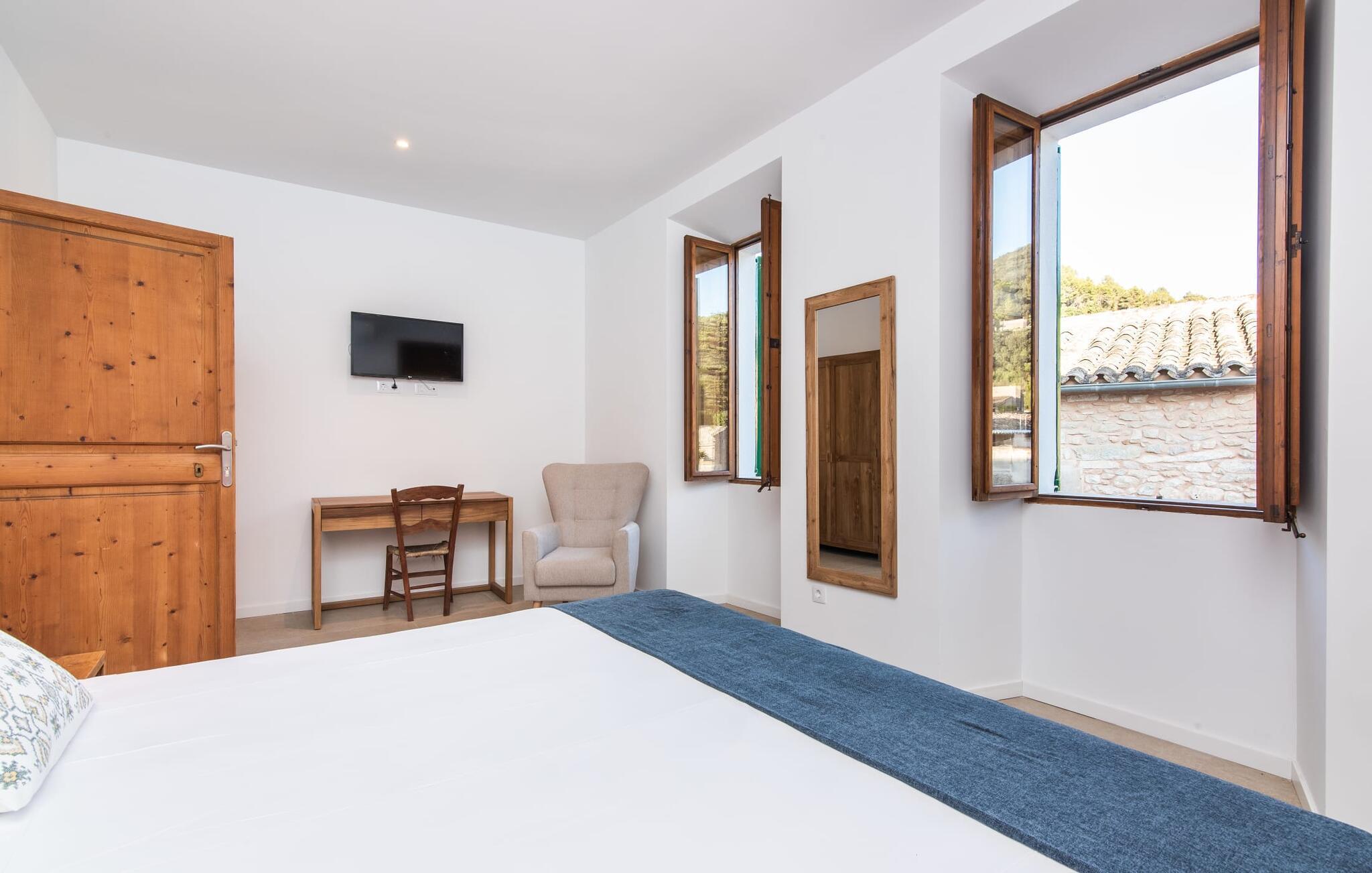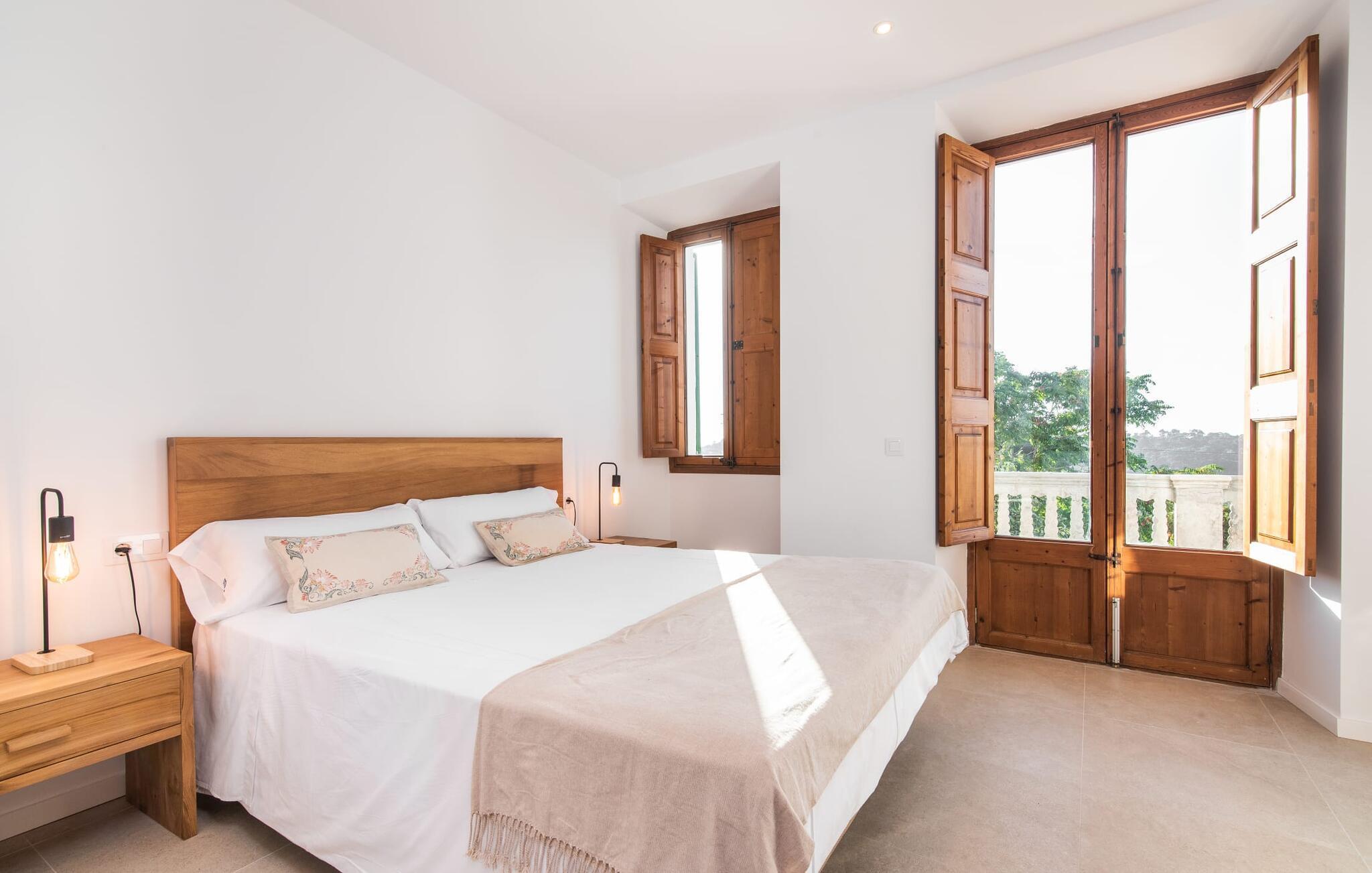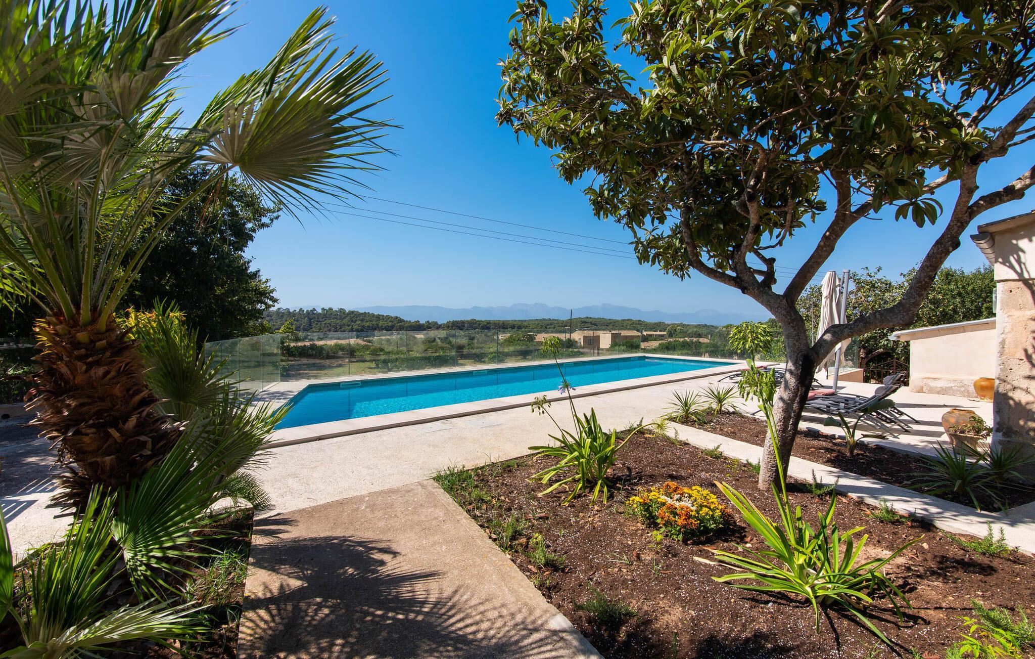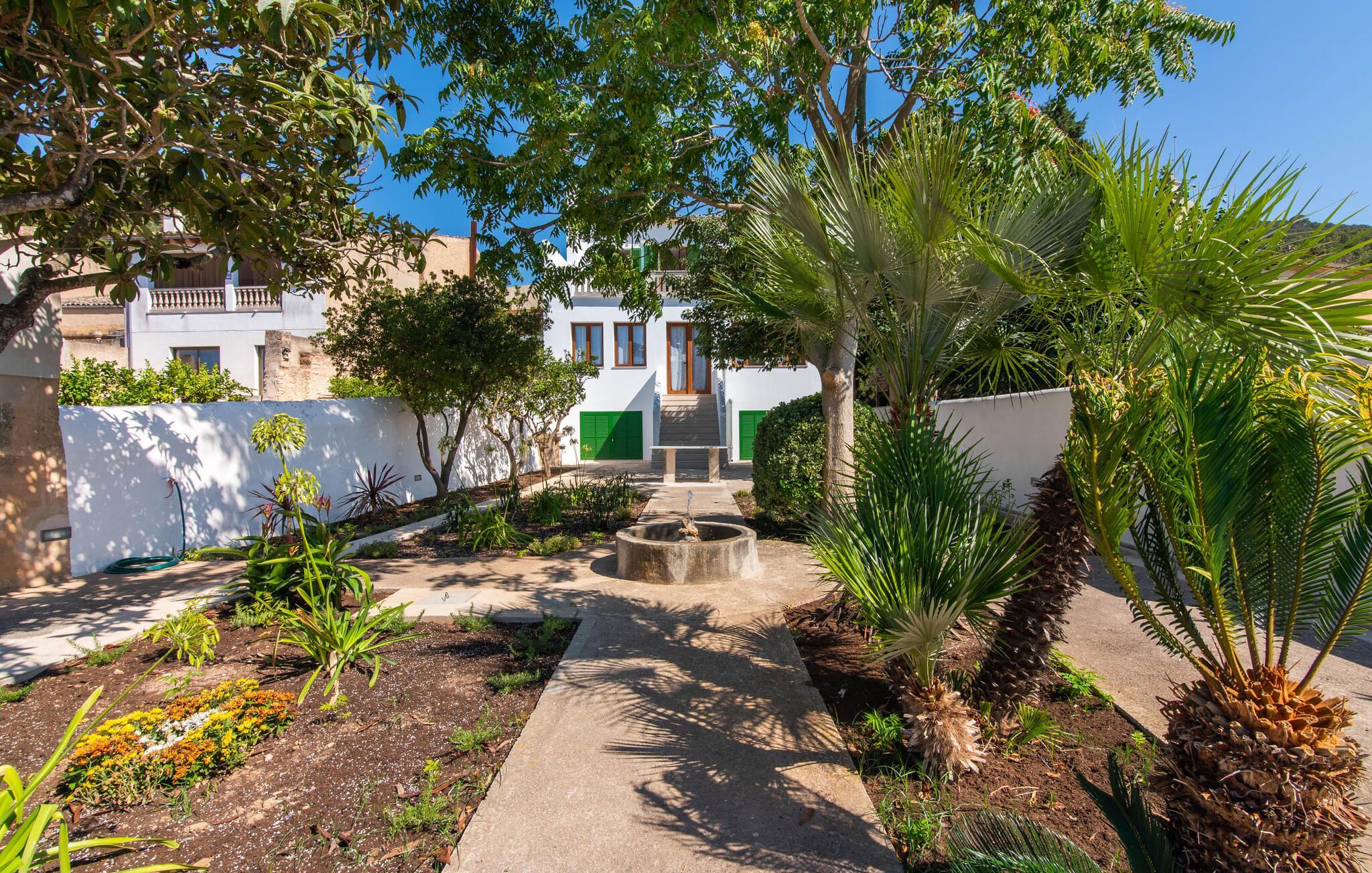 Rækkehuset "Mater Randa" er en helt speciel feriebolig for op til 12 gæster på Mallorca. Det hørte tidligere til kirken og byder efter omfattende renovering på lyse, venlige lokaler og moderne boligkomfort. Takket være sin beliggenhed i udkanten af den rolige bjerglandsby Randa, kan du nyde en fantastisk udsigt over landskabet og så langt som til Tramuntana-bjergene fra det rummelige poolområde eller balkonen på øverste etage. Sommerhuset drives af Mater Fonden. Den økologiske køkkenhave i den nederste del af ejendommen passes af organisationens protegéer. På denne måde, mens du nyder en afslappende ferie i rolige omgivelser med familie eller venner, støtter du et værdifuldt socialt projekt på øen. Den åbne opholdsstue i rækkehusets stueetage består af opholds- og spisestue samt amerikansk køkken. En glasdør fører fra stuen til den bageste gårdhave med pool. Derudover er der på dette niveau to dobbeltværelser med en-suite badeværelser og et separat badeværelse. Stueetagen har ekstra brede indgange og et kørestolsvenligt badeværelse med bruser. En trappe fører til øverste etage. Det huser endnu en stue, 4 soveværelser med dobbeltsenge med en-suite badeværelser og et separat badeværelse. To af soveområderne har også direkte udgang til altan terrassen. Du er velkommen til at vælge dit yndlingssted for de smukke solnedgange! Feriehuset ligger i den rolige bjerglandsby Randa, 4 km nord for byen Llucmajor med gode indkøbsmuligheder. Det er 25 minutters kørsel til Palma og mindre end 30 minutter til de naturlige strande Sa Rápita og Estrenc. Golfbanerne Son Antem og Son Gual ligger ca. 12 km væk. Dette er et Fincallorca feriehus.