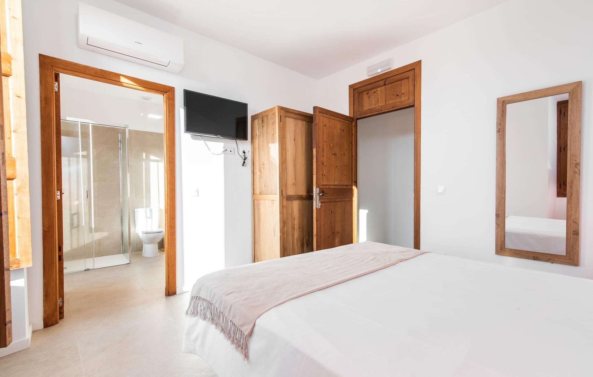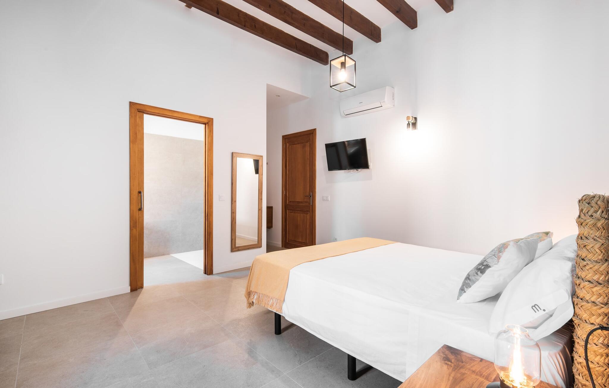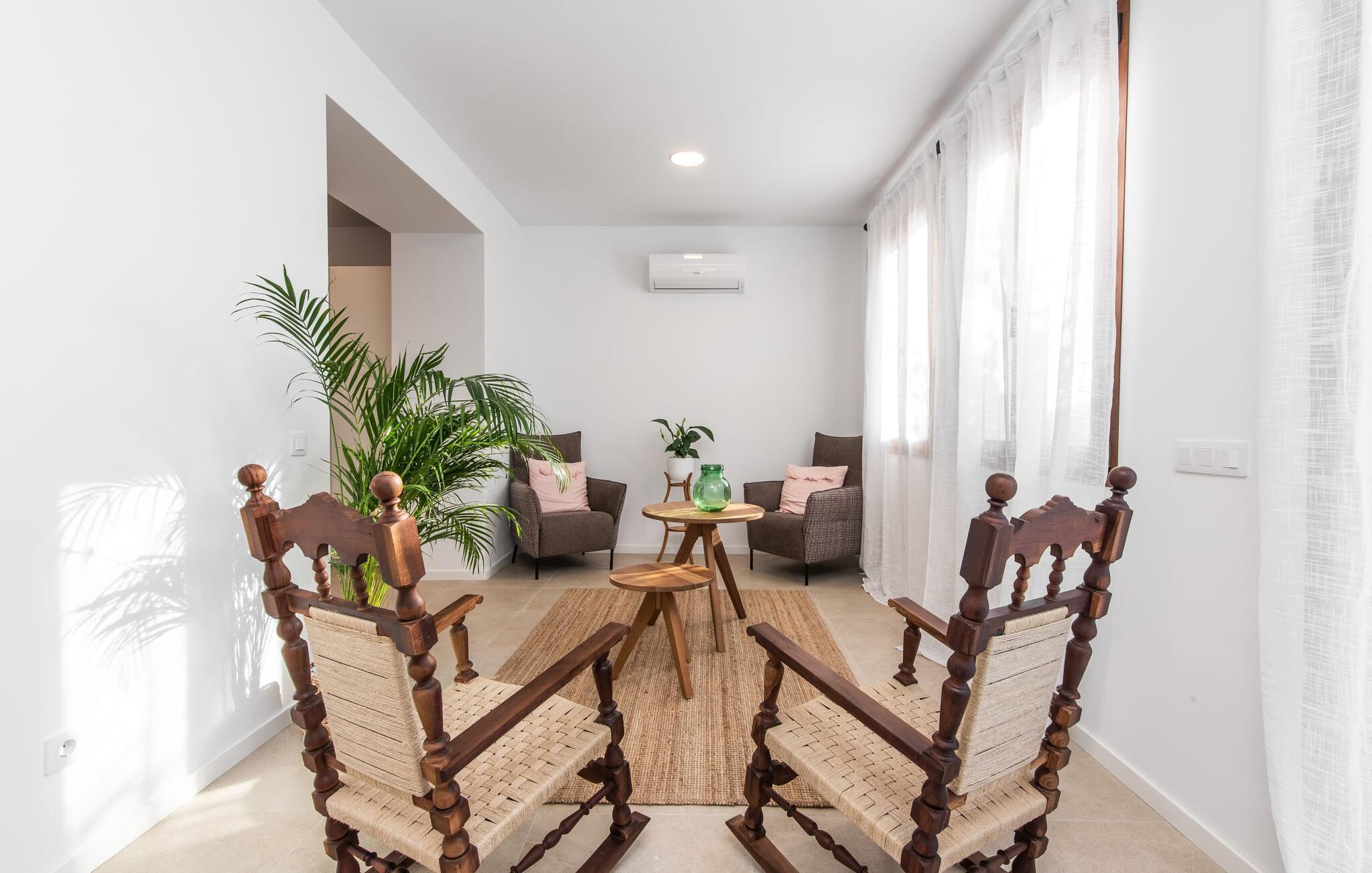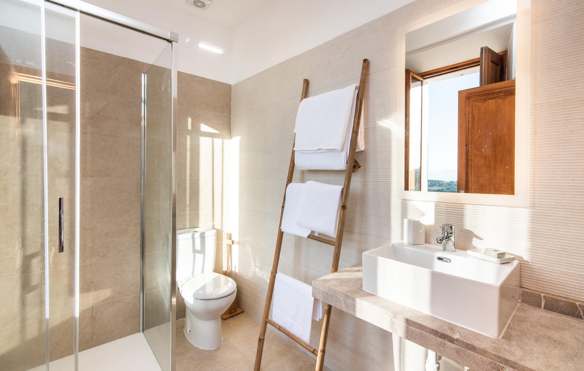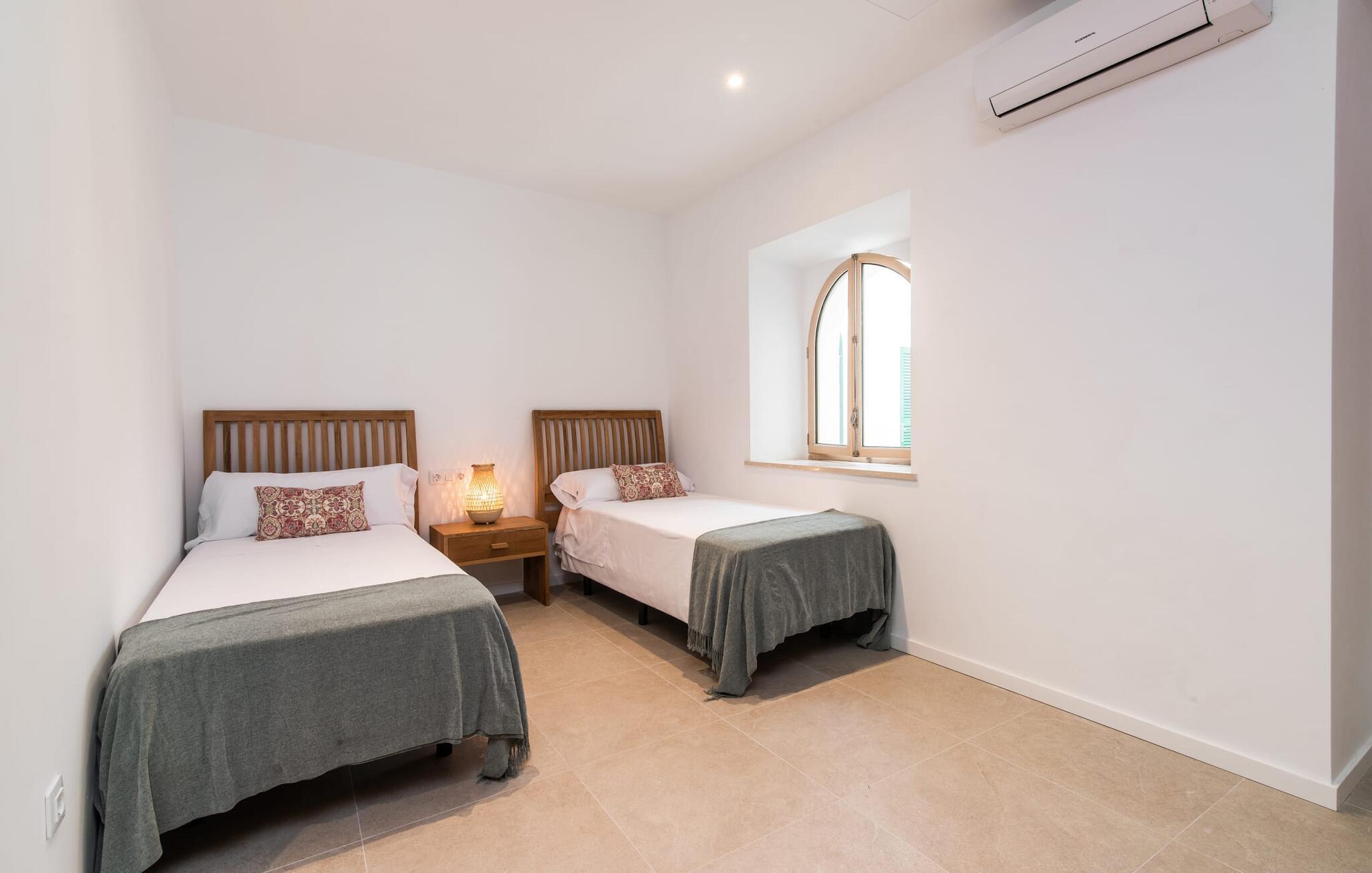 Rækkehuset "Mater Randa" er en helt speciel feriebolig for op til 12 gæster på Mallorca. Det hørte tidligere til kirken og byder efter omfattende renovering på lyse, venlige lokaler og moderne boligkomfort. Takket være sin beliggenhed i udkanten af den rolige bjerglandsby Randa, kan du nyde en fantastisk udsigt over landskabet og så langt som til Tramuntana-bjergene fra det rummelige poolområde eller balkonen på øverste etage. Sommerhuset drives af Mater Fonden. Den økologiske køkkenhave i den nederste del af ejendommen passes af organisationens protegéer. På denne måde, mens du nyder en afslappende ferie i rolige omgivelser med familie eller venner, støtter du et værdifuldt socialt projekt på øen. Den åbne opholdsstue i rækkehusets stueetage består af opholds- og spisestue samt amerikansk køkken. En glasdør fører fra stuen til den bageste gårdhave med pool. Derudover er der på dette niveau to dobbeltværelser med en-suite badeværelser og et separat badeværelse. Stueetagen har ekstra brede indgange og et kørestolsvenligt badeværelse med bruser. En trappe fører til øverste etage. Det huser endnu en stue, 4 soveværelser med dobbeltsenge med en-suite badeværelser og et separat badeværelse. To af soveområderne har også direkte udgang til altan terrassen. Du er velkommen til at vælge dit yndlingssted for de smukke solnedgange! Feriehuset ligger i den rolige bjerglandsby Randa, 4 km nord for byen Llucmajor med gode indkøbsmuligheder. Det er 25 minutters kørsel til Palma og mindre end 30 minutter til de naturlige strande Sa Rápita og Estrenc. Golfbanerne Son Antem og Son Gual ligger ca. 12 km væk. Dette er et Fincallorca feriehus.