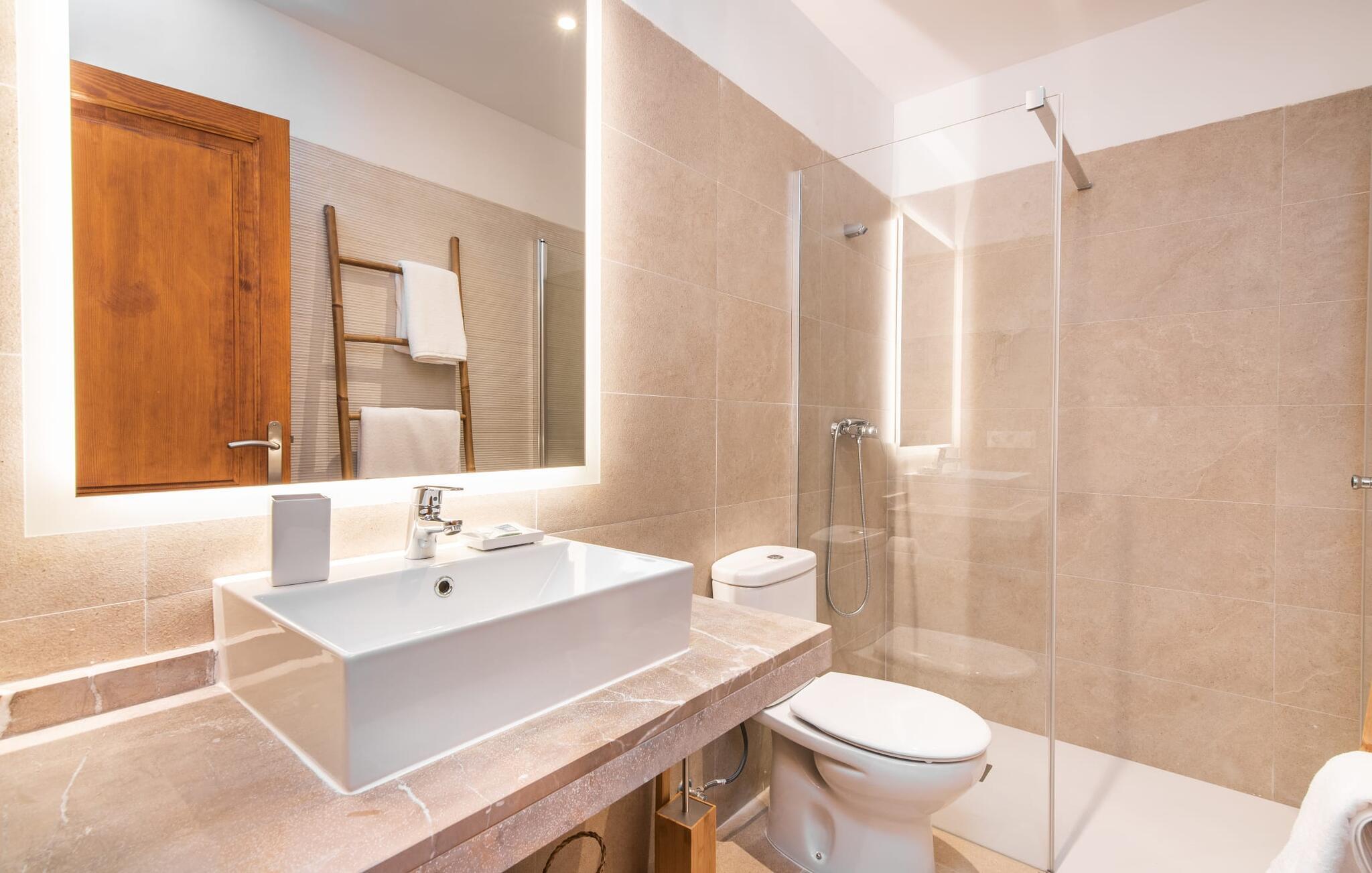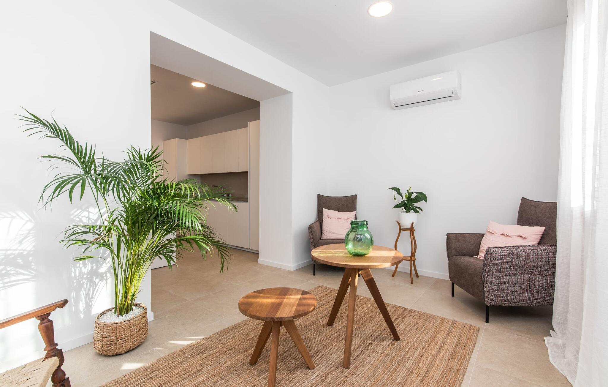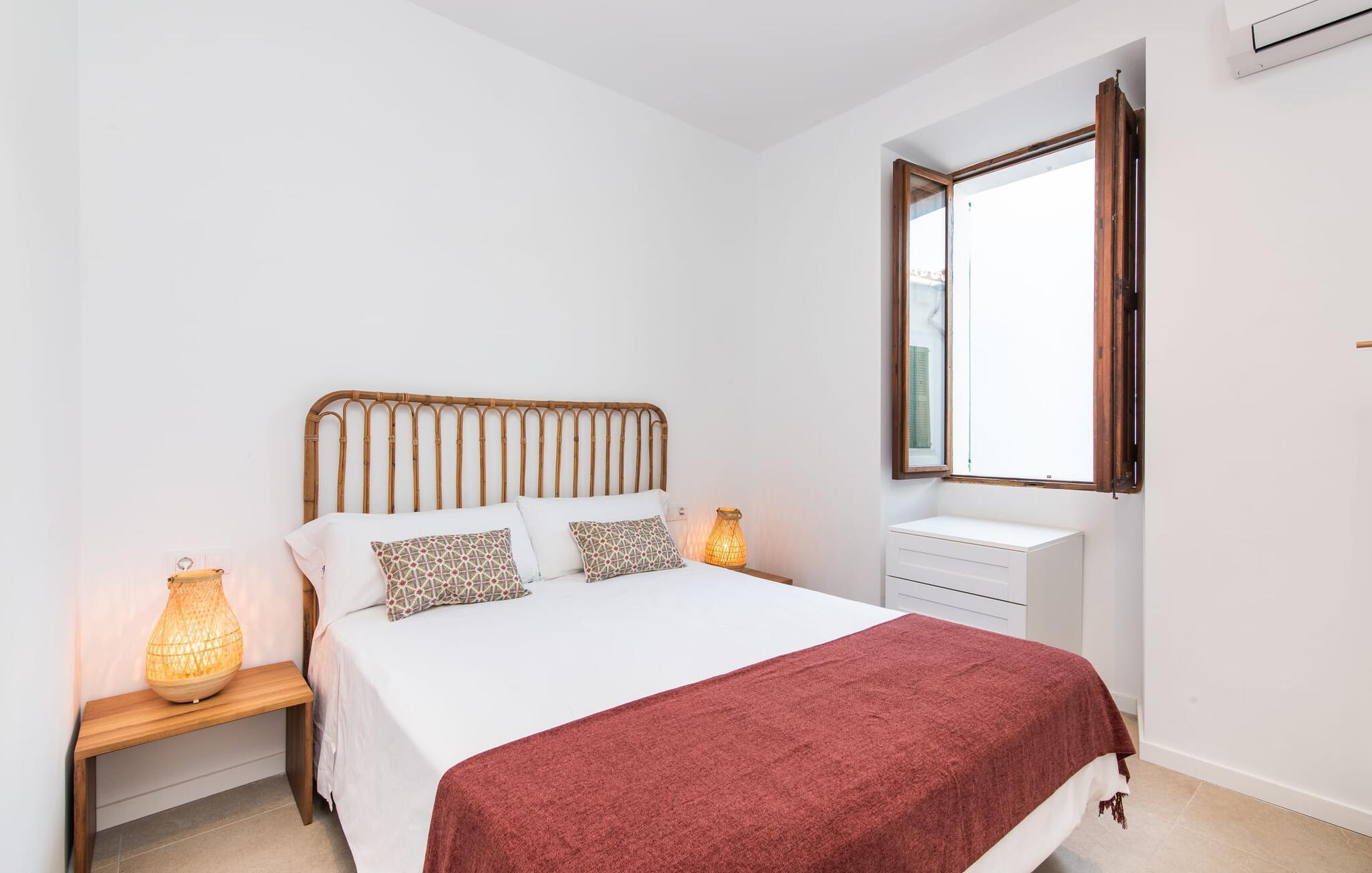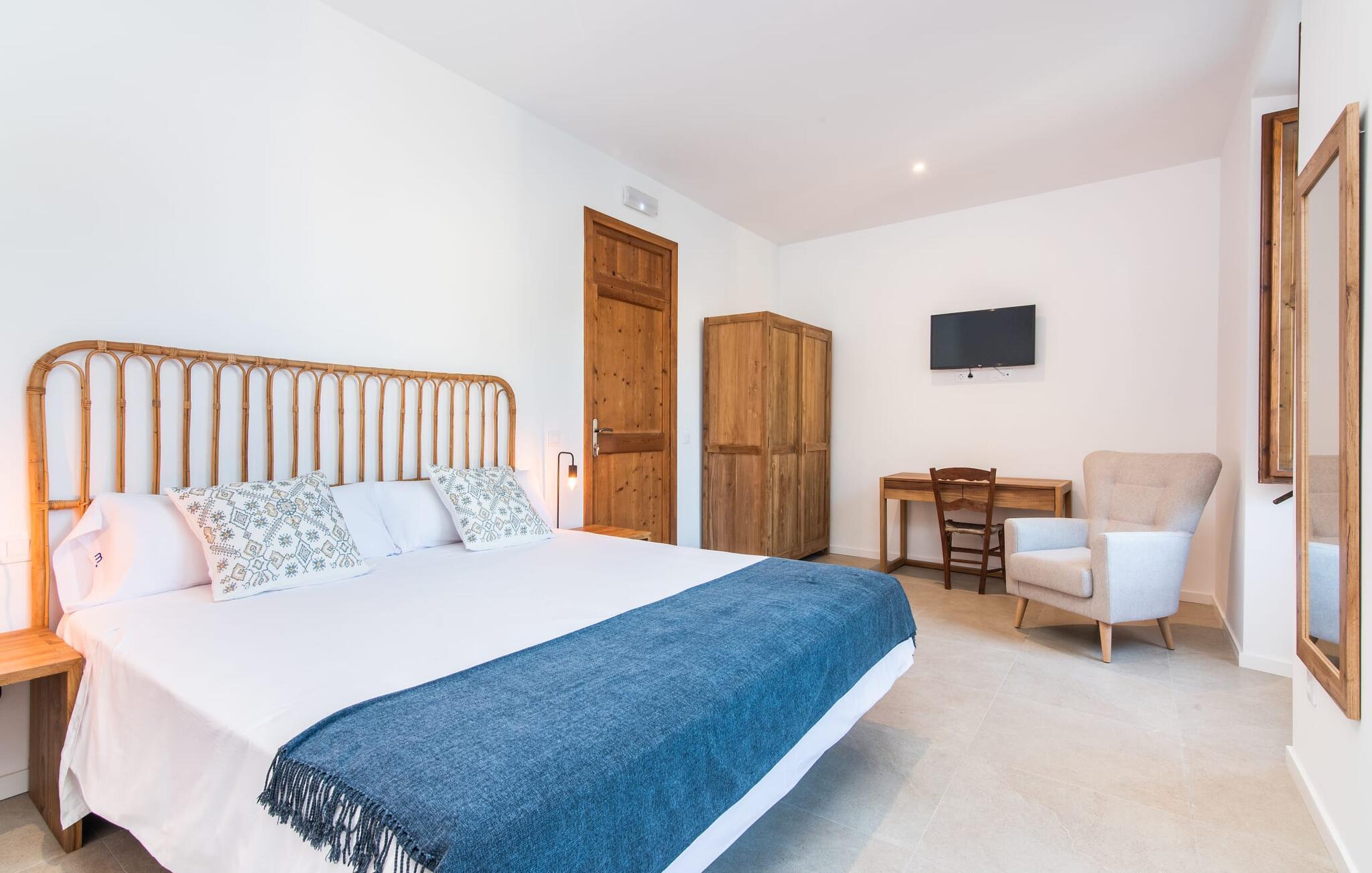 Rækkehuset "Mater Randa" er en helt speciel feriebolig for op til 12 gæster på Mallorca. Det hørte tidligere til kirken og byder efter omfattende renovering på lyse, venlige lokaler og moderne boligkomfort. Takket være sin beliggenhed i udkanten af den rolige bjerglandsby Randa, kan du nyde en fantastisk udsigt over landskabet og så langt som til Tramuntana-bjergene fra det rummelige poolområde eller balkonen på øverste etage. Sommerhuset drives af Mater Fonden. Den økologiske køkkenhave i den nederste del af ejendommen passes af organisationens protegéer. På denne måde, mens du nyder en afslappende ferie i rolige omgivelser med familie eller venner, støtter du et værdifuldt socialt projekt på øen. Den åbne opholdsstue i rækkehusets stueetage består af opholds- og spisestue samt amerikansk køkken. En glasdør fører fra stuen til den bageste gårdhave med pool. Derudover er der på dette niveau to dobbeltværelser med en-suite badeværelser og et separat badeværelse. Stueetagen har ekstra brede indgange og et kørestolsvenligt badeværelse med bruser. En trappe fører til øverste etage. Det huser endnu en stue, 4 soveværelser med dobbeltsenge med en-suite badeværelser og et separat badeværelse. To af soveområderne har også direkte udgang til altan terrassen. Du er velkommen til at vælge dit yndlingssted for de smukke solnedgange! Feriehuset ligger i den rolige bjerglandsby Randa, 4 km nord for byen Llucmajor med gode indkøbsmuligheder. Det er 25 minutters kørsel til Palma og mindre end 30 minutter til de naturlige strande Sa Rápita og Estrenc. Golfbanerne Son Antem og Son Gual ligger ca. 12 km væk. Dette er et Fincallorca feriehus.