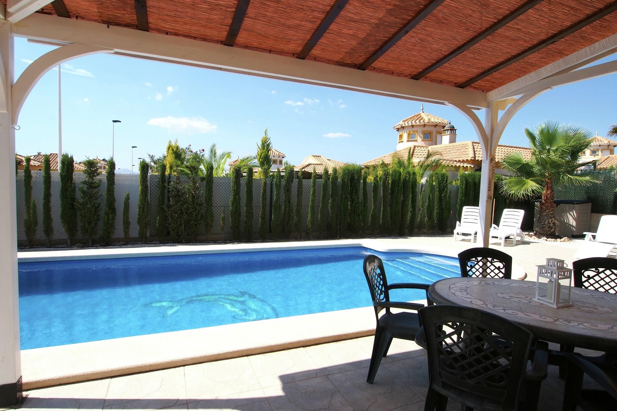 Denne fritliggende villa er beliggende i det attraktive og velholdte Country Club resort, på den rolige og prisvenlige Costa Cálida. Boligen er udstyret med en rummelig skrånende privat swimmingpool og en stue med smart-tv. Ideel til ferie med familie og venner. 250 meter væk finder du et Spar-supermarked, tennisbaner, en restaurant med terrasse og en spillehal. Busser til Mazarrón, Puerto de Mazarrón, Bolnuevo og strandene kører fra centrum af Country Club-resortet. Puerto de Mazarrón byder på vandsport og smukke bådture langs kysten. Der er en smuk cykelsti gennem Country Club, der fører gennem et fredet naturreservat til den smukke kyst. Den gamle havneby Cartagena (35 km), Murcia (65 km) og mange smukke kystbyer ligger tæt på og er mere end et besøg værd. Smukke byer som Málaga, Sevilla, Granada, Cordoba og Almería er inden for køreafstand, samt beskyttede naturområder som Sierra Espuña og Sierra de las Moreras. Der er også flere golfbaner, gokartbaner, et vandland, indkøbscenter og underholdningssteder i nærheden. Soveværelserne har aircondition, og det øverste soveværelse har eget badeværelse med balkon og udsigt over resortet og bjergene. Villaen er udstyret med en solafvisende carport og en dejlig have med masser af privatliv og komfortable møbler. Derudover rummer villaen en vaskemaskine og en grill.