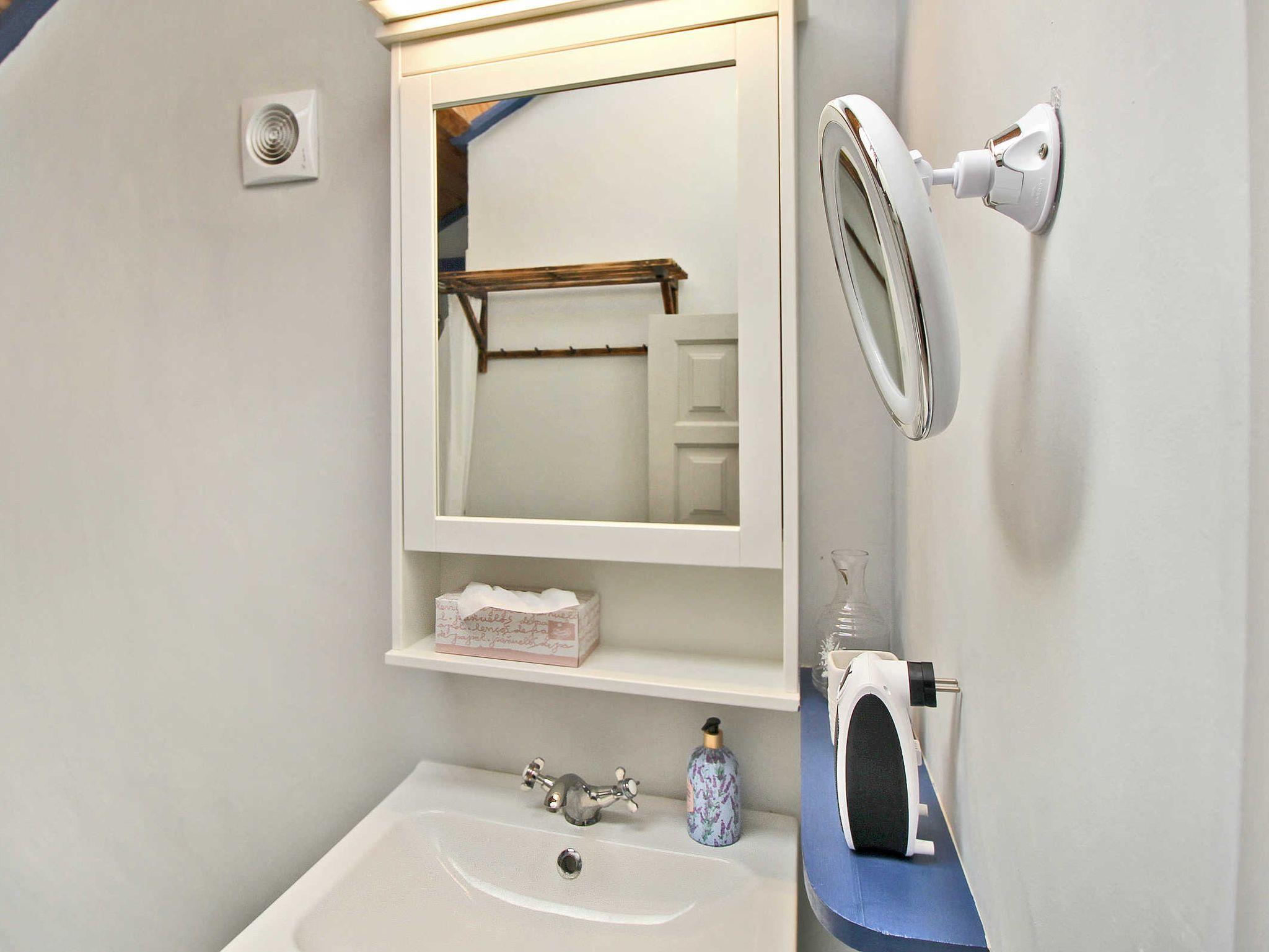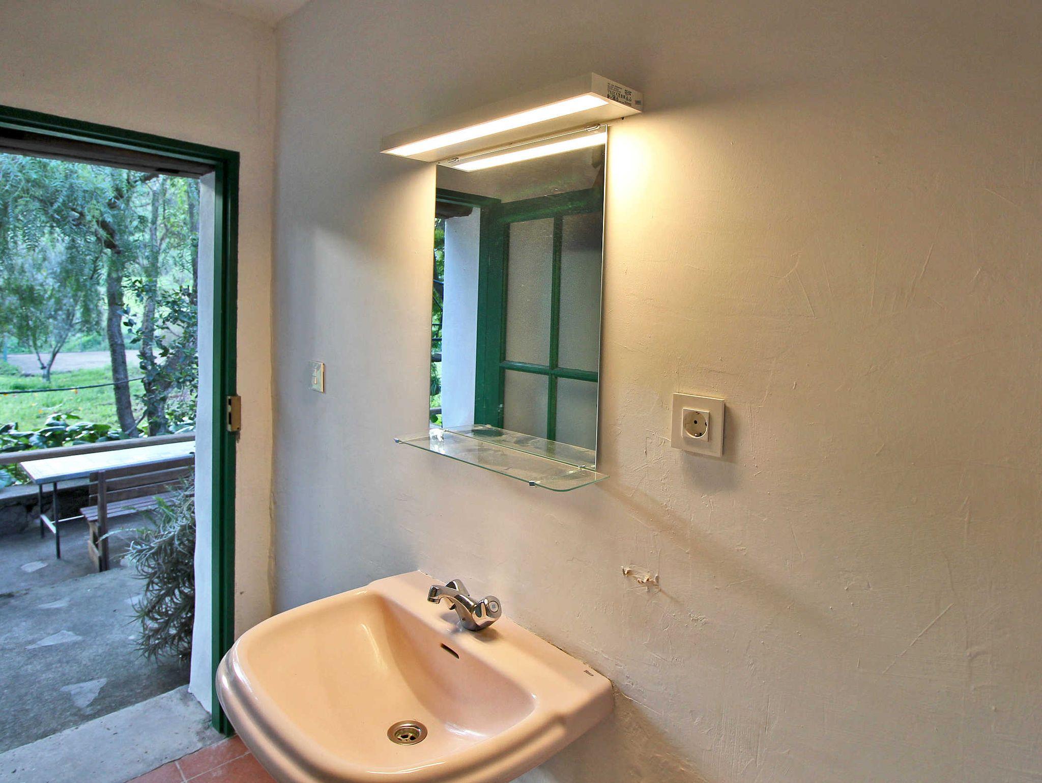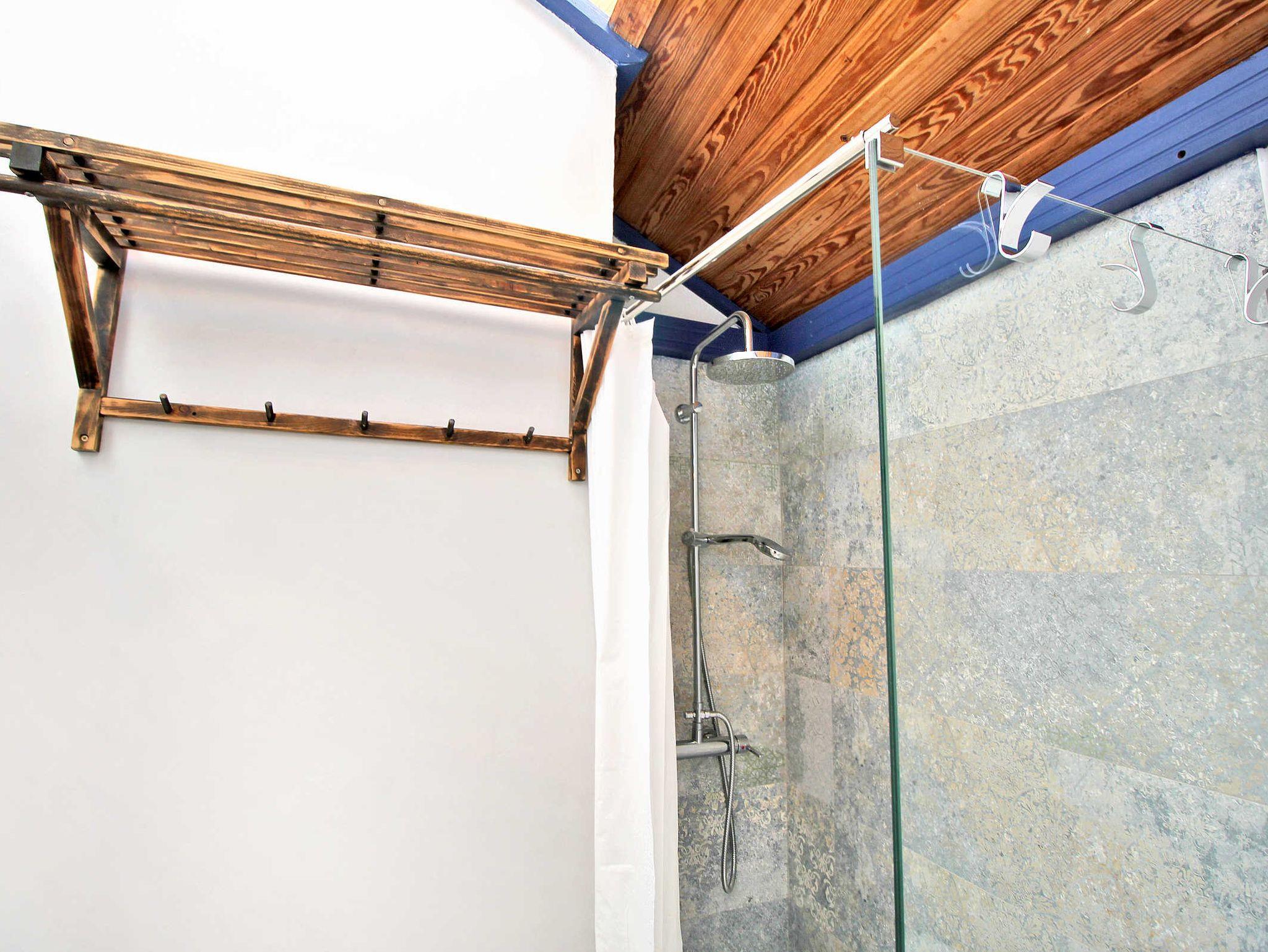 Neben der Küche befindet sich eine Nische, in der sich die Waschmaschine, ein Trockner und Putzmittel, etc befinden. Auch zum kleinen Duschbad geht es durch die Küche. Neben einem Schnellheizgerät, Vergrößerungsspiegel, Duschkabine, Waschbecken, Toilette und etwas Stauraum gibt es hier nur wenig Platz. Anzumerken ist an dieser Stelle, dass es auf der oberen Etage, wo sich die beiden Hauptschlafzimmer befinden, kein Badezimmer gibt.