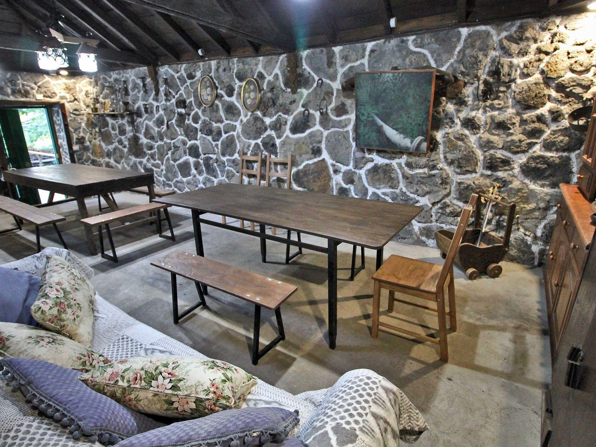 Im Haus selbst befindet sich ein rustikaler Speiseraum, den Sie nutzen können, ebenso wie den bereits erwähnten Esstisch im neuen Hausteil. Die Küche ist nicht sehr groß, ist aber mit Backofen, Mikrowelle und diversen Kochutensilien gut ausgestattet, nur gibt es keinen Geschirrspüler. Hier bietet ein hoher Tisch Platz für zwei Personen.